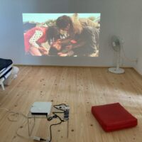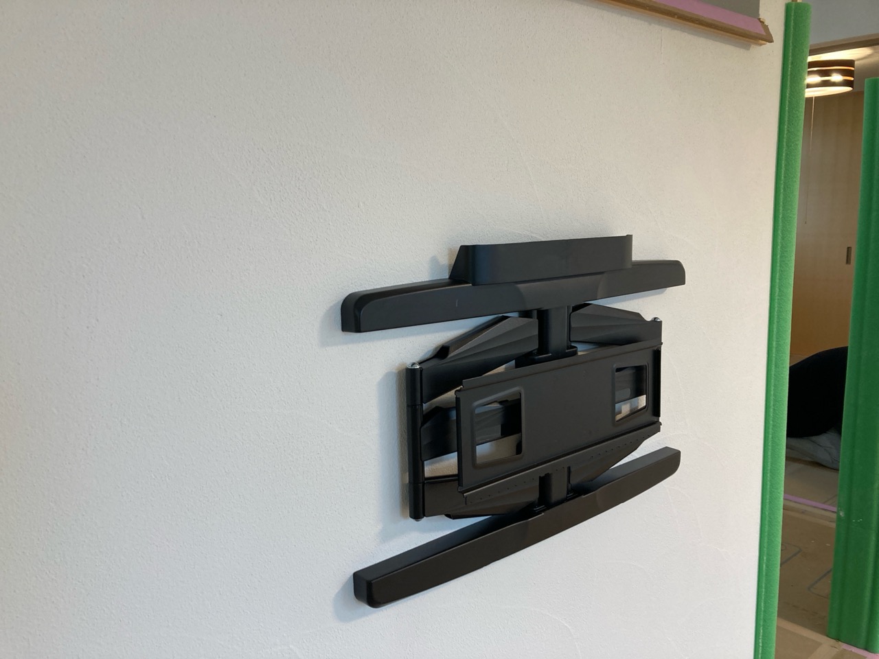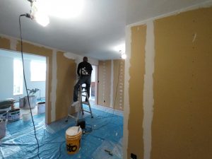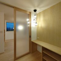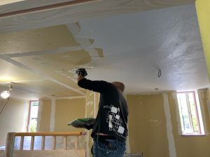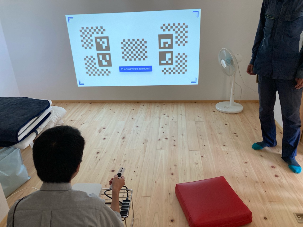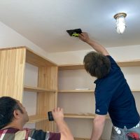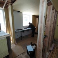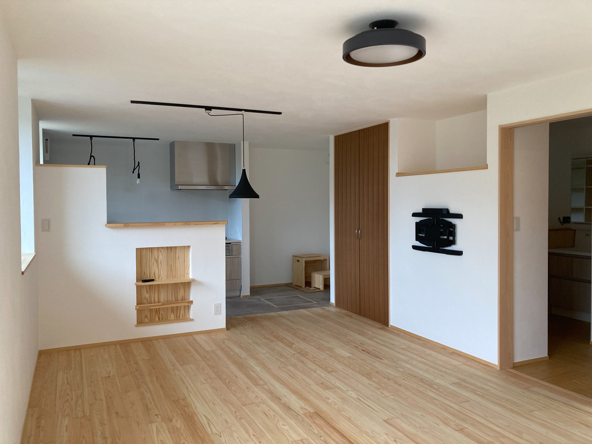 南世帯ではy様は主としてテレビは設置せず、漆喰壁にプロジェクタで投影する事で映像を見る、というスタイルをとられます。これであれば見たい場所に機器を移動して見たい時に見たい角度で観賞する事ができるという生活スタイルです。極端な話天井に投影して仰向けに寝ながらでも見る事ができるのです。工事中、照明器具のお打ち合わせの時に、シーリングライトではなくペンダントライトを室の中央を避けて縁の方に配置するのをご希望されていたのはこのためです、とうかがった時には目からウロコの思いでした。なんか、時代も変わってきたな・・・としみじみ。