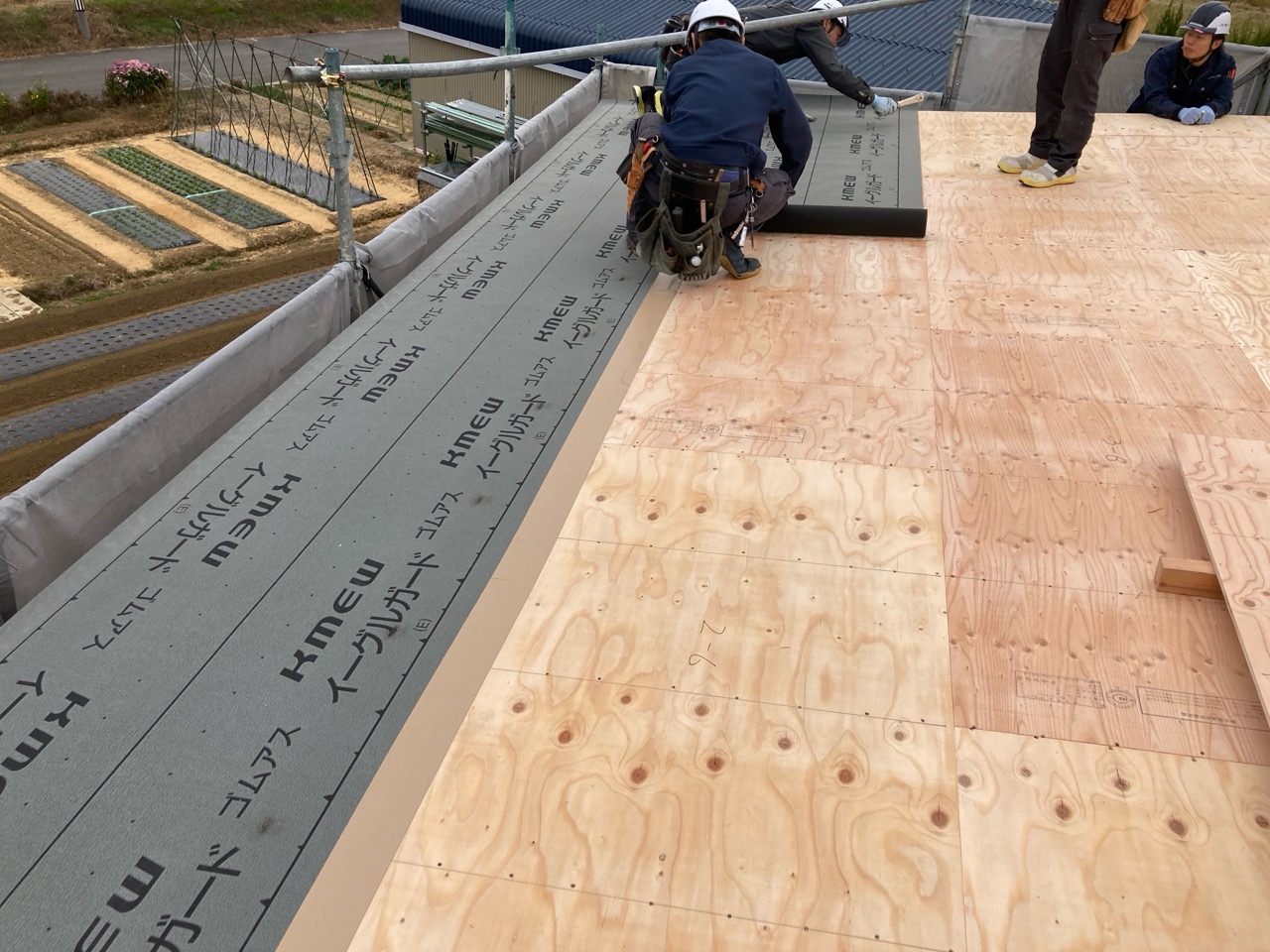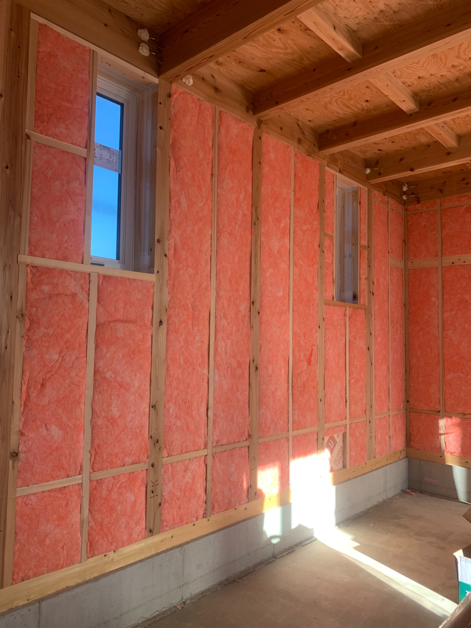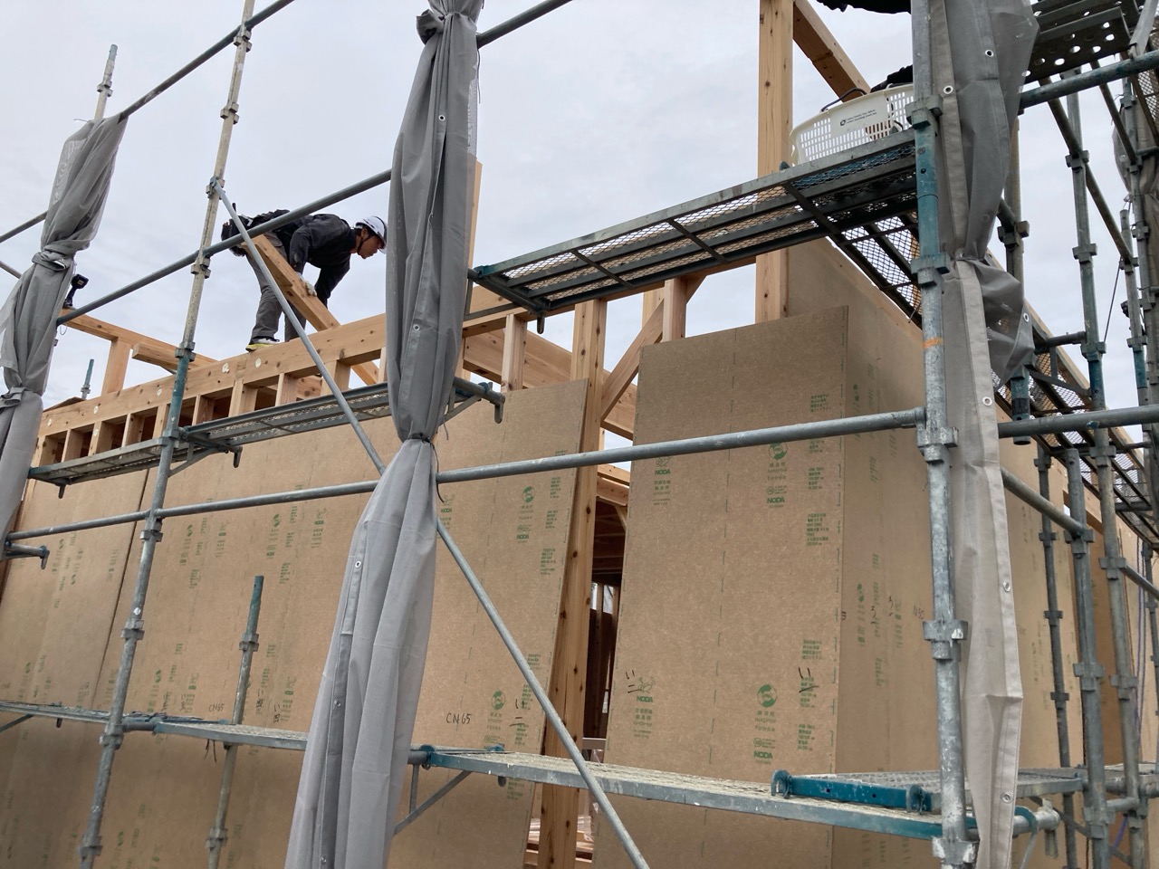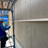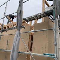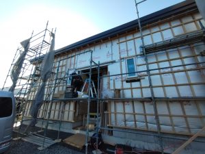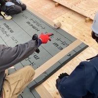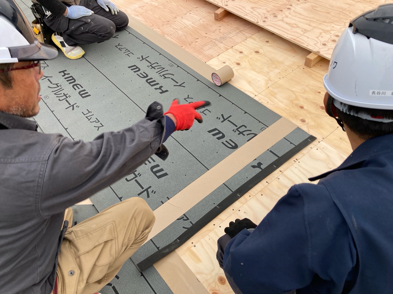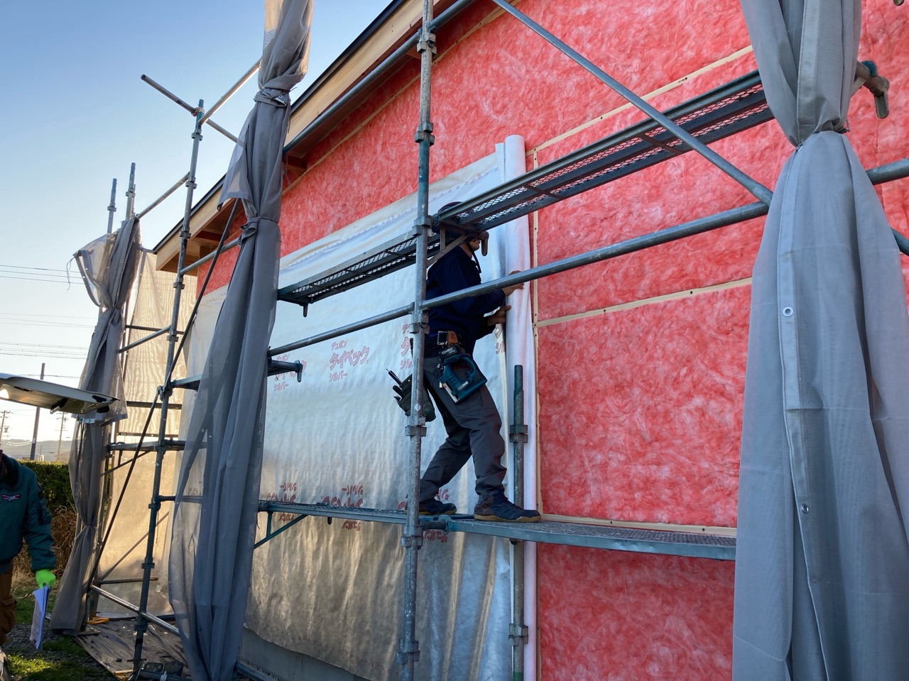 躯体の充填断熱、付加断熱の敷設と防水シートの敷設も着々と進んでいます。