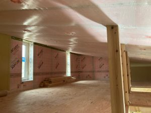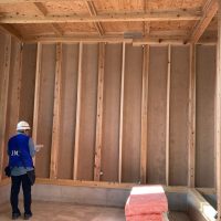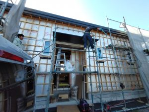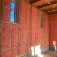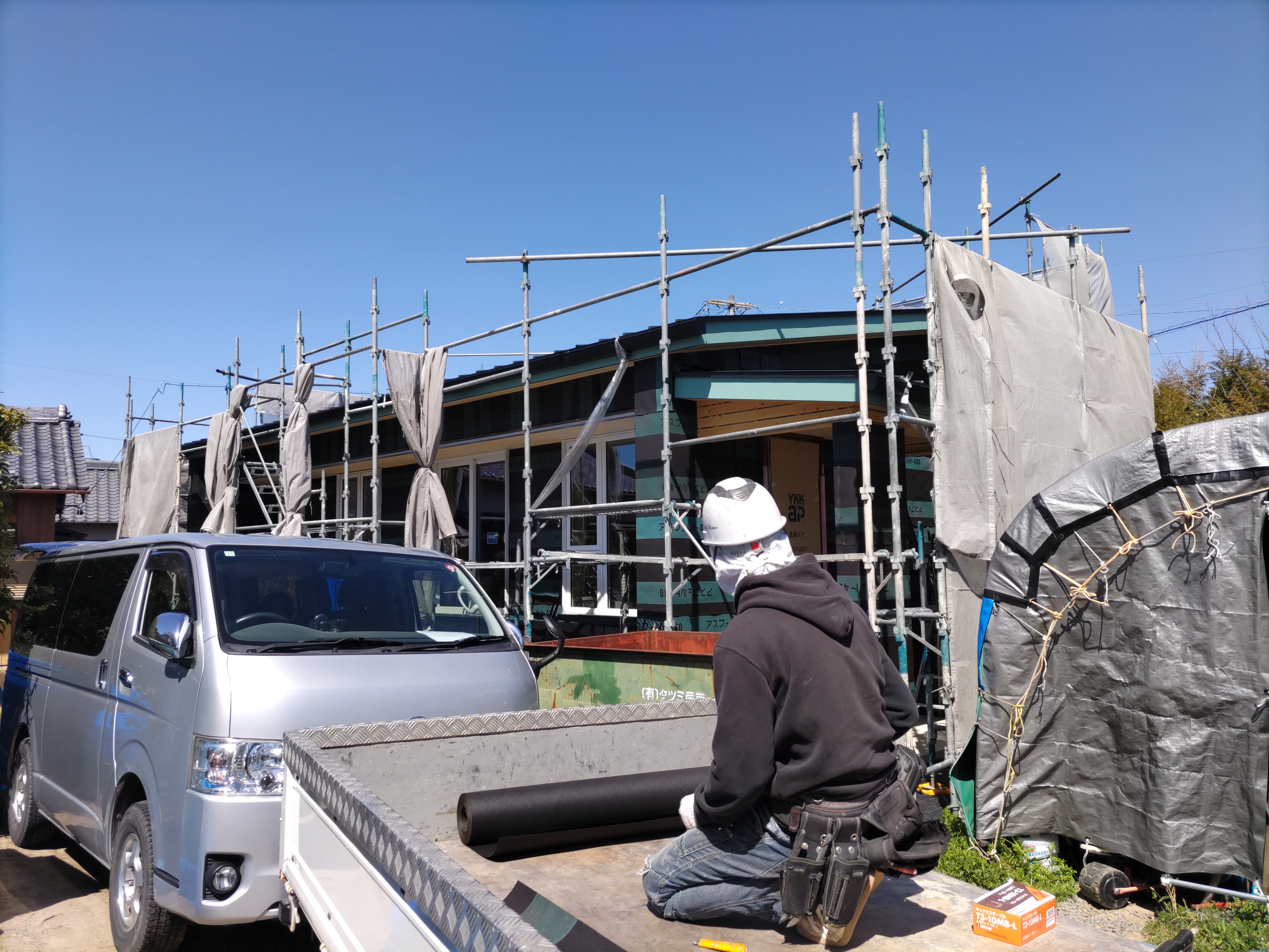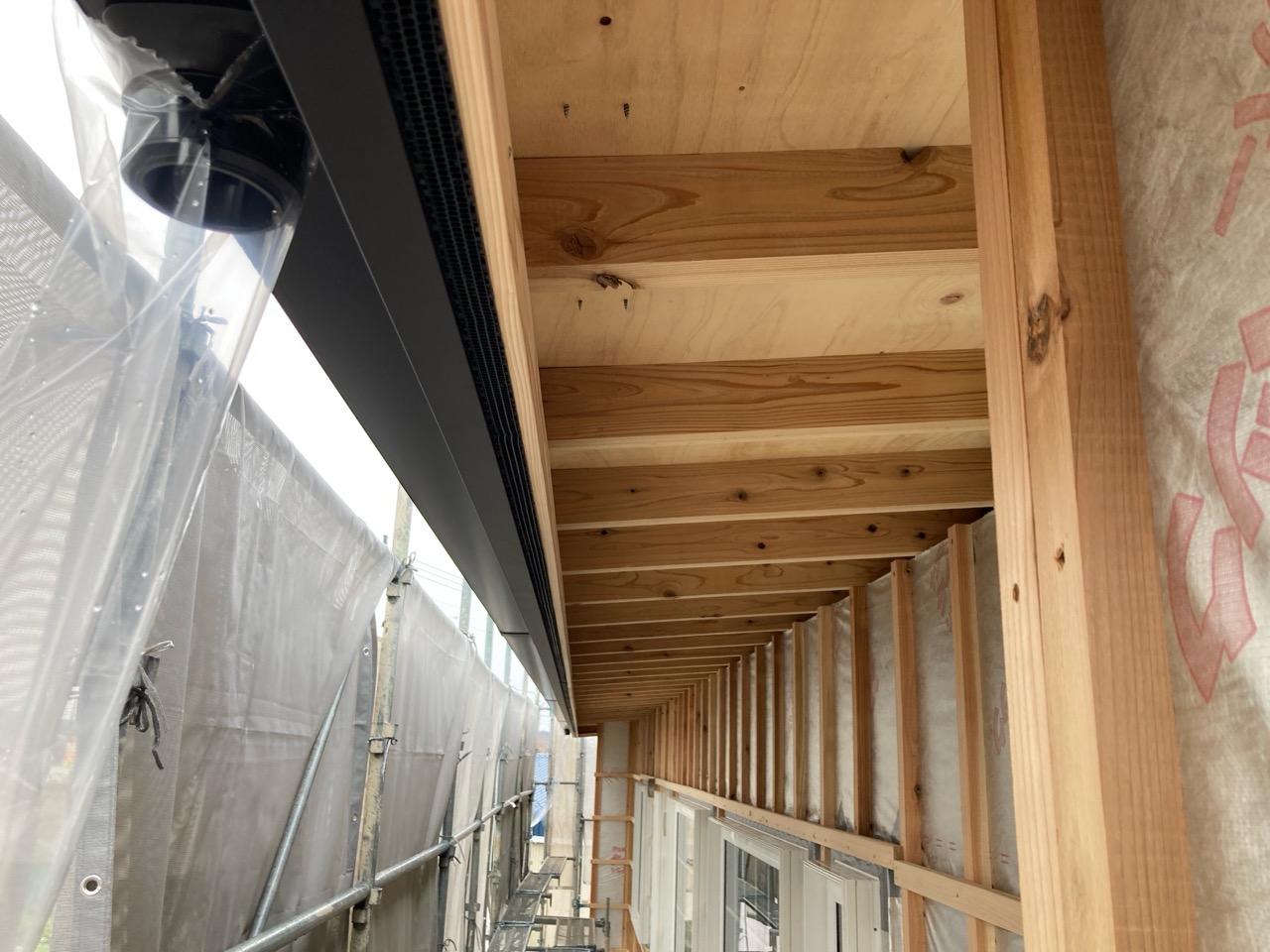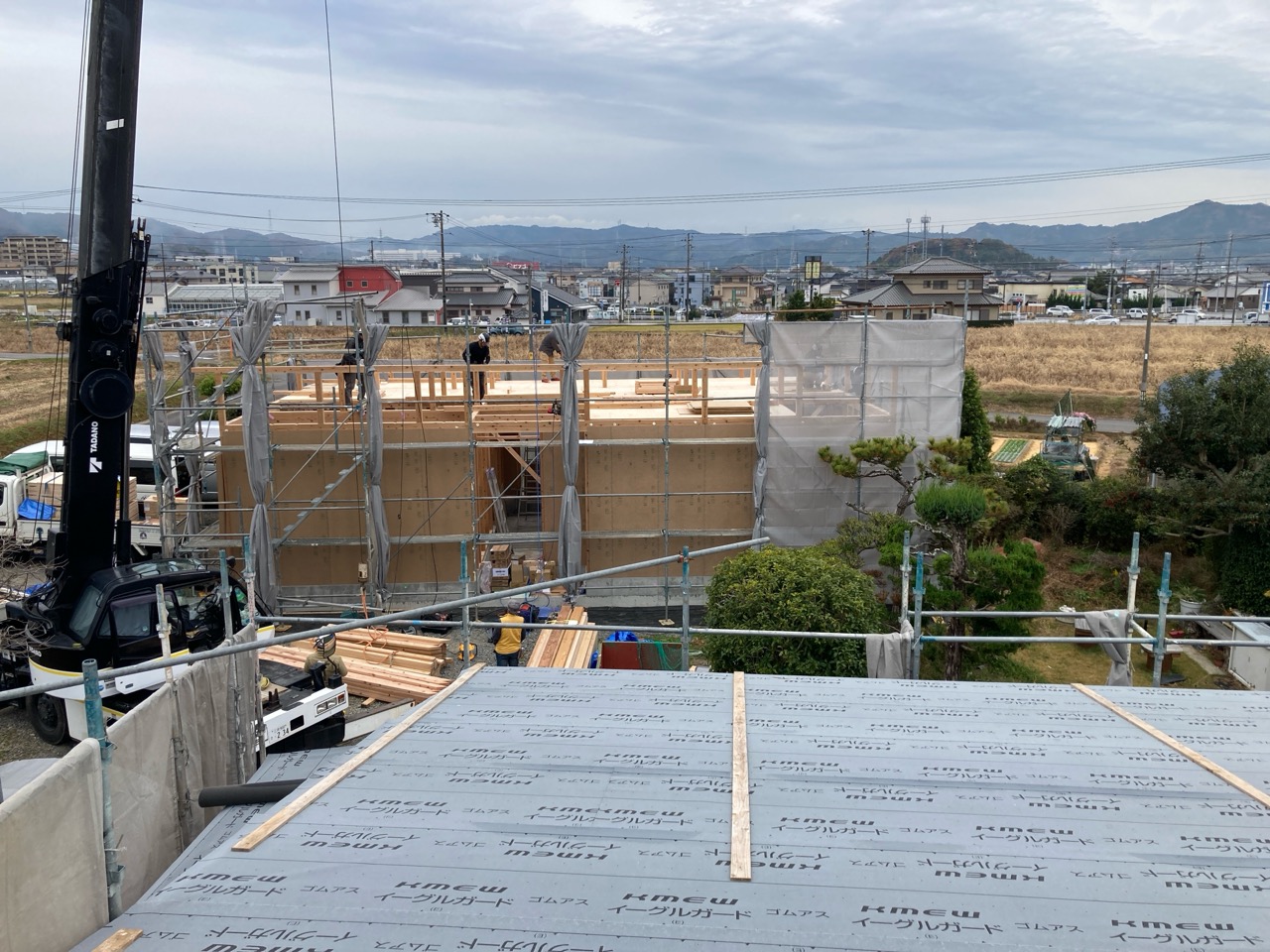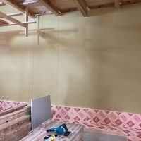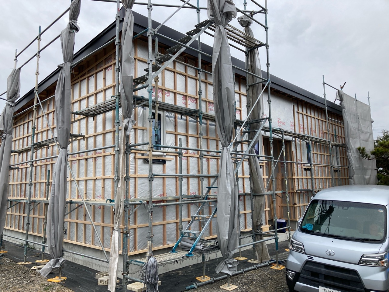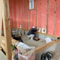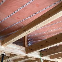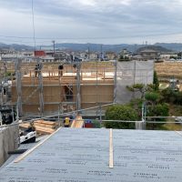 躯体の充填断熱、付加断熱の敷設と防水シートの敷設も着々と進んでいます。