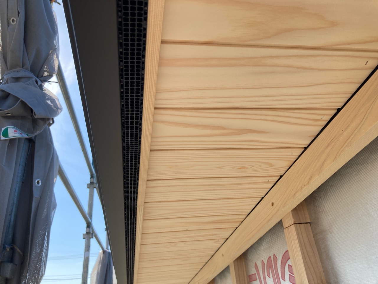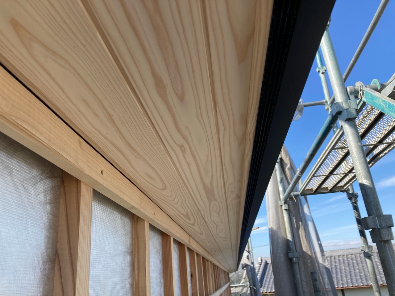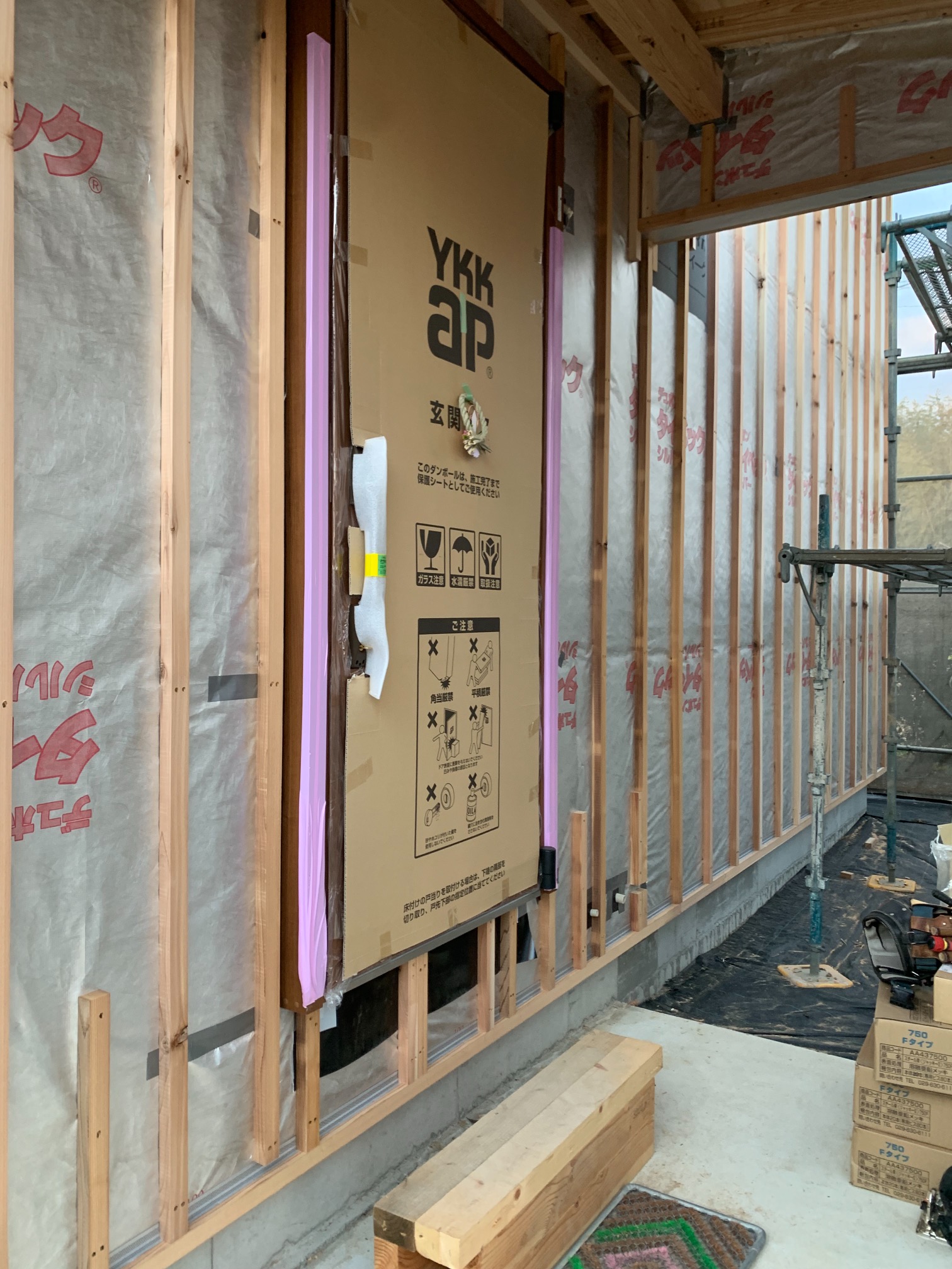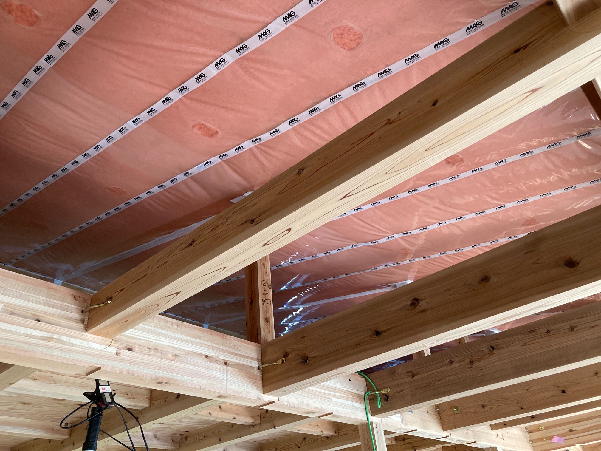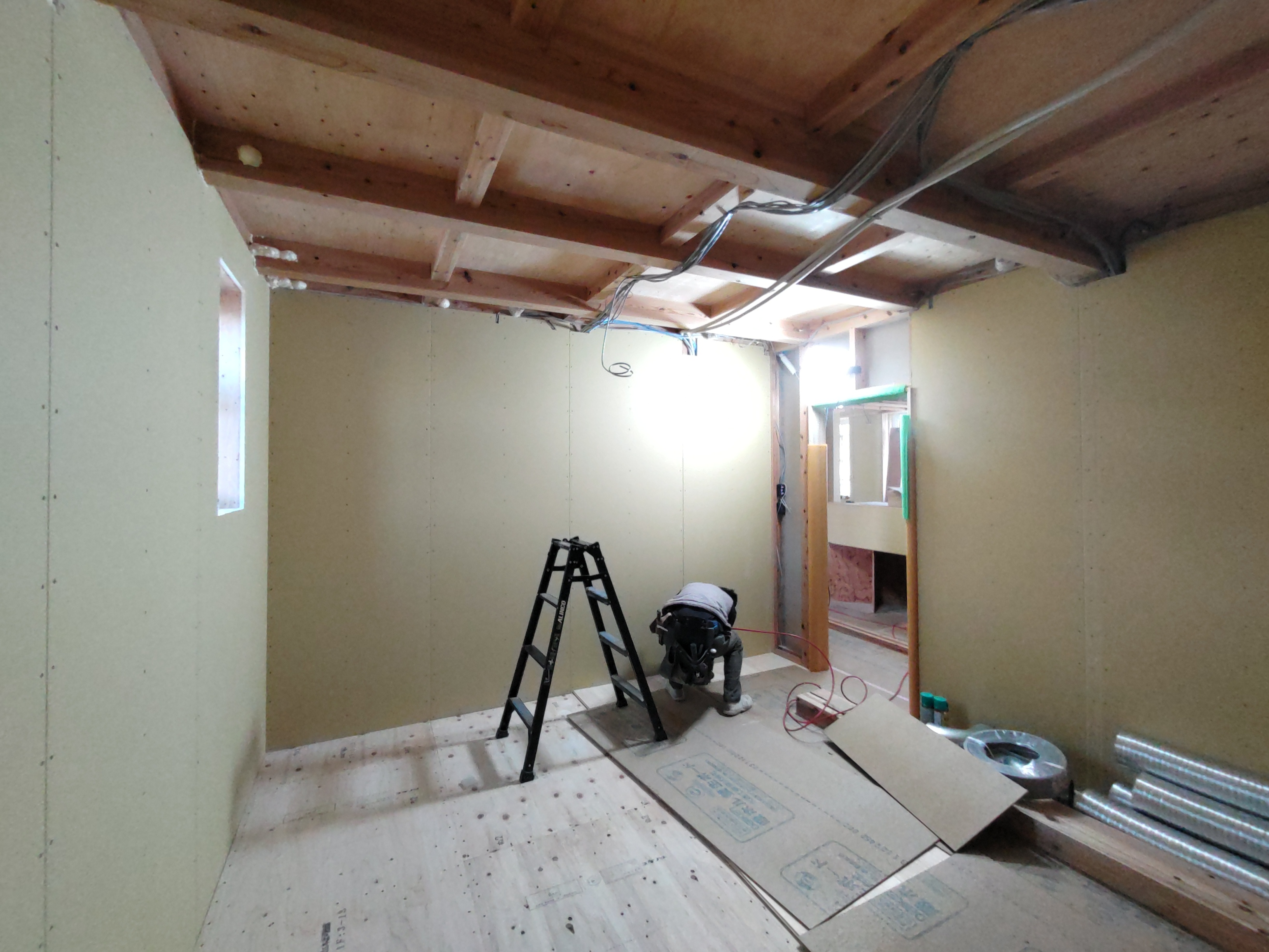 躯体の充填断熱、付加断熱の敷設と防水シートの敷設も着々と進んでいます。