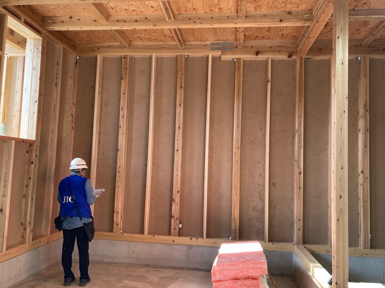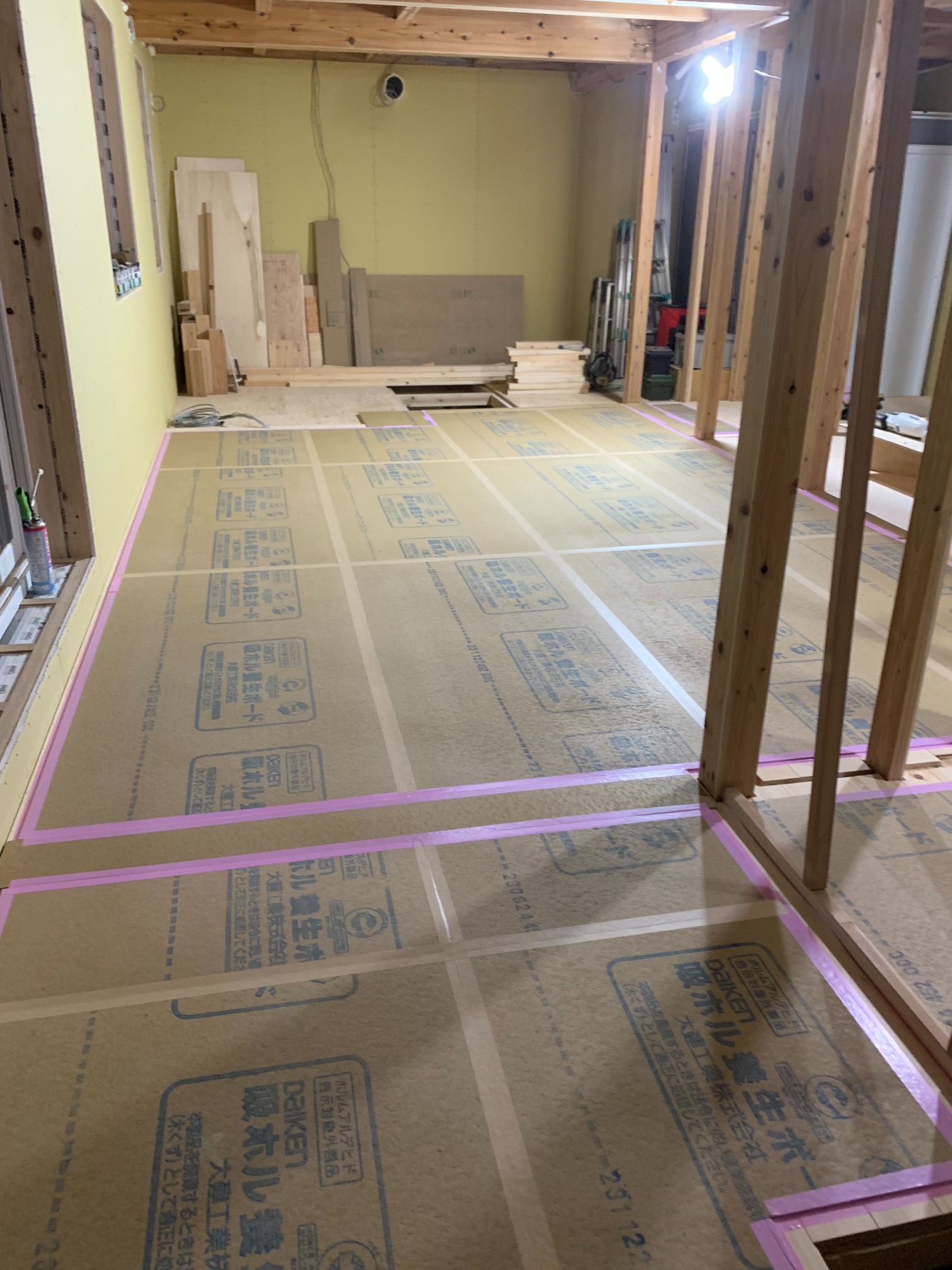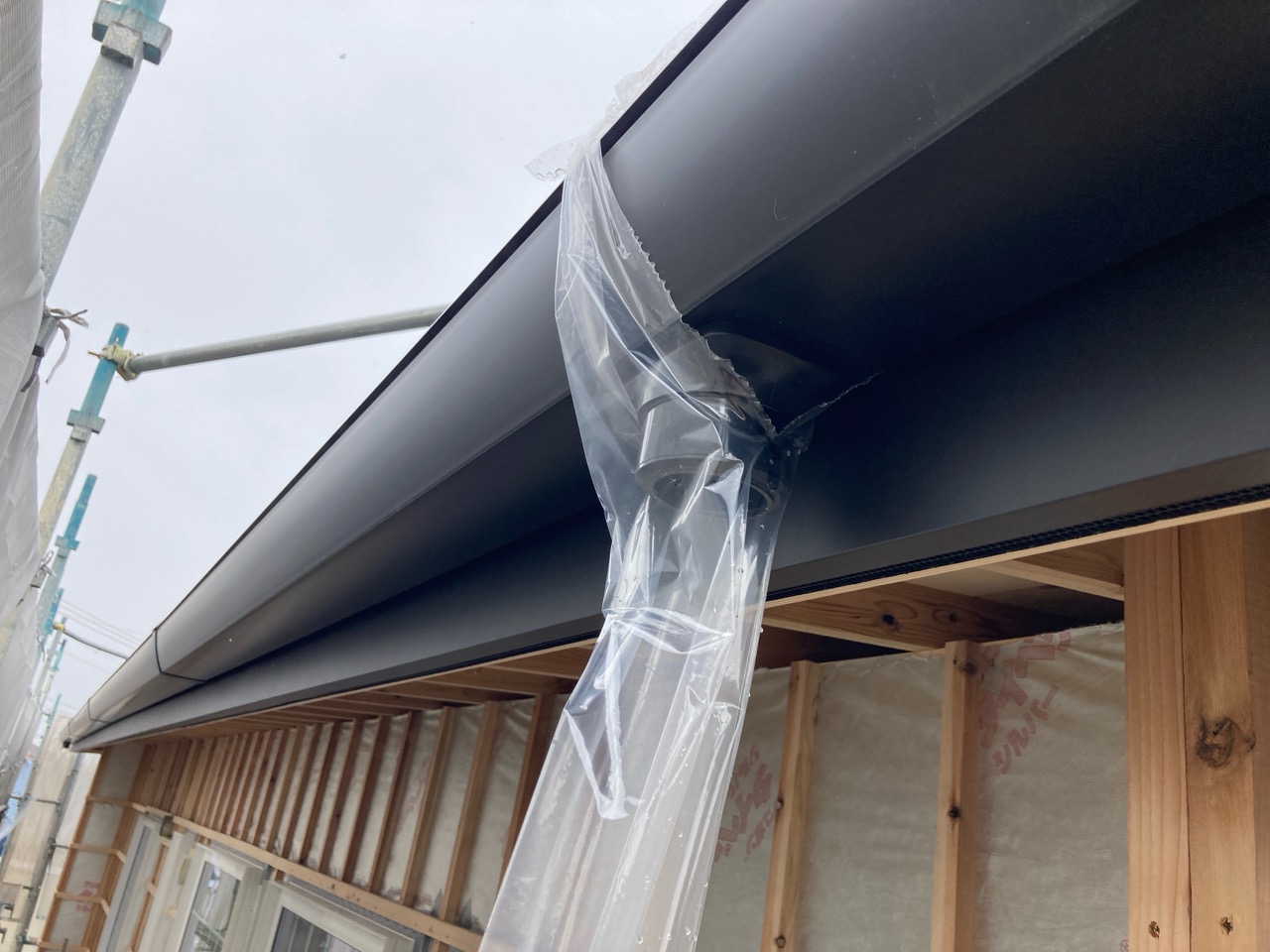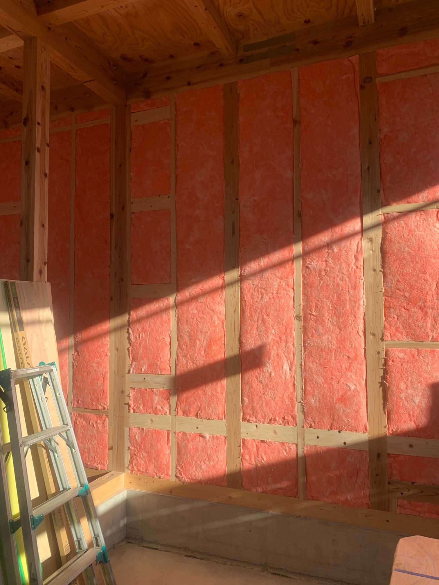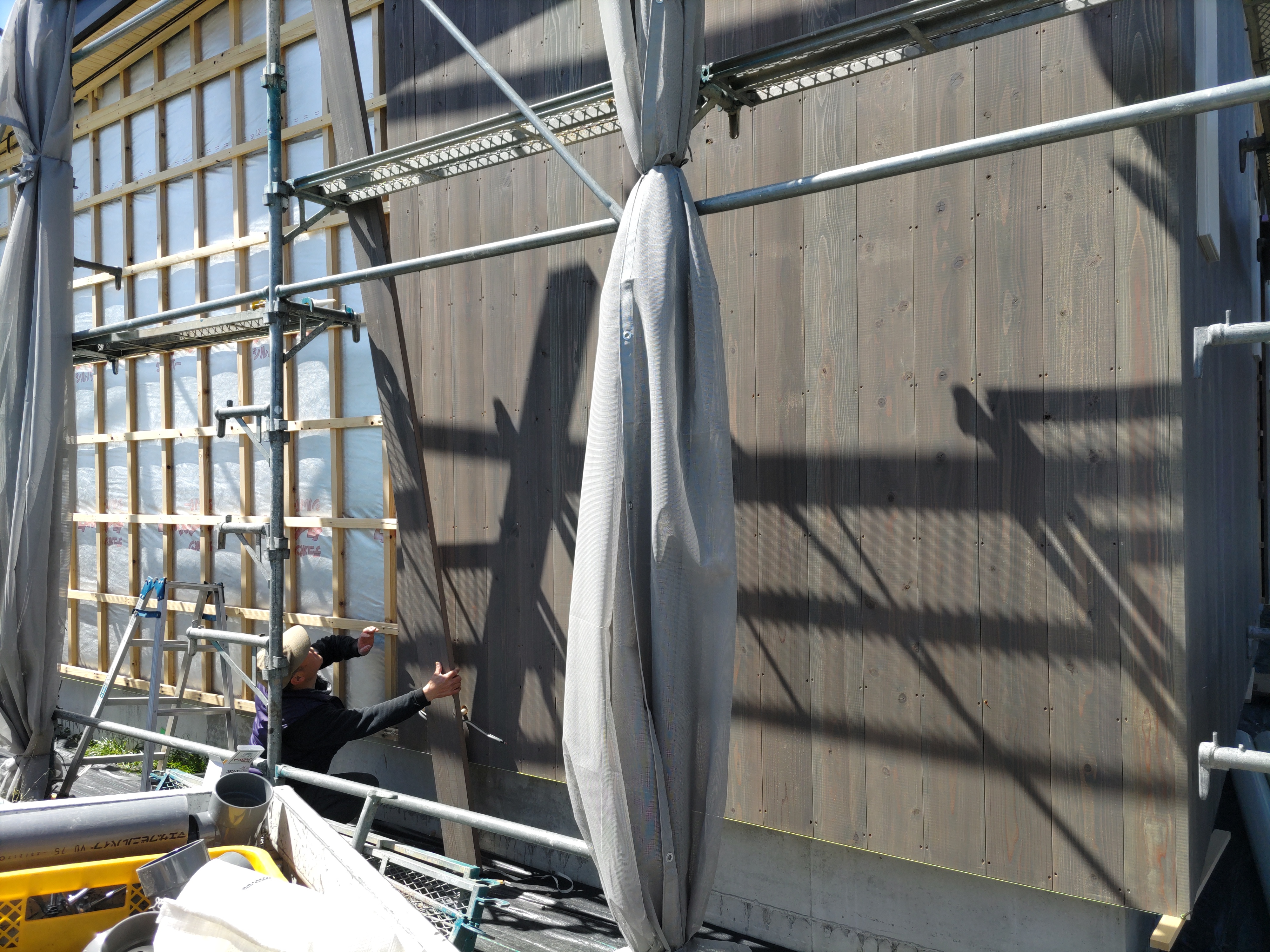 躯体の充填断熱、付加断熱の敷設と防水シートの敷設も着々と進んでいます。