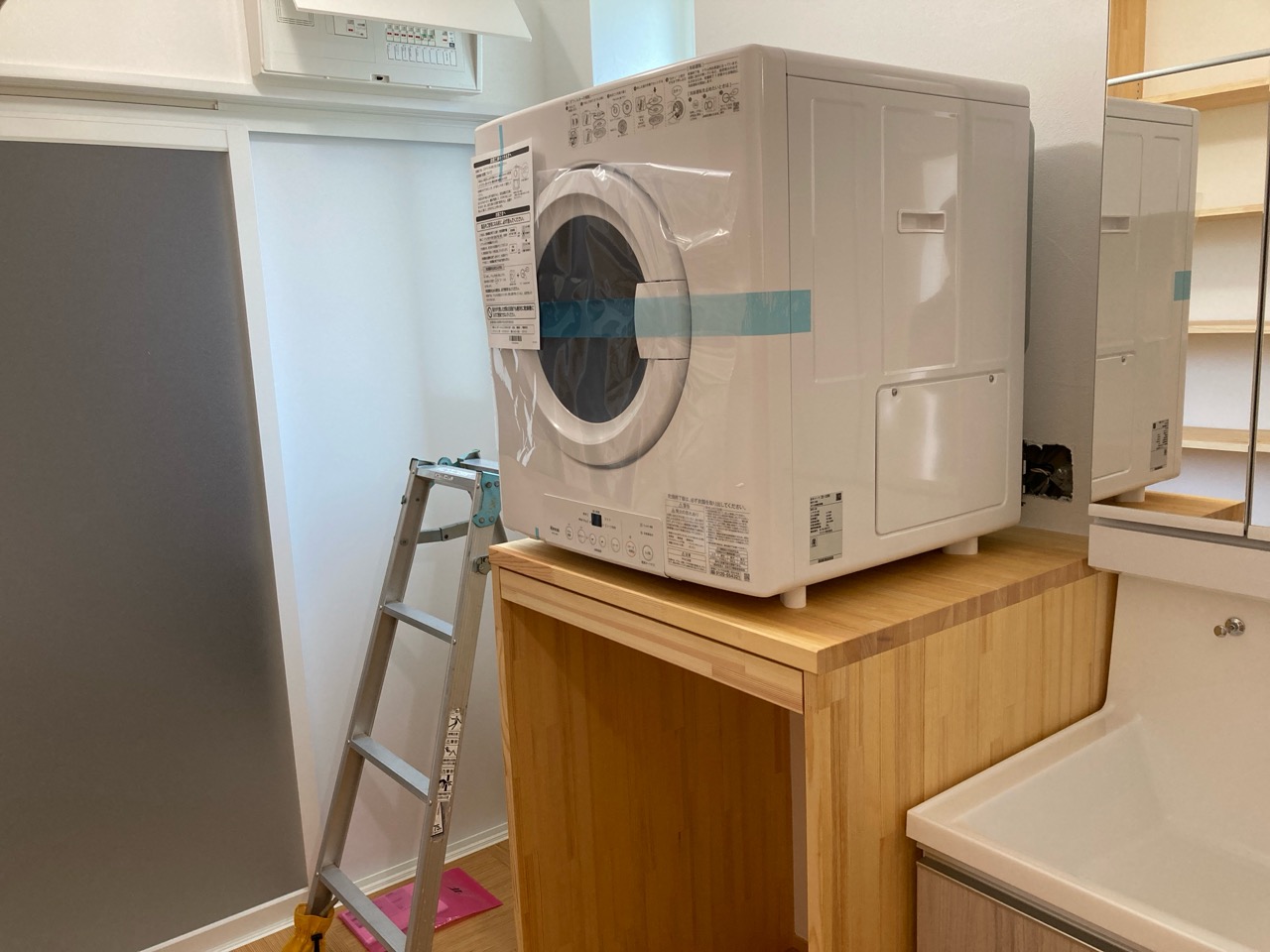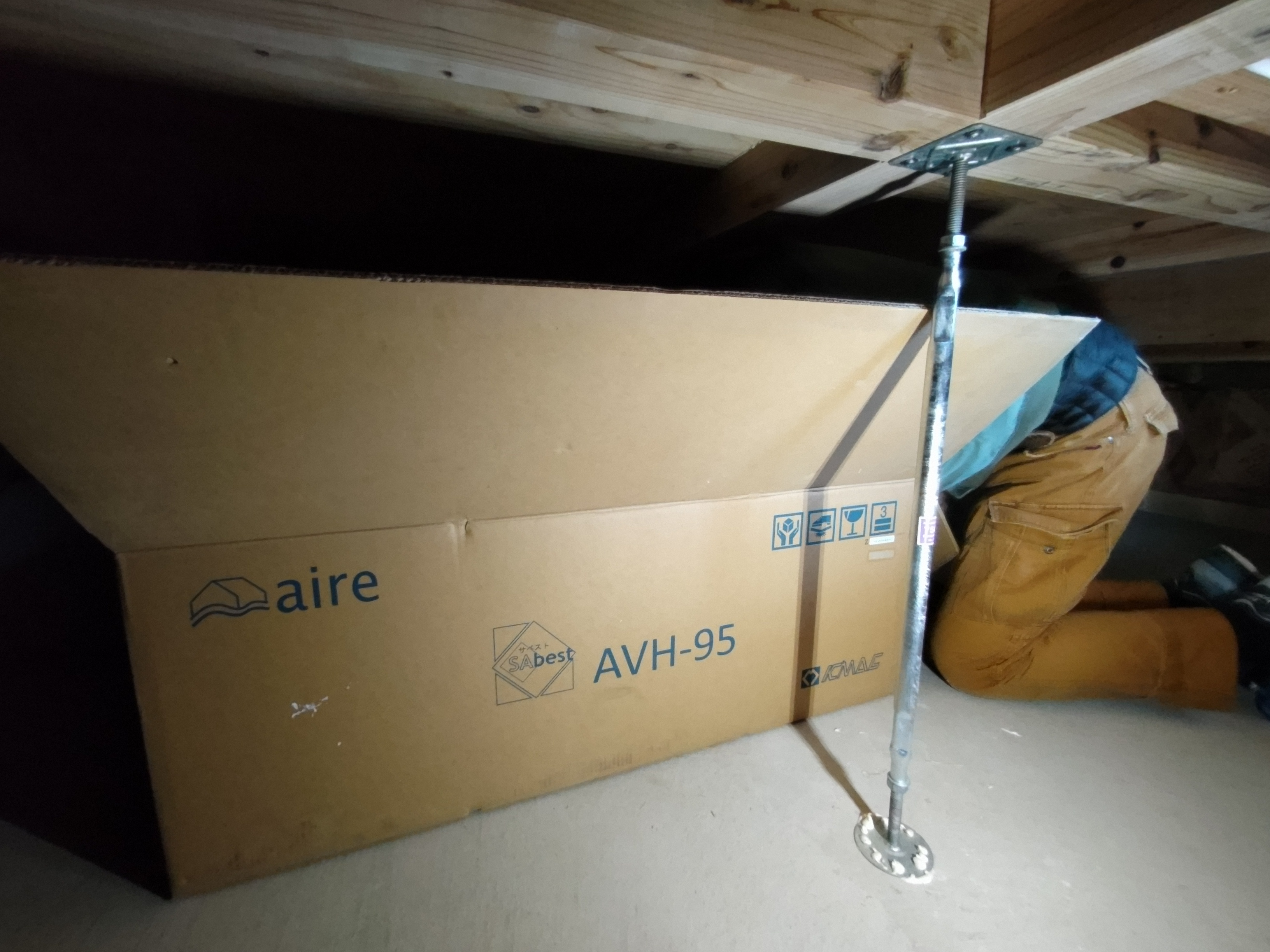 取付場所まで運搬して安堵したのもつかの間、取付高さまで持ち上げるのにも一苦労。楊重に棟梁2人、f井電気h場さん、監督、筆者と5人がかり。y様とお父様にも台を据えたり、養生を移動したりと少し手伝っていただき、総勢7人がかりで何とか無事に取付ける事ができました。ちなみに私も手がふさがってしまいますので、撮影はお母様にお願いしてしまいました。