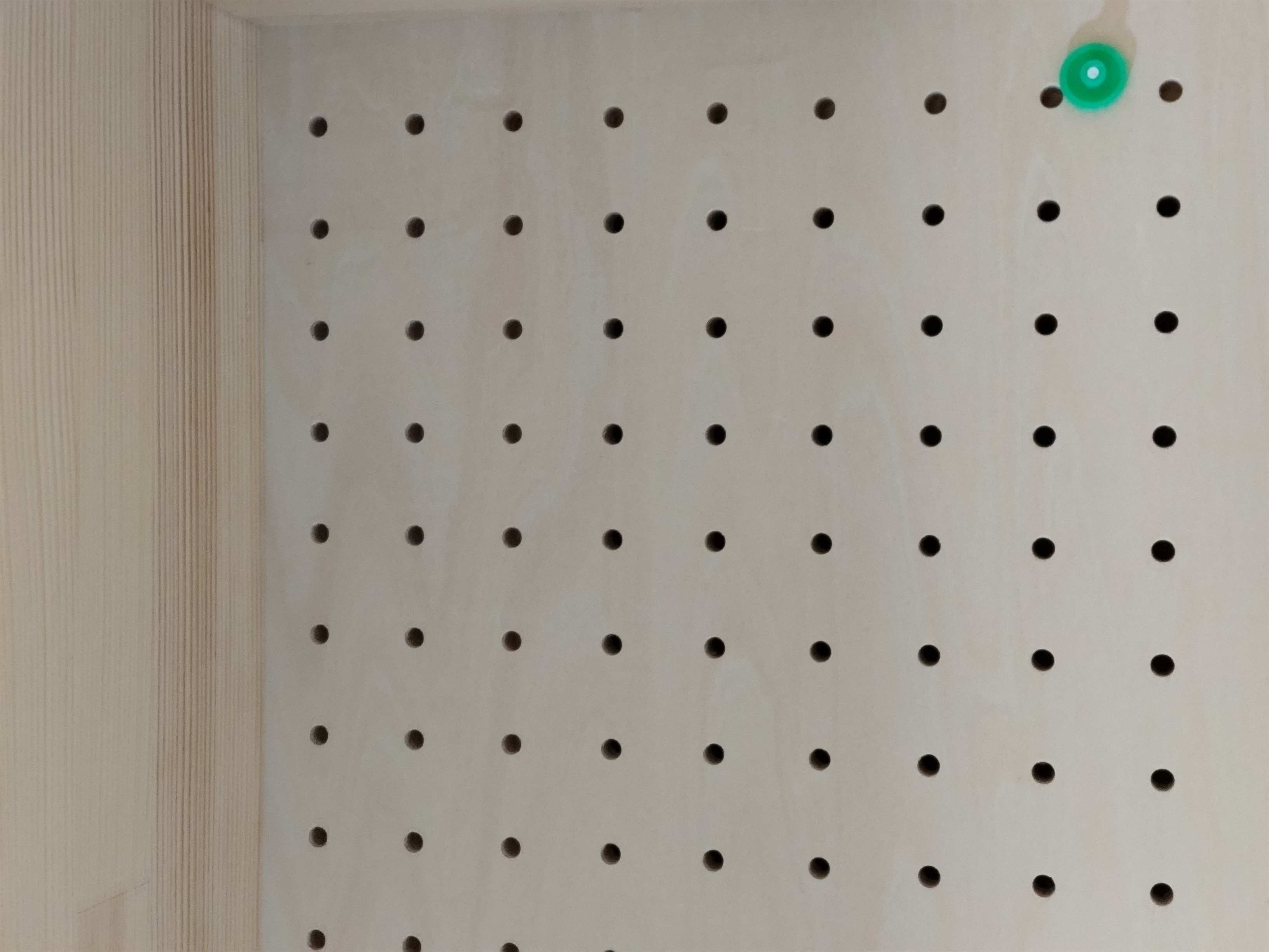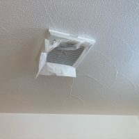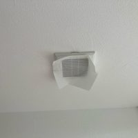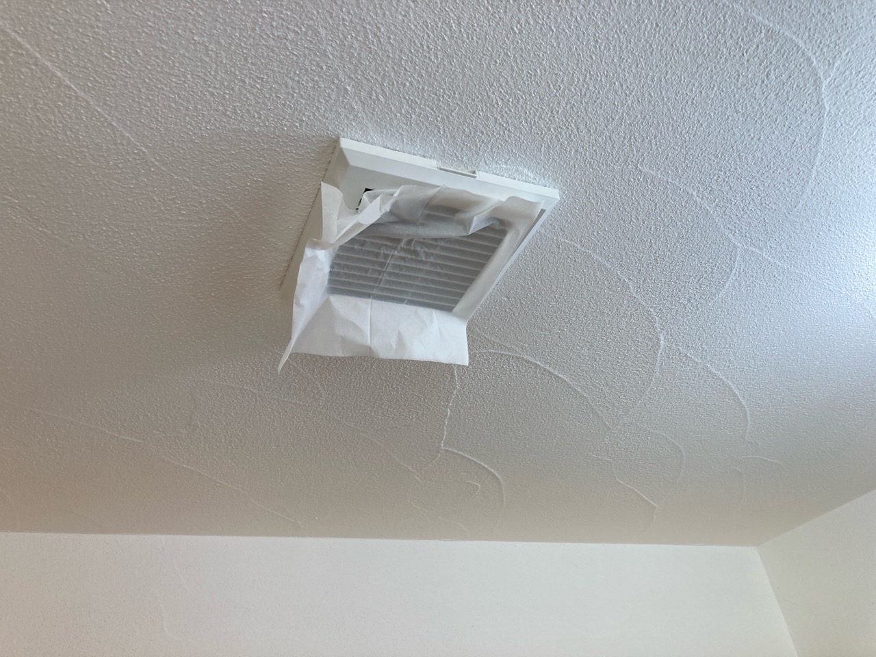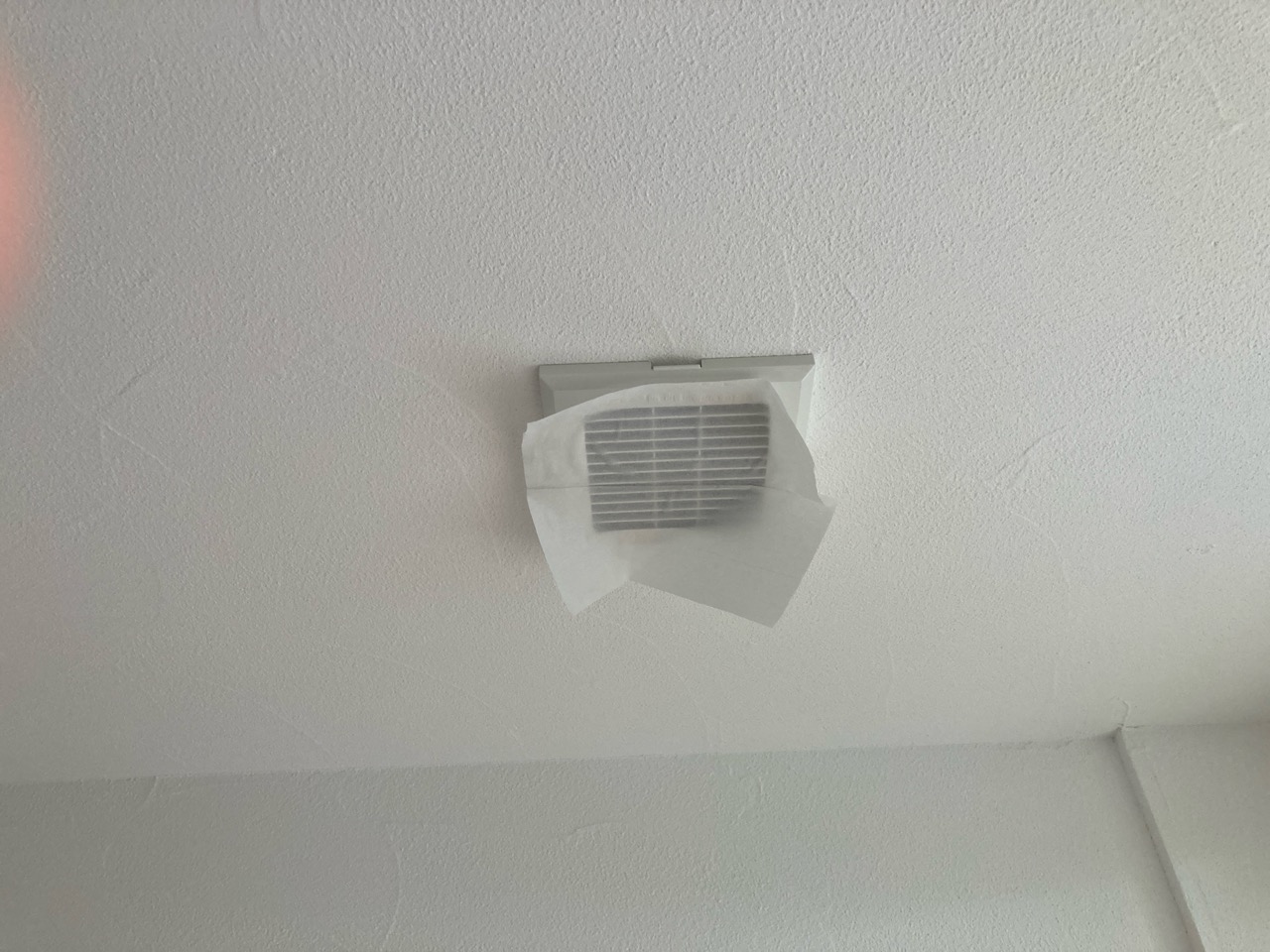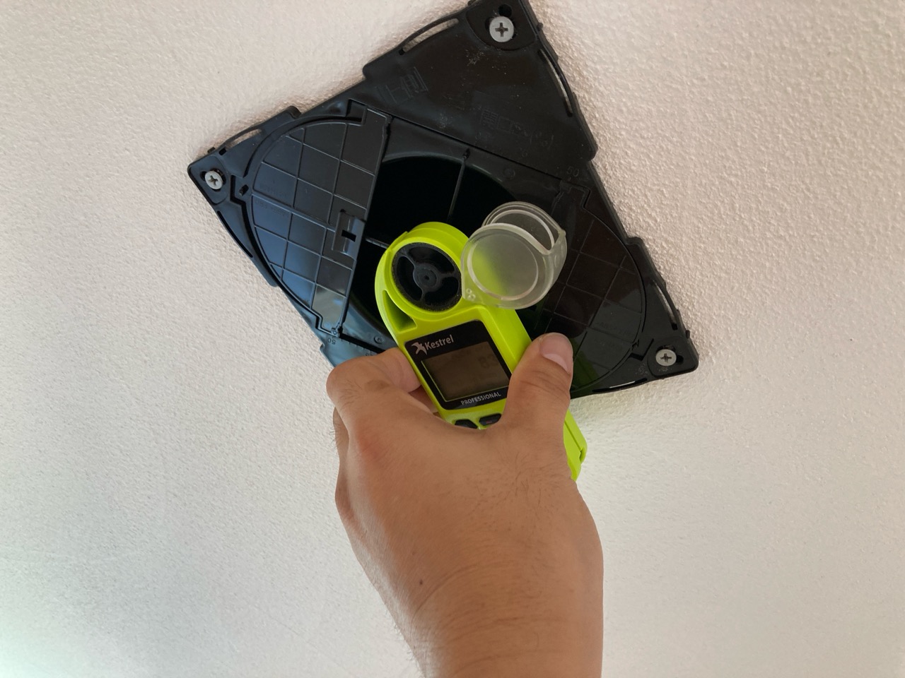 今回は主として各ガラリの風量をチェック。コンパクトな風量計を当てて測定していきます。天井に開けられたガラリは床から給気された空気を『上で引っ張る』という役目を果たしますのでティッシュを当てて引っ付いて落ちないくらいが目安との事です。