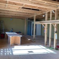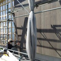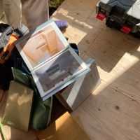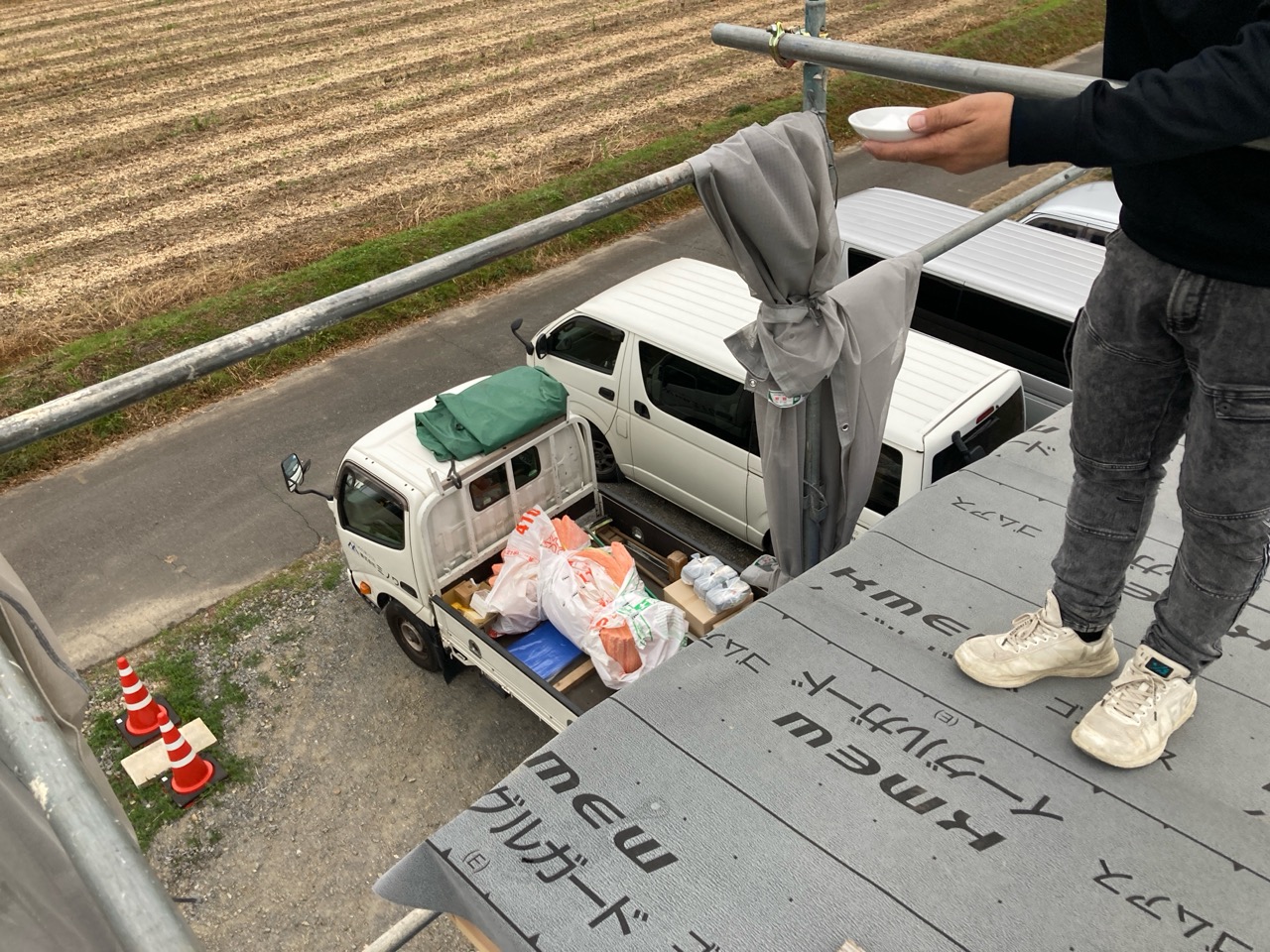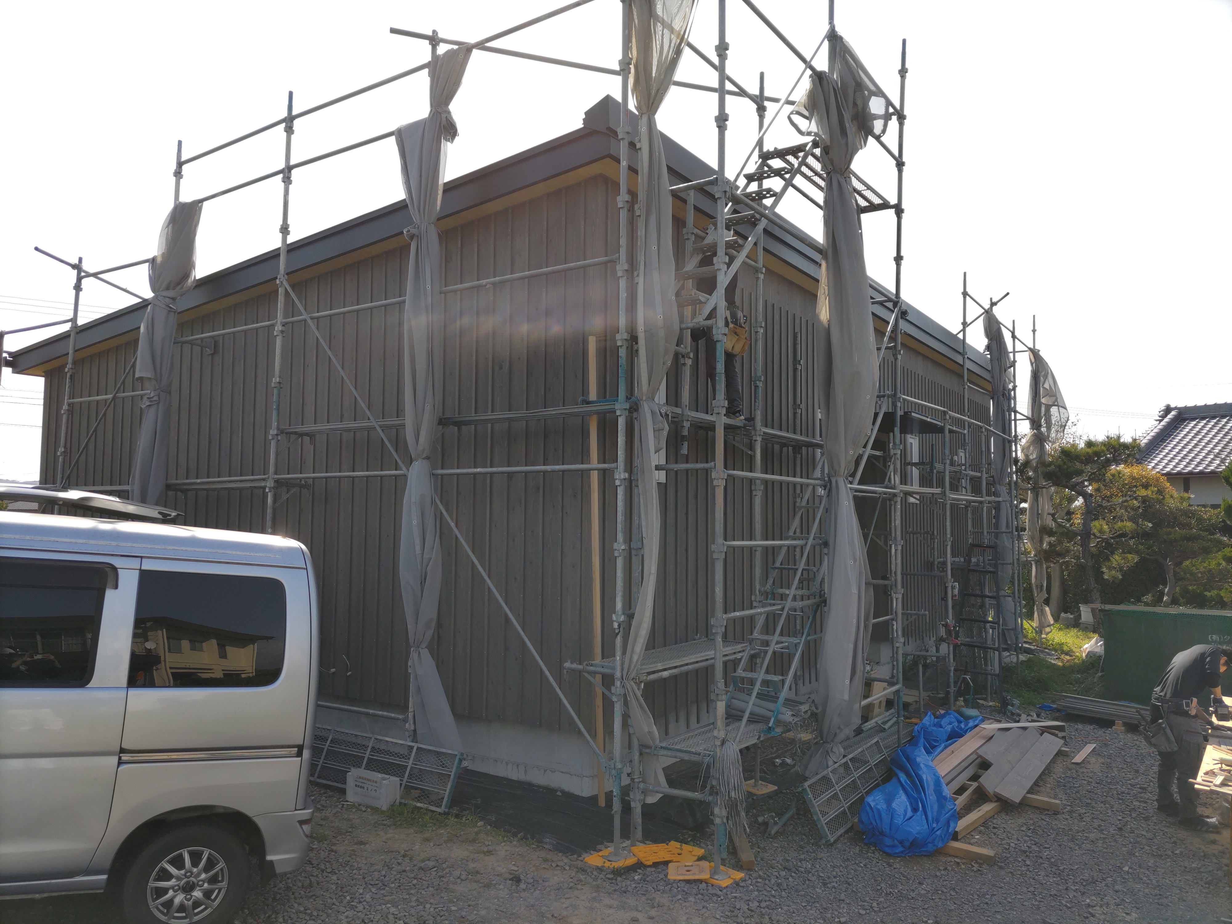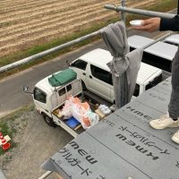 この頃には壁の面材も留め終え、全員をシート張りに投入、上記のように作業しやすい環境からシートもあっという間に終わってしまいました。