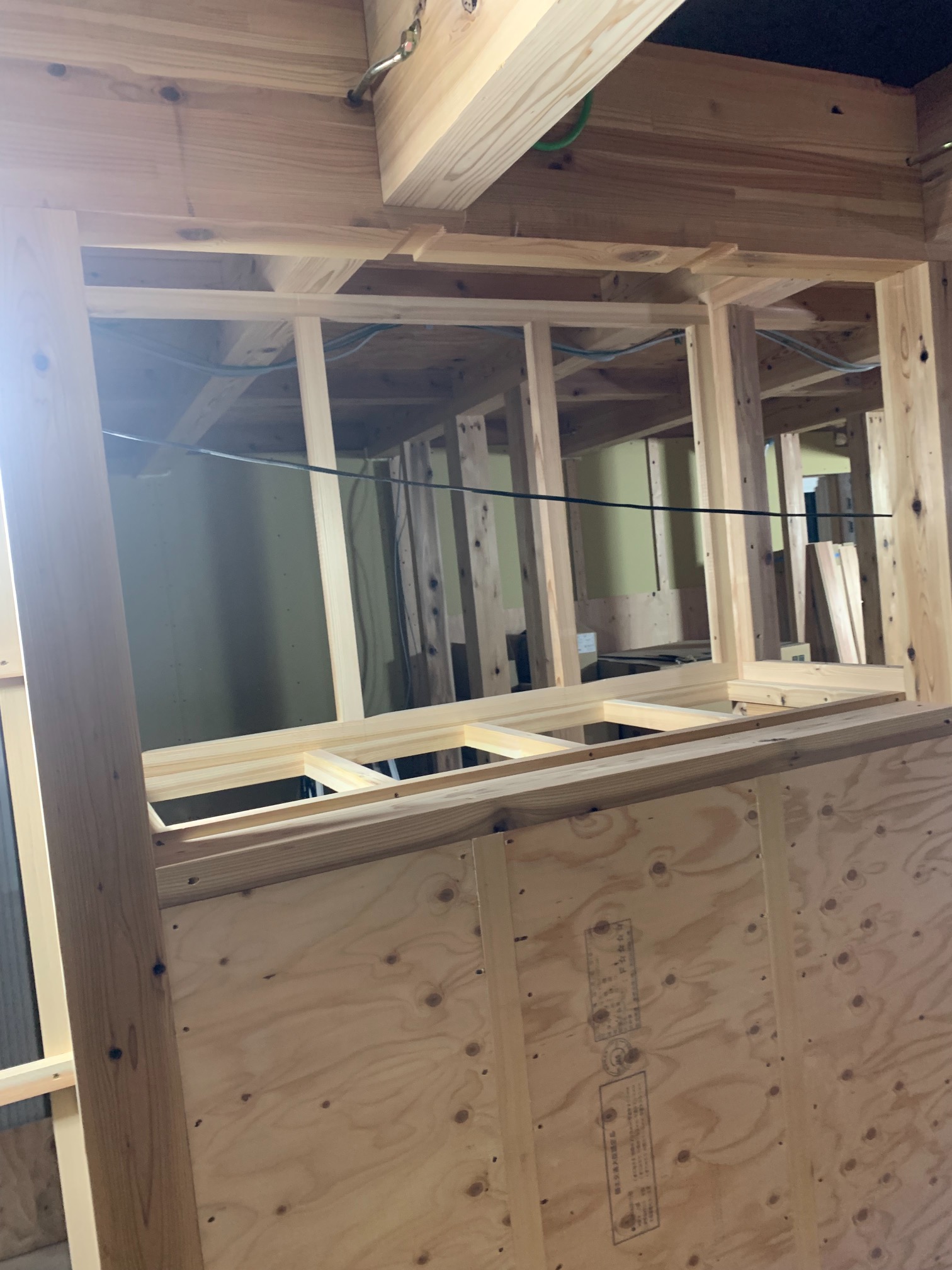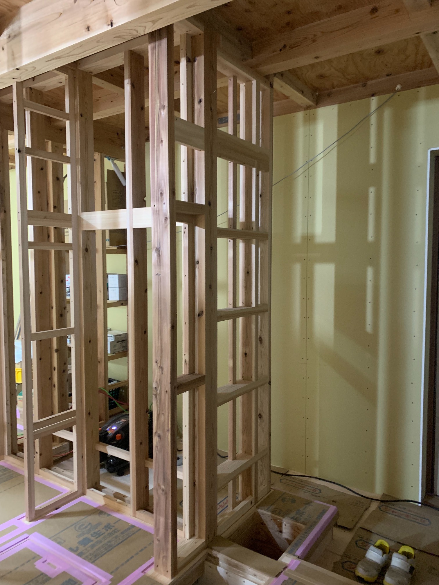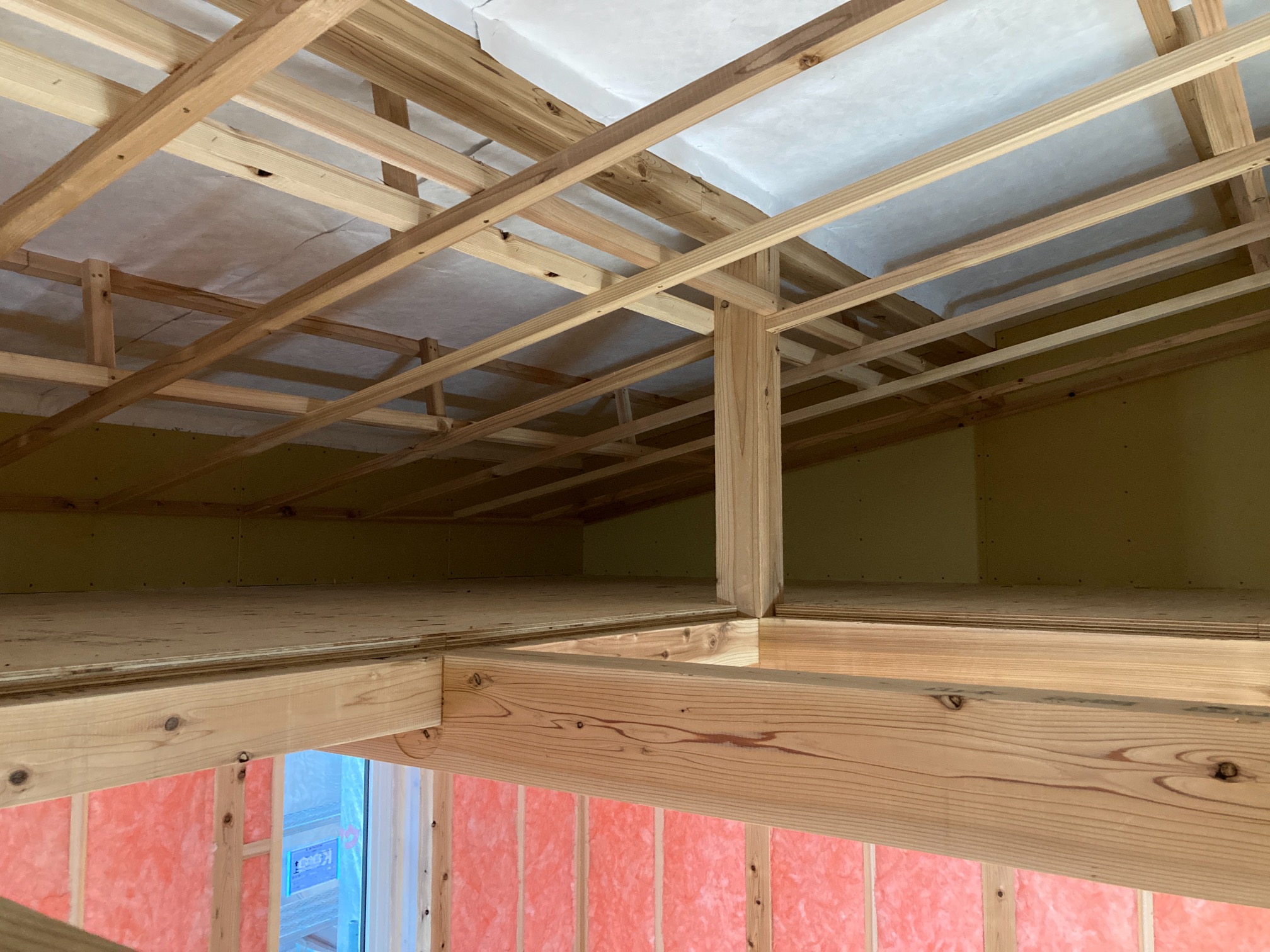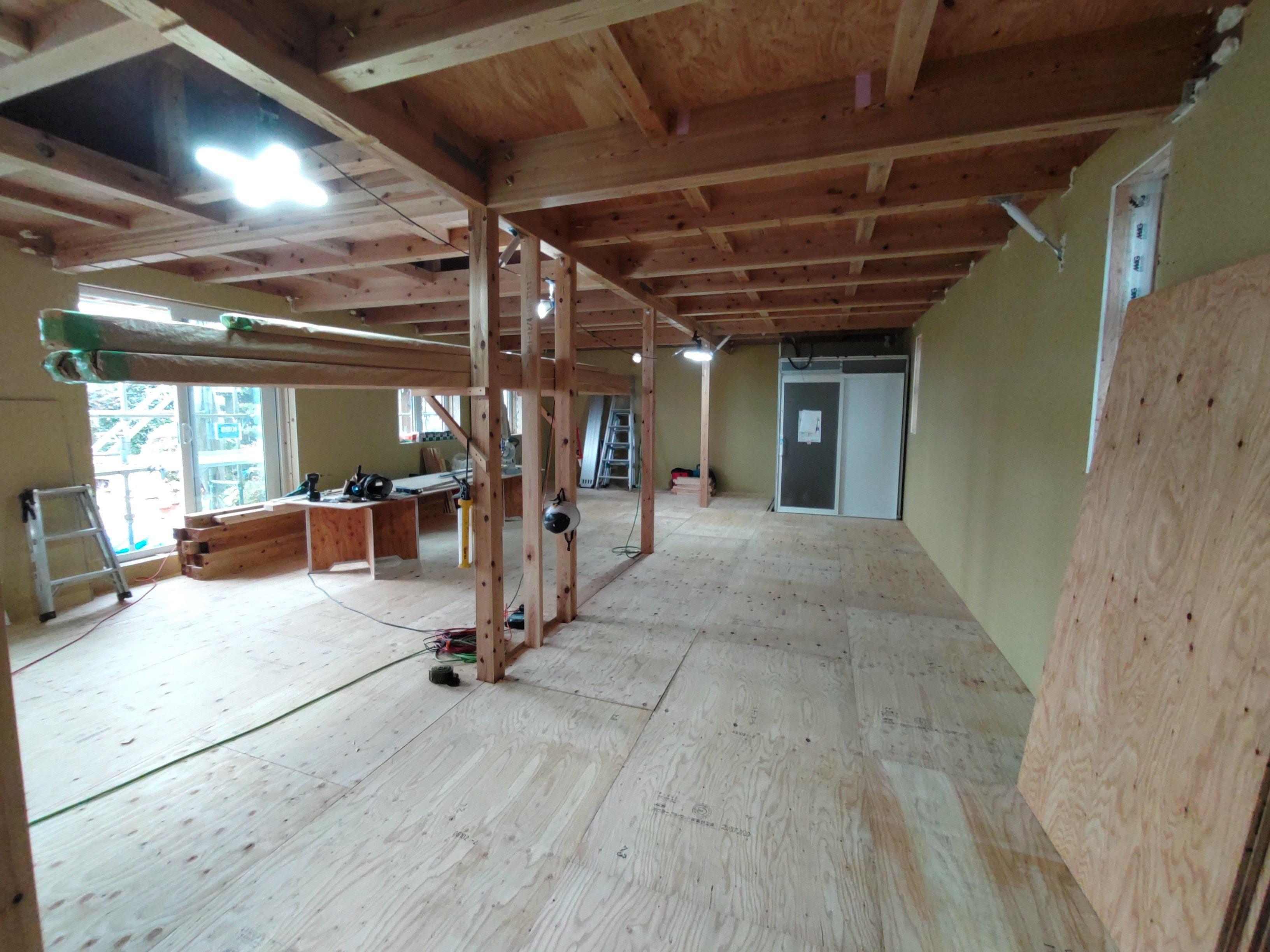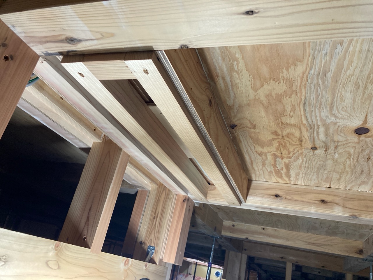 一部水平の合板を打っていない部分はk長先生の構造計算により『構面が無くても良い部分』となります。