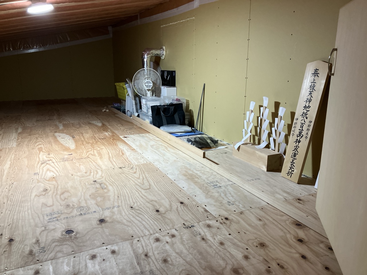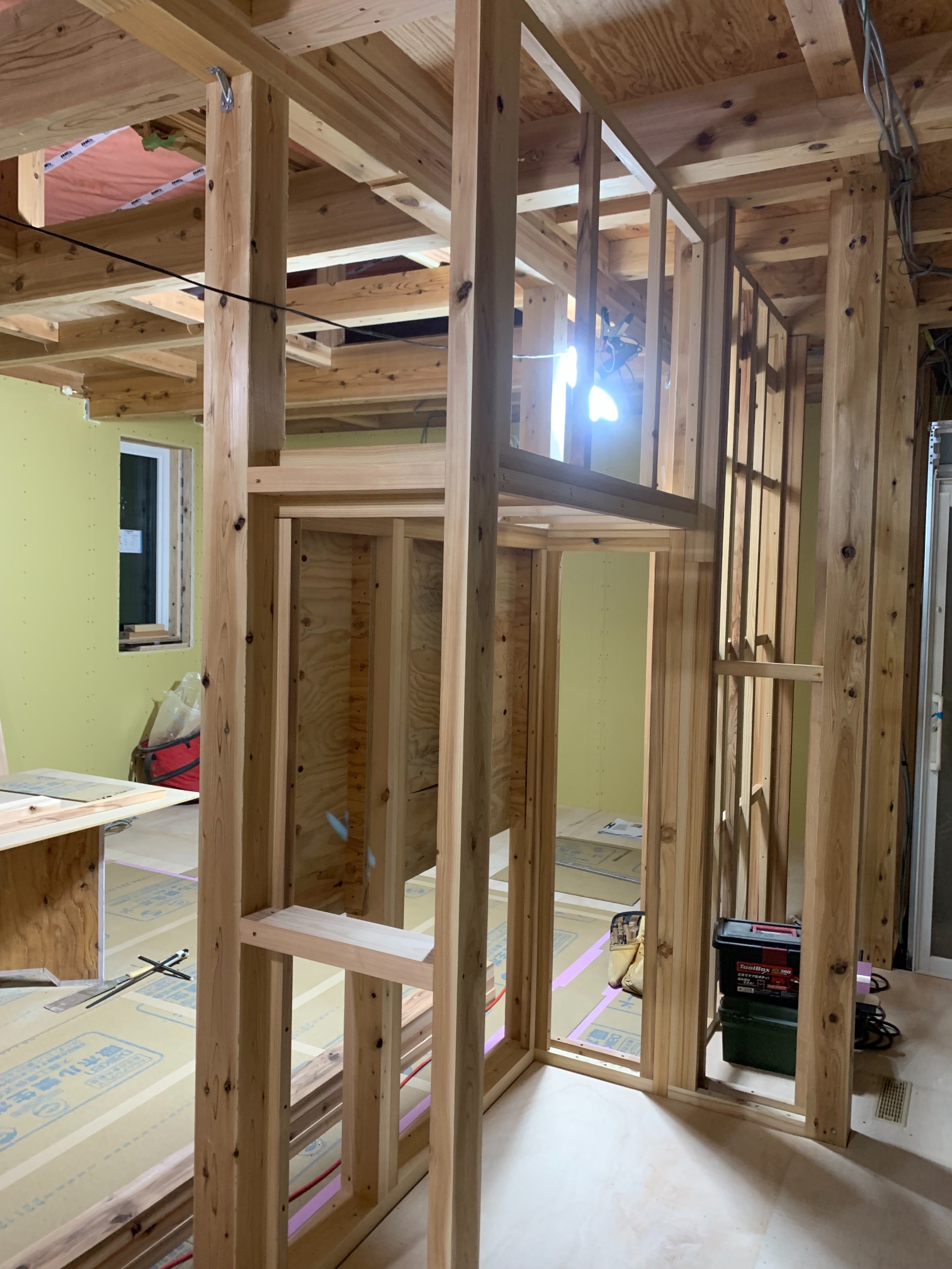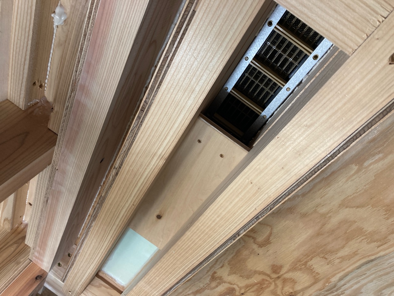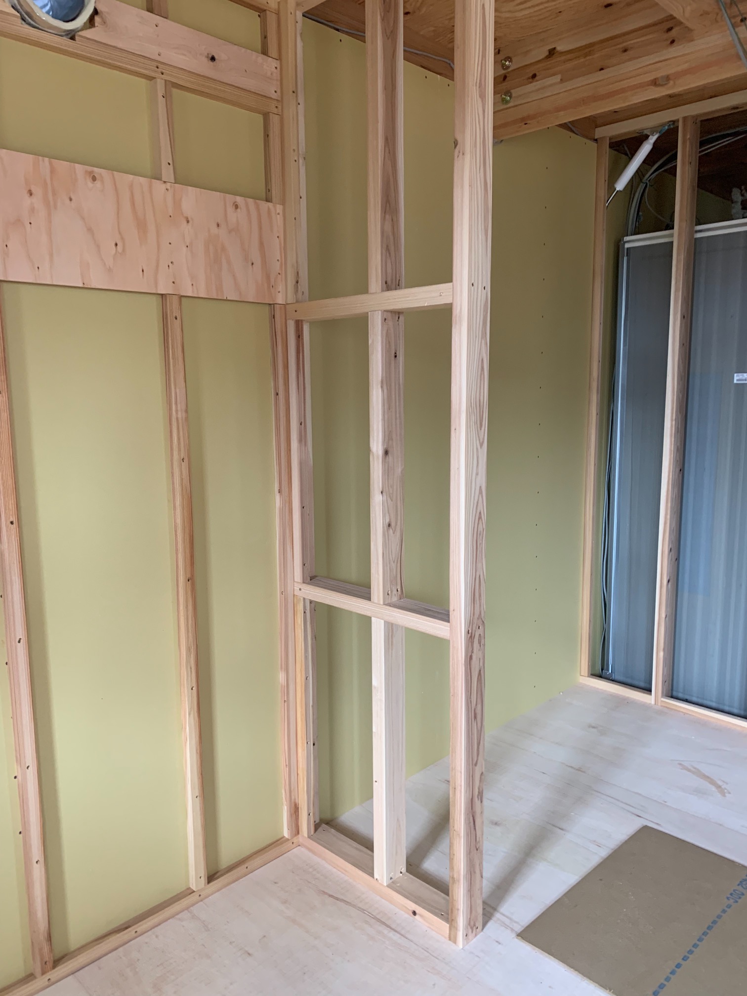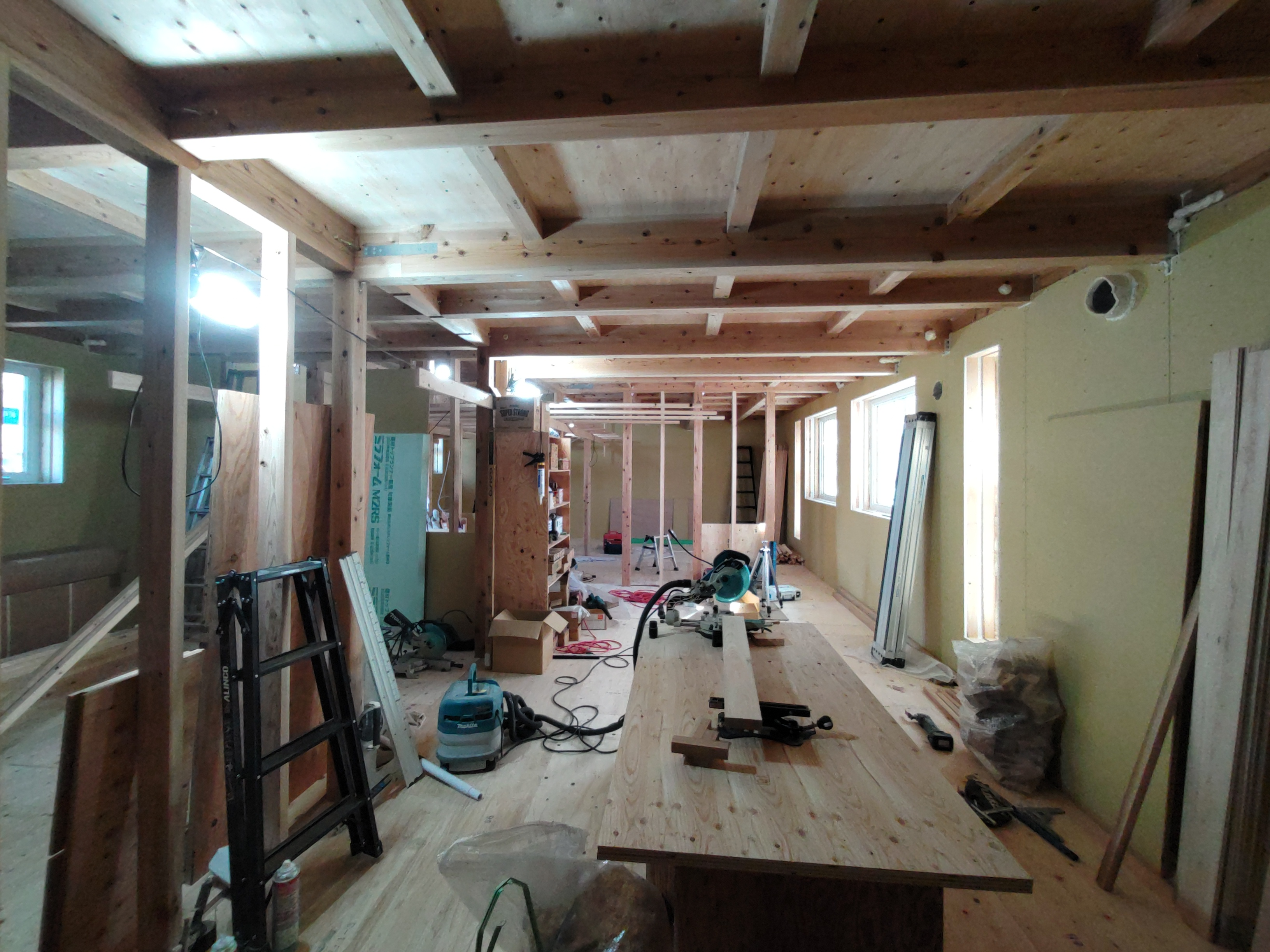 一部水平の合板を打っていない部分はk長先生の構造計算により『構面が無くても良い部分』となります。
