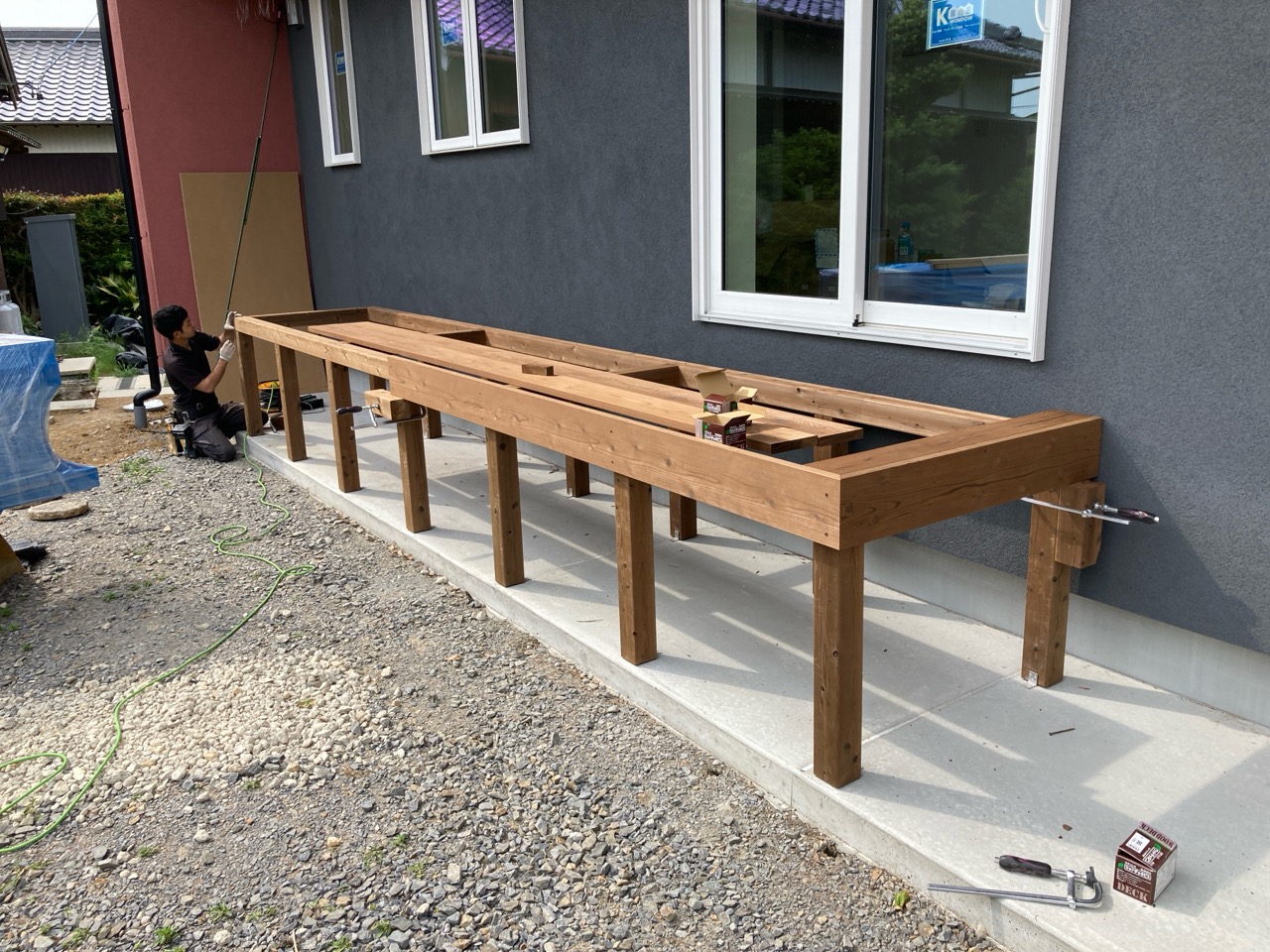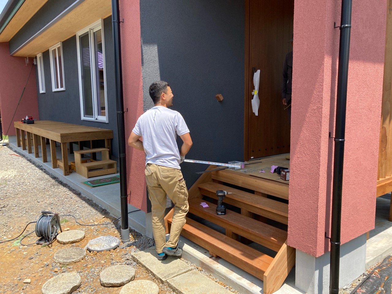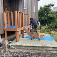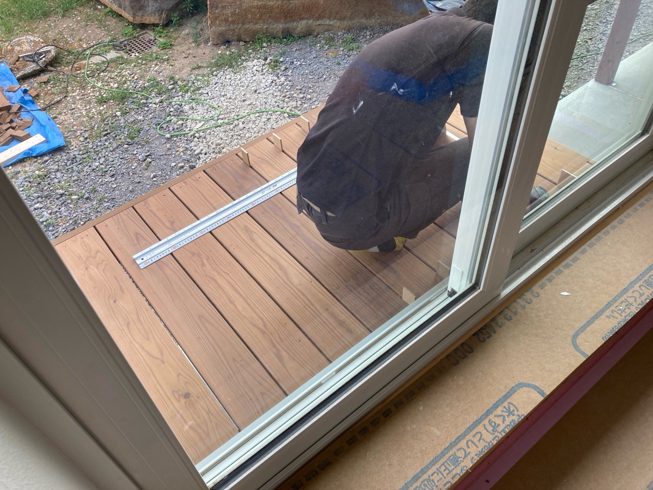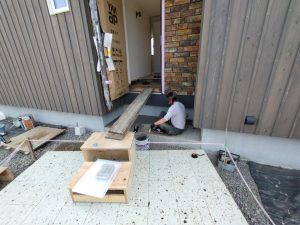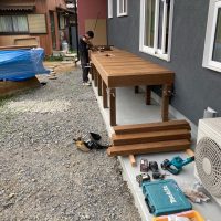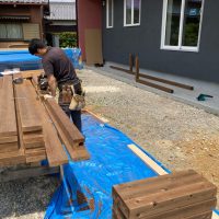 北世帯は掃き出し窓のウッドデッキ製作にかかり始めています。造作完了時以来、k保木棟梁が久しぶりに現場を訪れました。”掃き出し窓の部分は”おなじみのエステックウッドを使用しています。