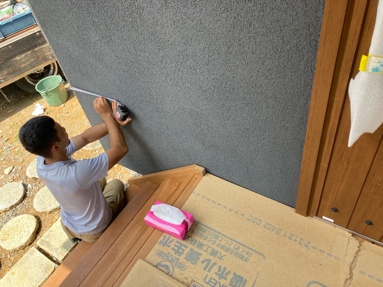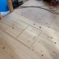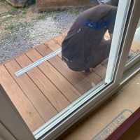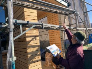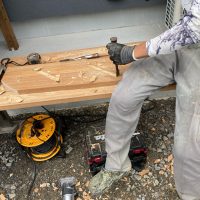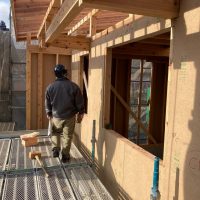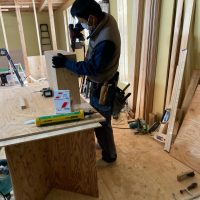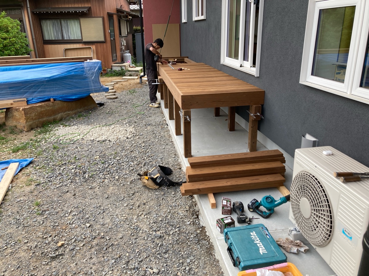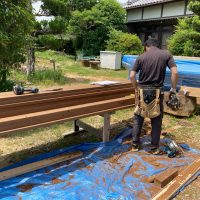 北世帯は掃き出し窓のウッドデッキ製作にかかり始めています。造作完了時以来、k保木棟梁が久しぶりに現場を訪れました。”掃き出し窓の部分は”おなじみのエステックウッドを使用しています。