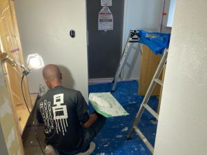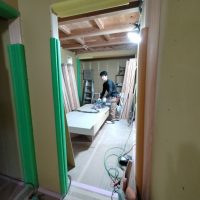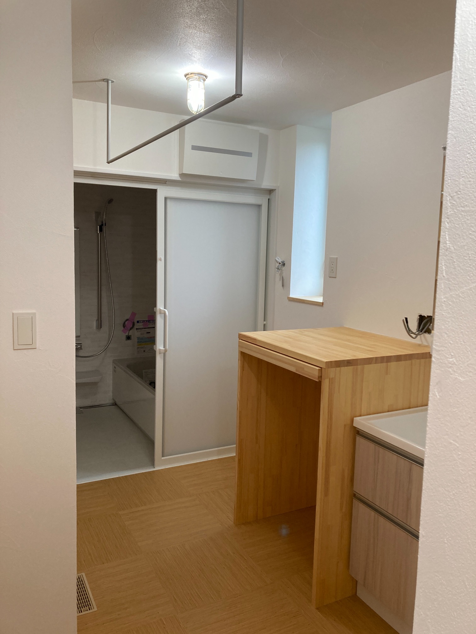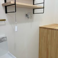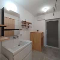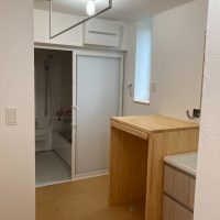 北世帯も内部クリーニングが終了。いつでも生活できる空間が整いました。写真では見づらいですが脱衣室の床にはサン〇ツの『籐』のフロアタイルを使用。スーパー銭湯の脱衣所によく使われているイメージがありますが、素足で歩くと足触りが良い表面をしています。