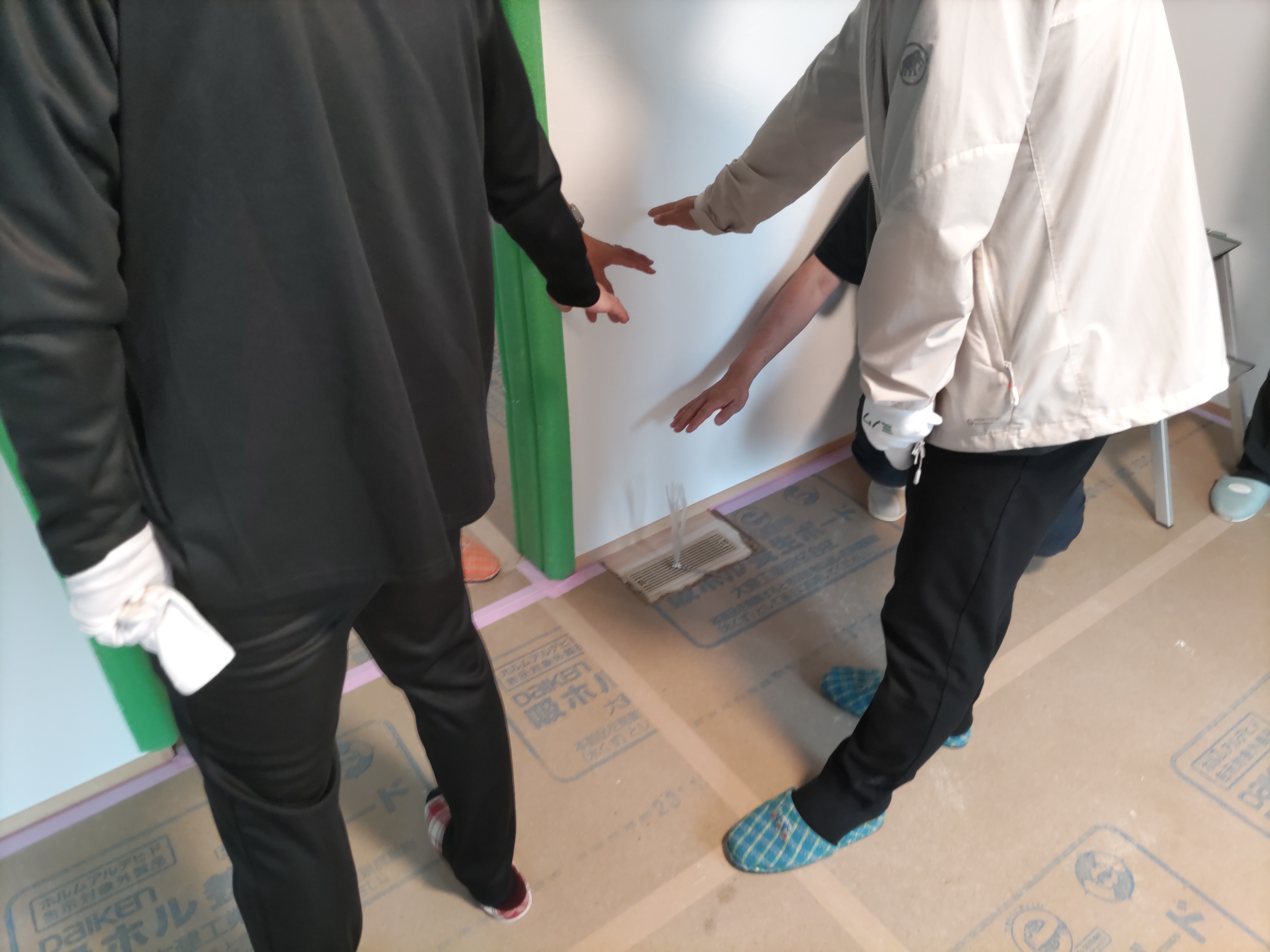吹き出し口の蓋が開いている時は部屋が正圧にあり、扉の隣室の脱衣室床に開けられた吸い込み口から床下へ排気、という流れができています。閉めた時は逆に負圧となり、隣室からの気流が入ってくるという仕組みです。居室に人がいる時は正圧にしてCO2を排気側に流していきたいという事です。さすがはk長先生、ティッシュペーパーなどなくてもその眼には気流に色が付いて見えているかのようです。
