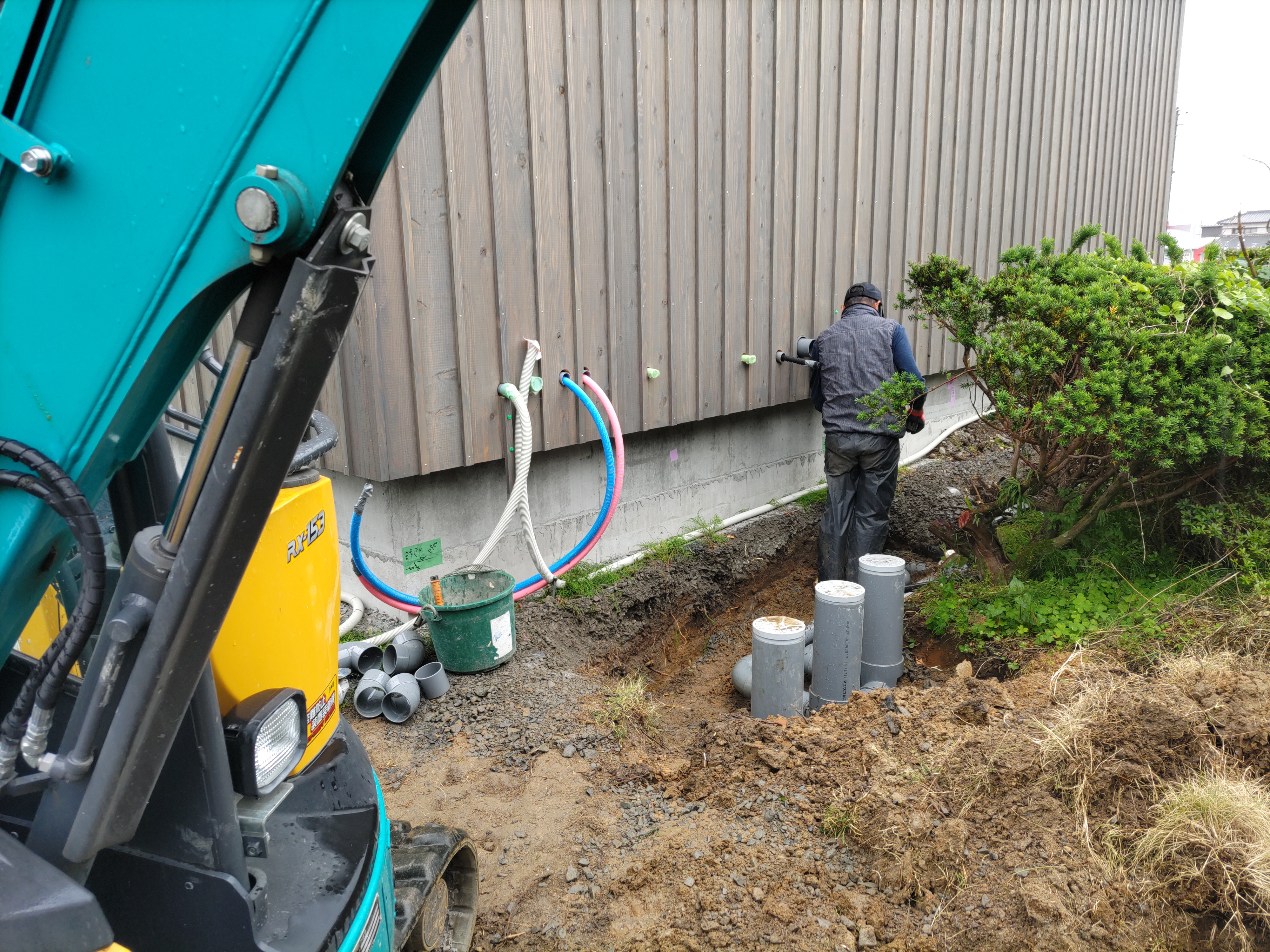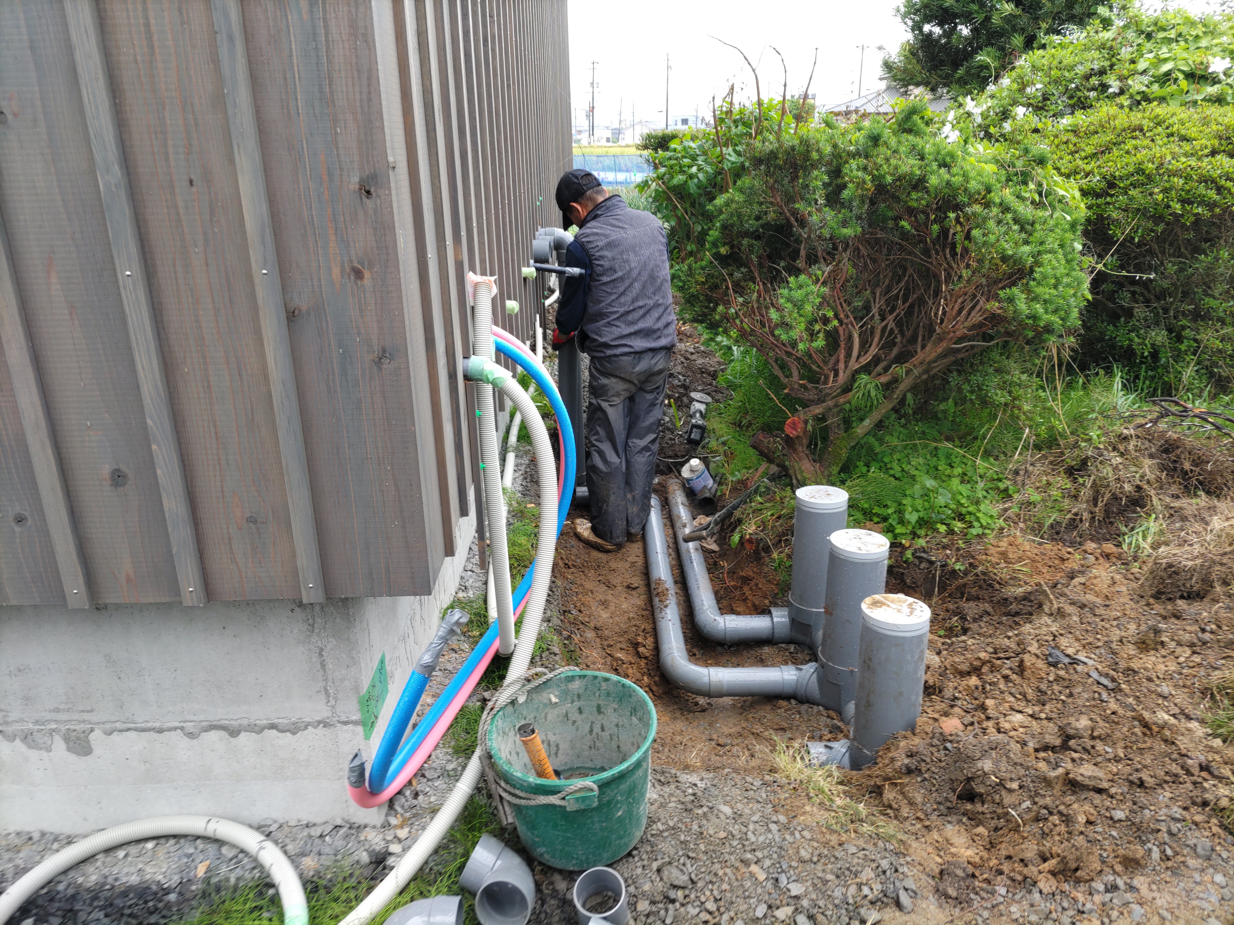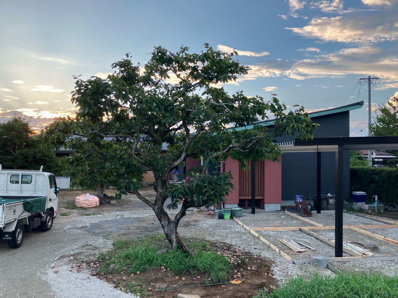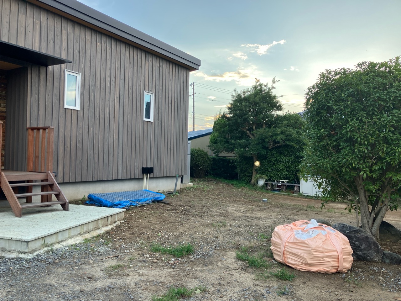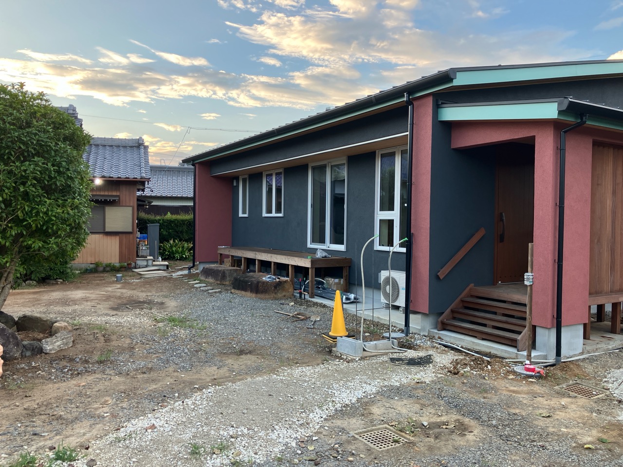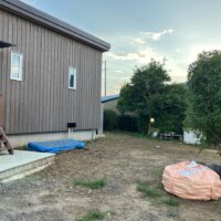 別件で幸田町に用事があり、1か月ぶりに現場へ訪れました。住宅完成後から始まった外構工事の真っ最中。お訪ねしたのが夕方でしたので業者さんは帰った後でしたが、工事の隙間を縫ってお父様はまた何か作業中。庭は全面芝生張りにされるそうですが、そこへ散水スプリンクラーを設けるための井戸からの給水管をDIYで敷設されているとの事。相変わらずマルチタスクなお父様です。芝生の下地のための整地によって施工中に見ていた景色とは一変、かなりすっきりした印象のある庭になっています。これは外構工事完了後の景色が楽しみです。