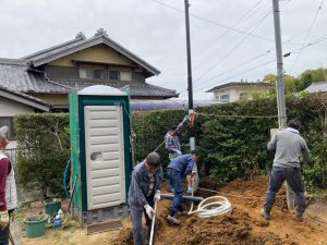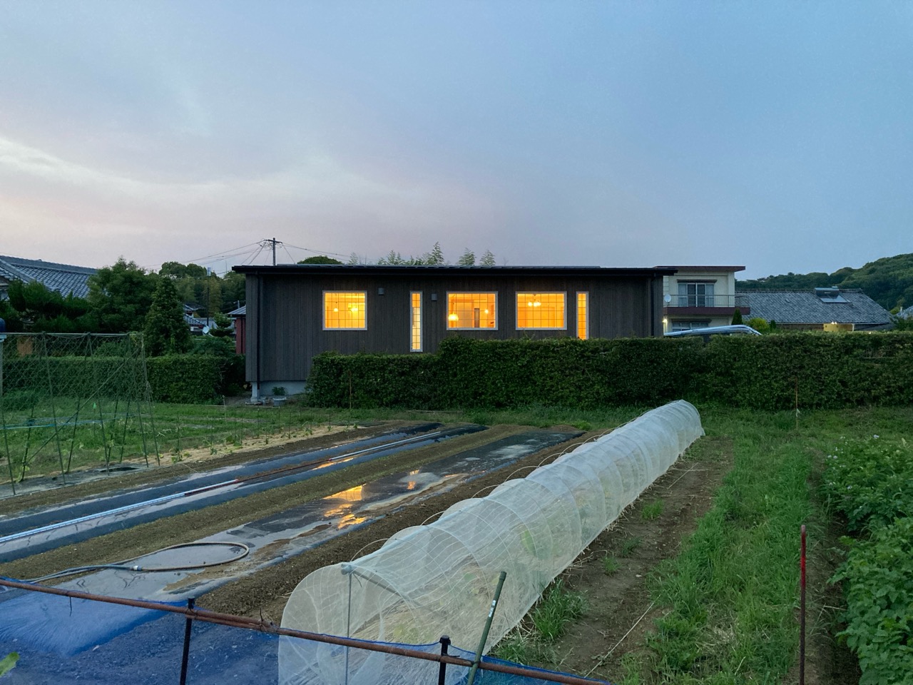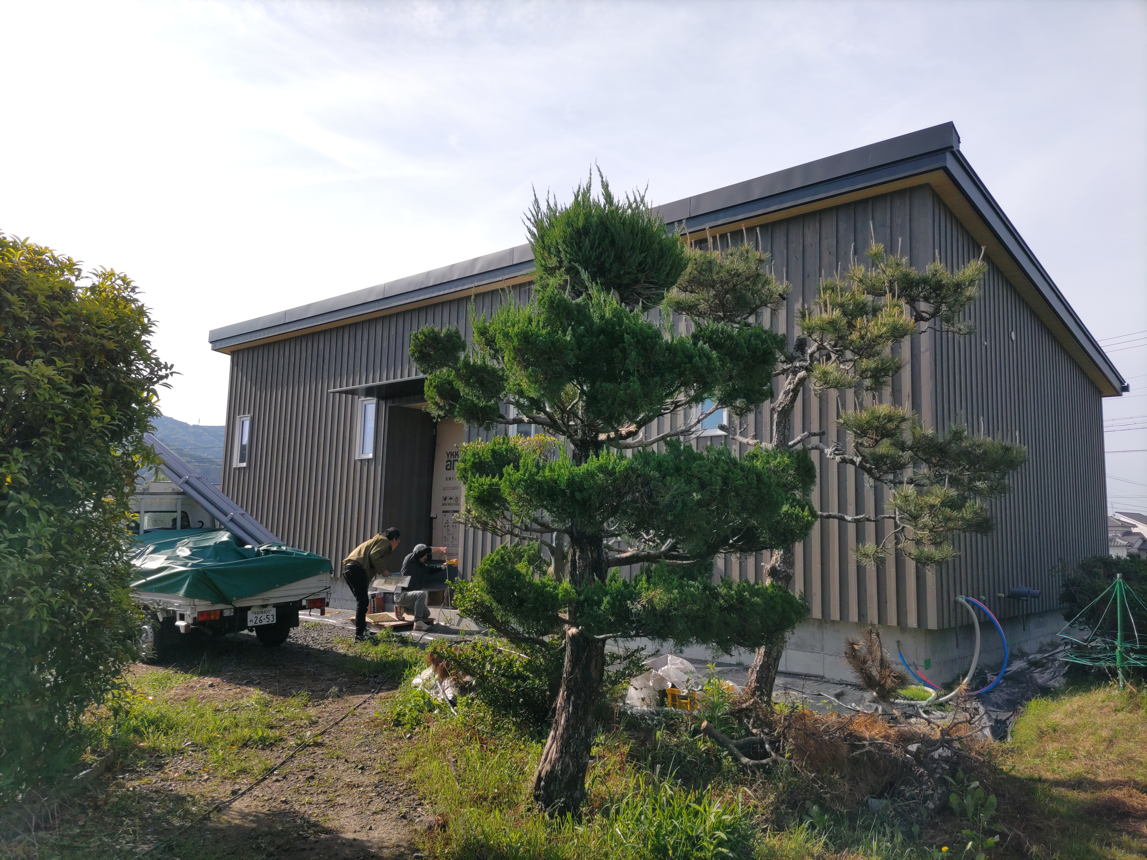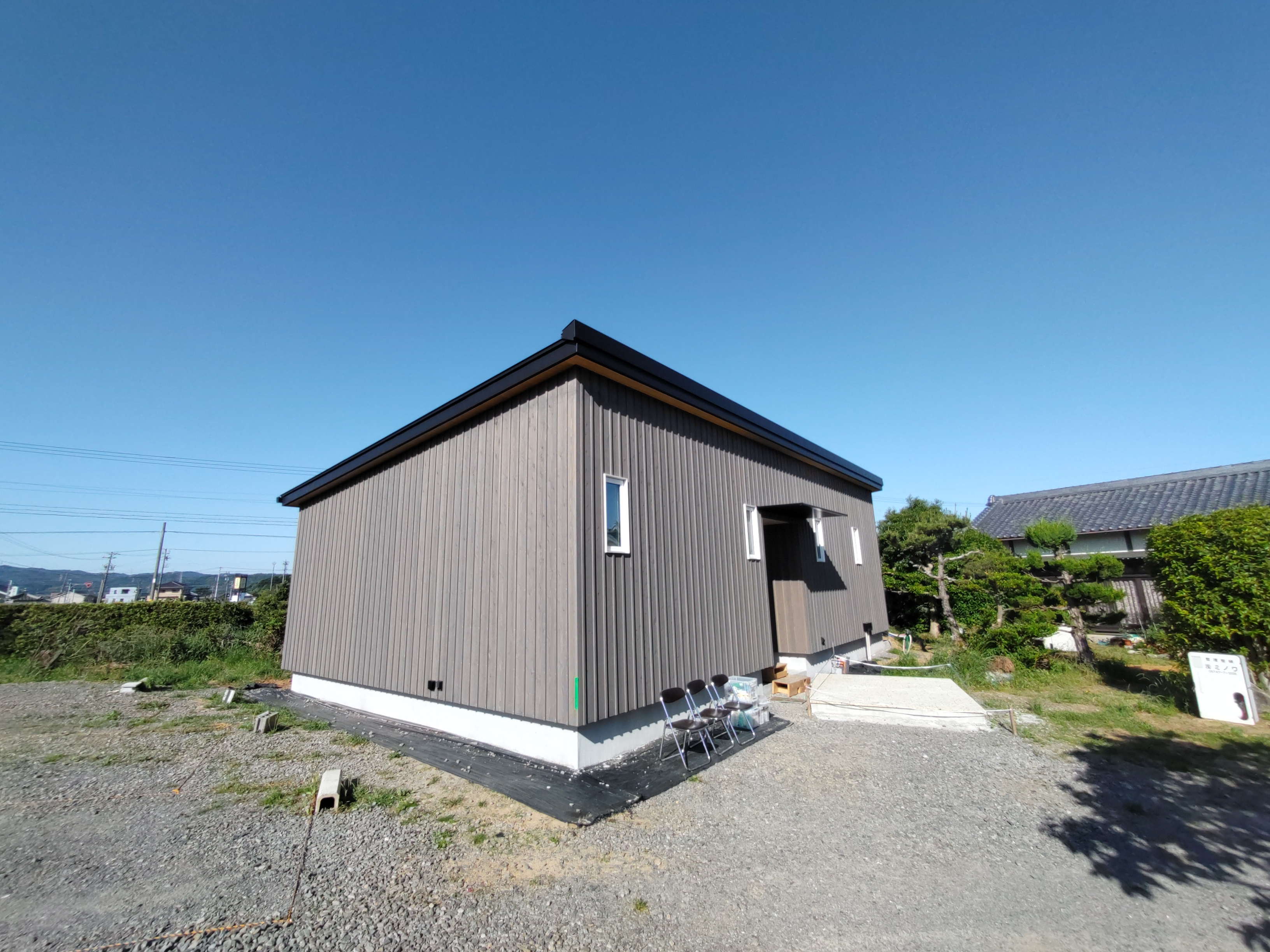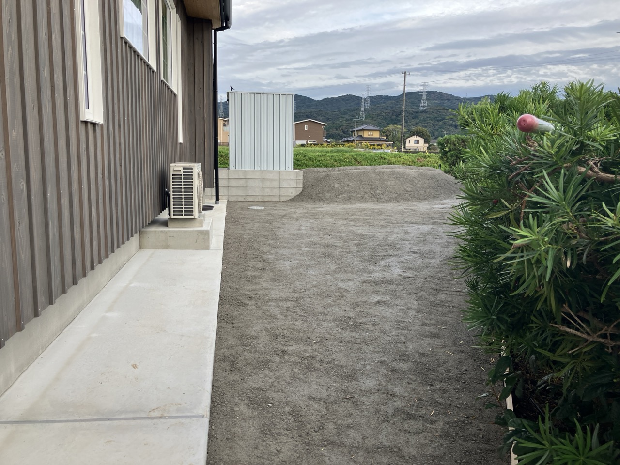 別件で幸田町に用事があり、1か月ぶりに現場へ訪れました。住宅完成後から始まった外構工事の真っ最中。お訪ねしたのが夕方でしたので業者さんは帰った後でしたが、工事の隙間を縫ってお父様はまた何か作業中。庭は全面芝生張りにされるそうですが、そこへ散水スプリンクラーを設けるための井戸からの給水管をDIYで敷設されているとの事。相変わらずマルチタスクなお父様です。芝生の下地のための整地によって施工中に見ていた景色とは一変、かなりすっきりした印象のある庭になっています。これは外構工事完了後の景色が楽しみです。