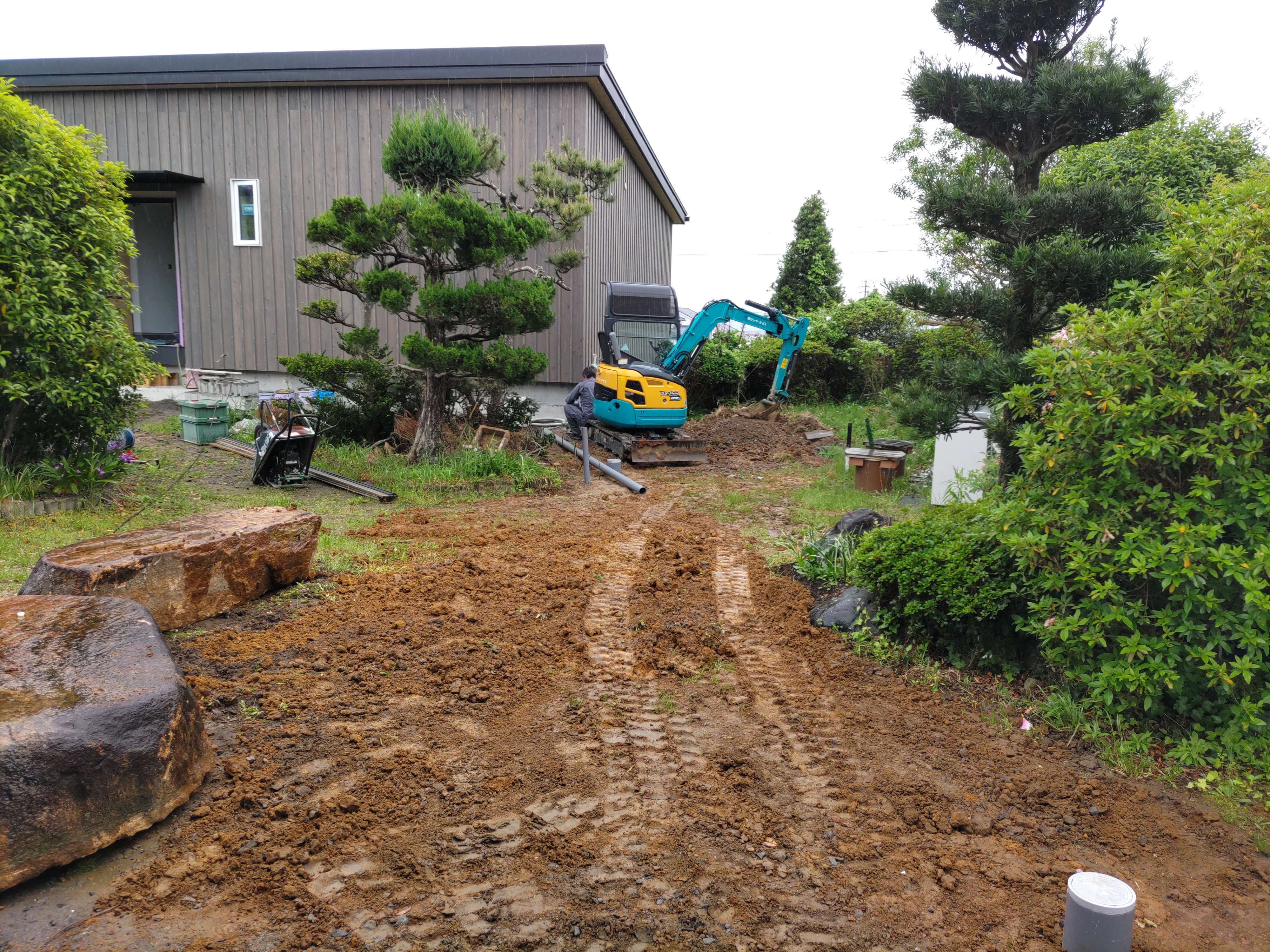 折を見て乗入口の溝埋め作業にもかかります。今日はこの重機が大活躍です。