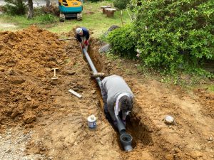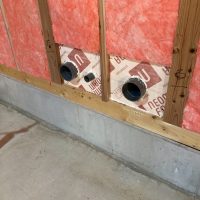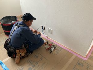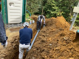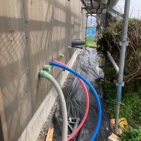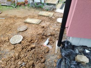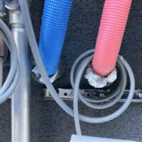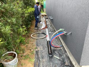 夏場、蒸し暑い中でエアコンを稼働していると、エアコンから排出された水がドレン管を渡っていきますが、床下はコンクリートを打設してまだ半年もたっていない時で分かりにくいですが割合と湿度を持っています。そこを冷たい水が通る配管が横断しているのでうっすらと結露してしまいます。それらを防ぐために断熱保温間巻き工事を行いました。