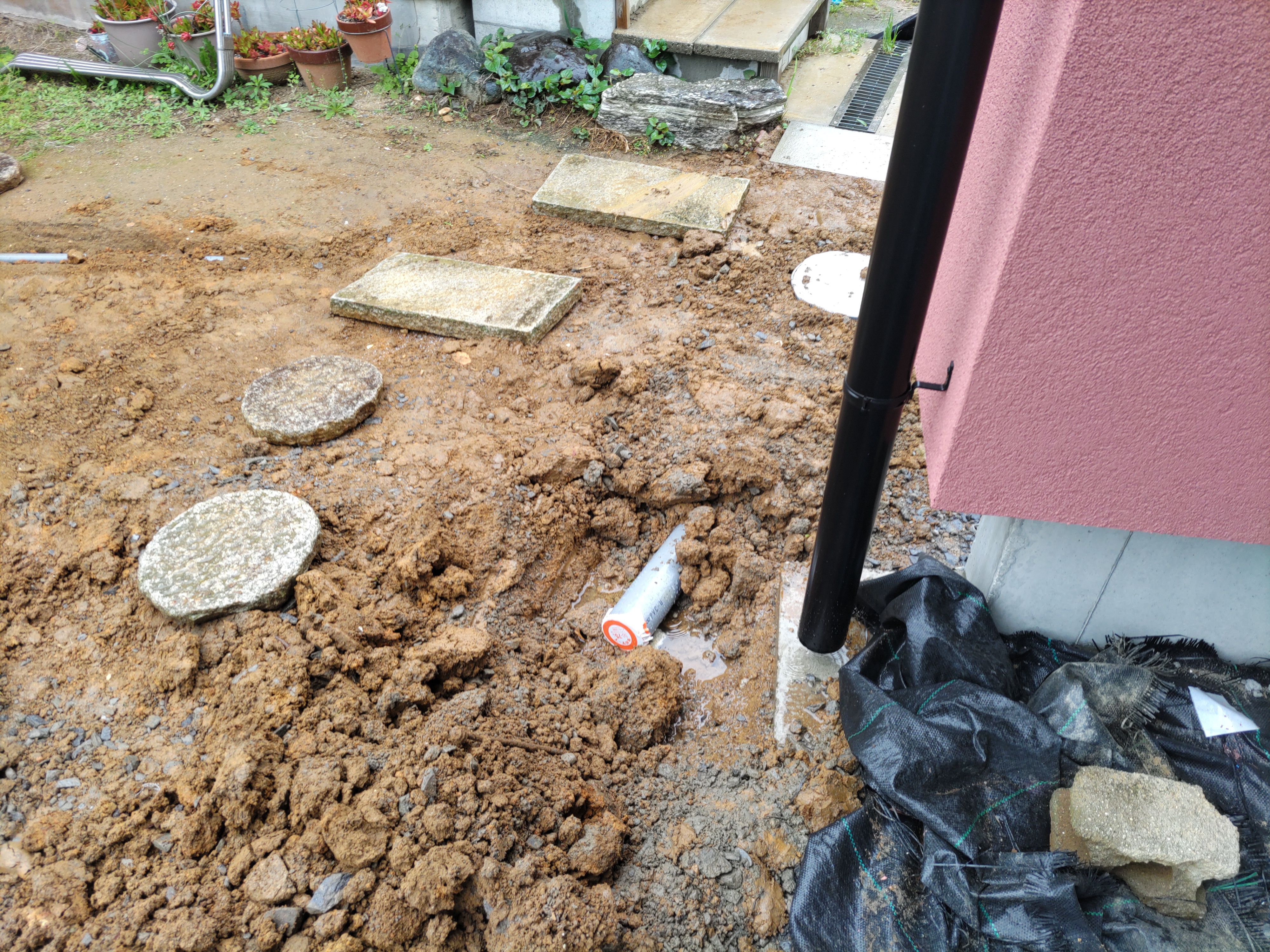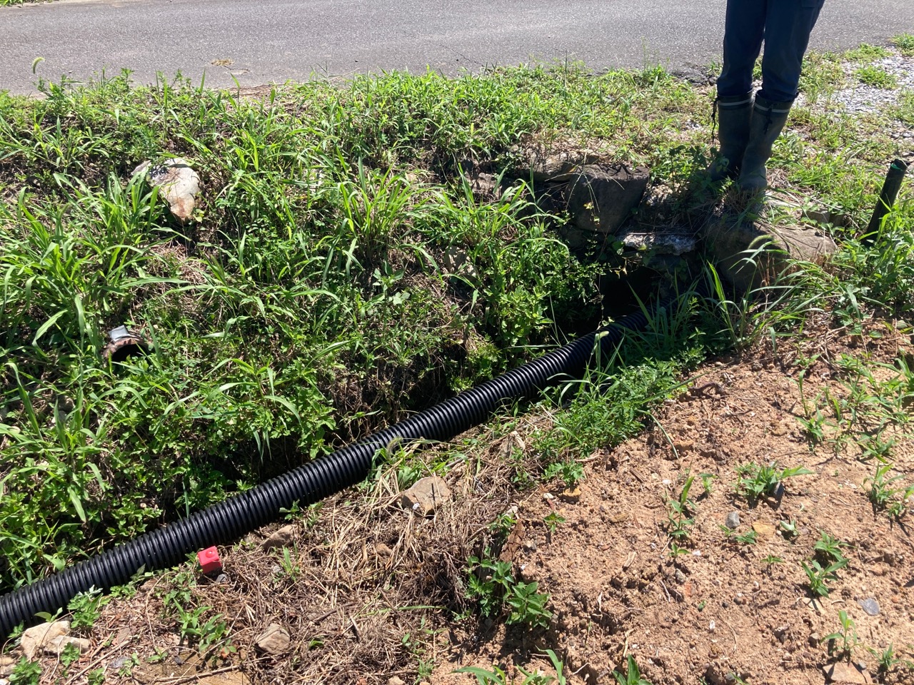 計画している建物が一部敷地への乗入口にかかるので、入口の幅を広げる、という検討をしています。幅を広げると言ってもそこは旧い水路。埋め立てるにあたって透水管が必要になるなあ、とお父様と朝話していて、打ち合わせに行って昼に帰ってきたら早くも実物がありました。『デ●ツーに行って買ってきたよ』と、流石は段取りの素早いお父様です。