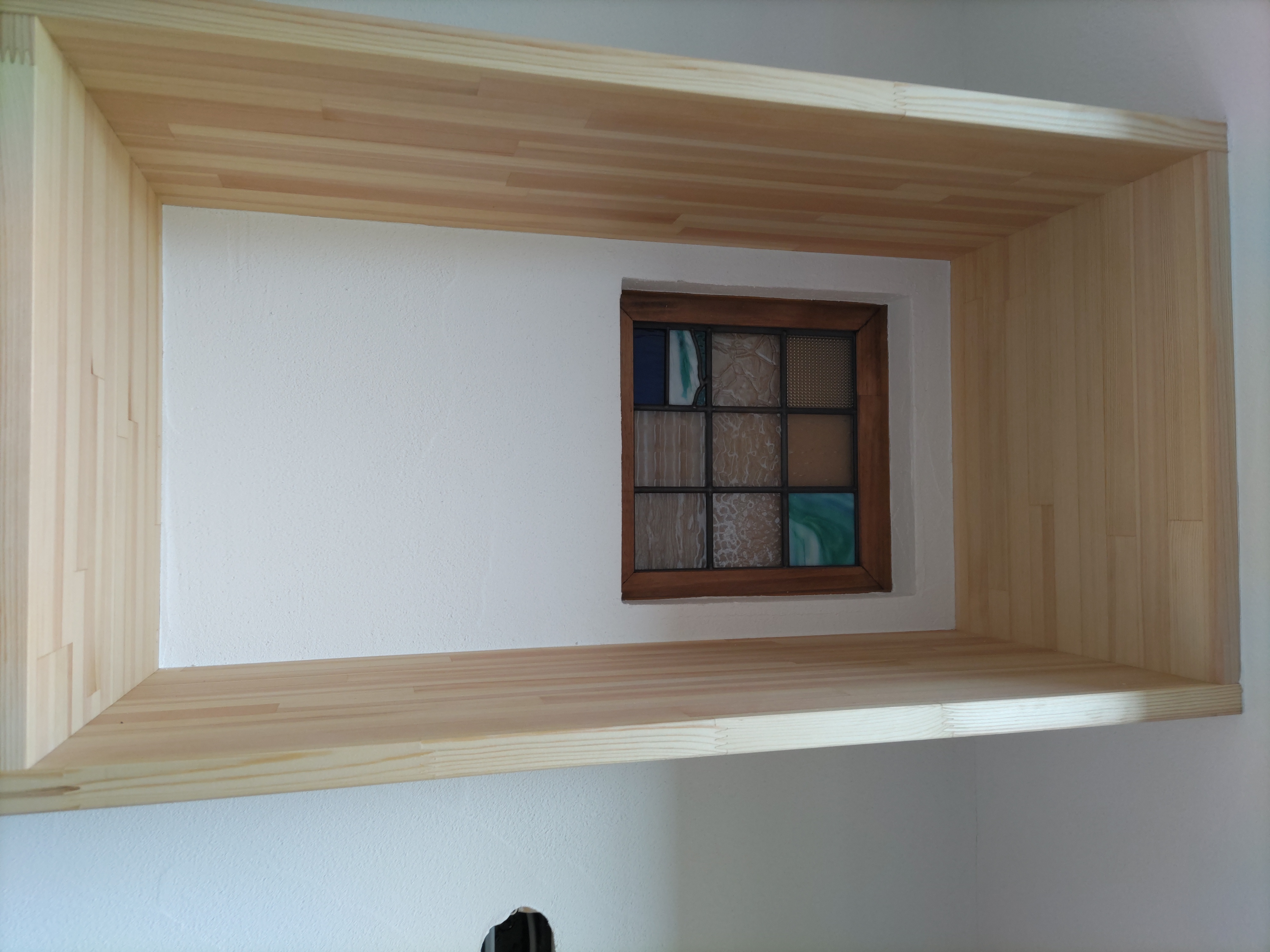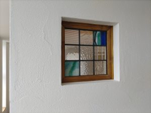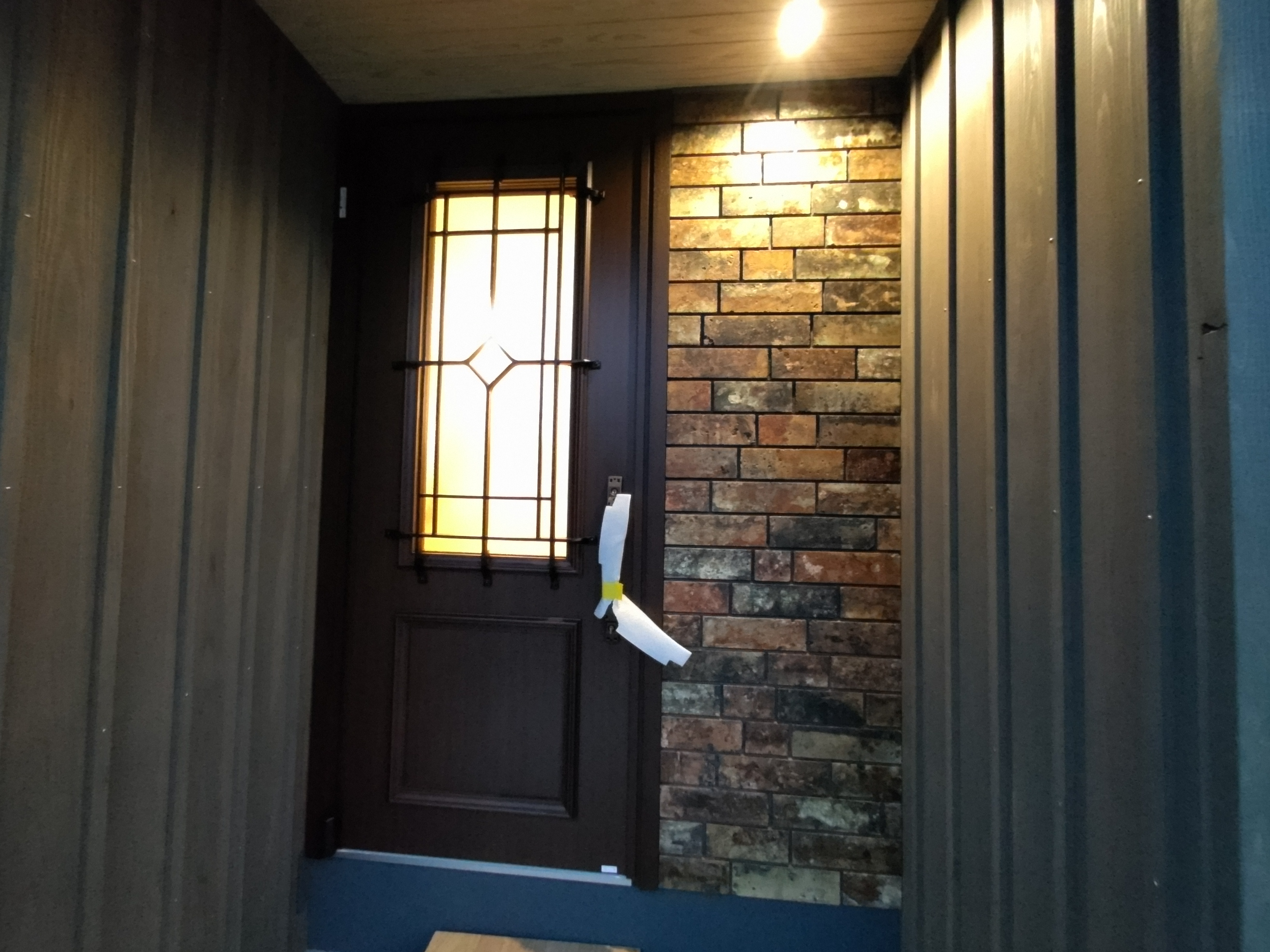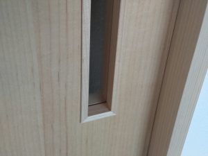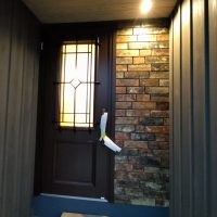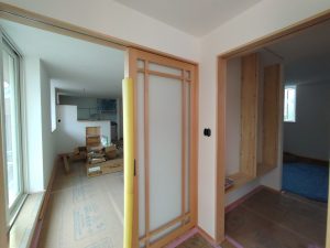 造作工事も佳境に入り、渡り廊下の入り口部分には離れの出入口として鍵付きのドアサッシを取付けました。今までは主屋の玄関からの動線のみで離れそのものは施錠できませんでしたが、これで離れの建物単体で扱う事ができます。