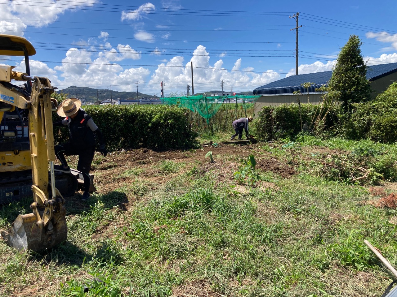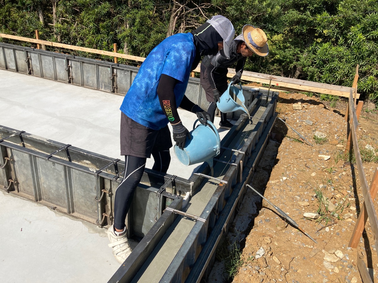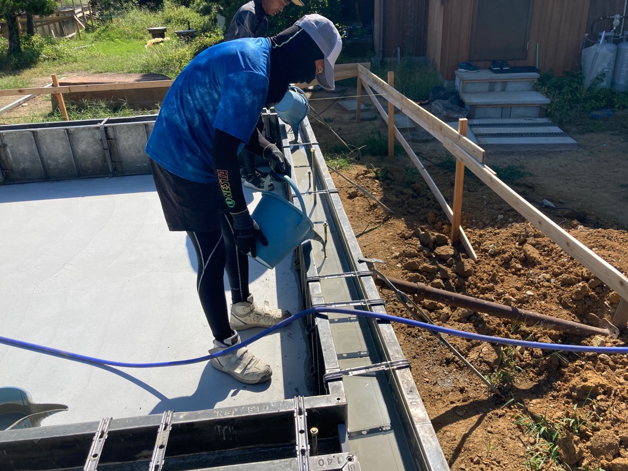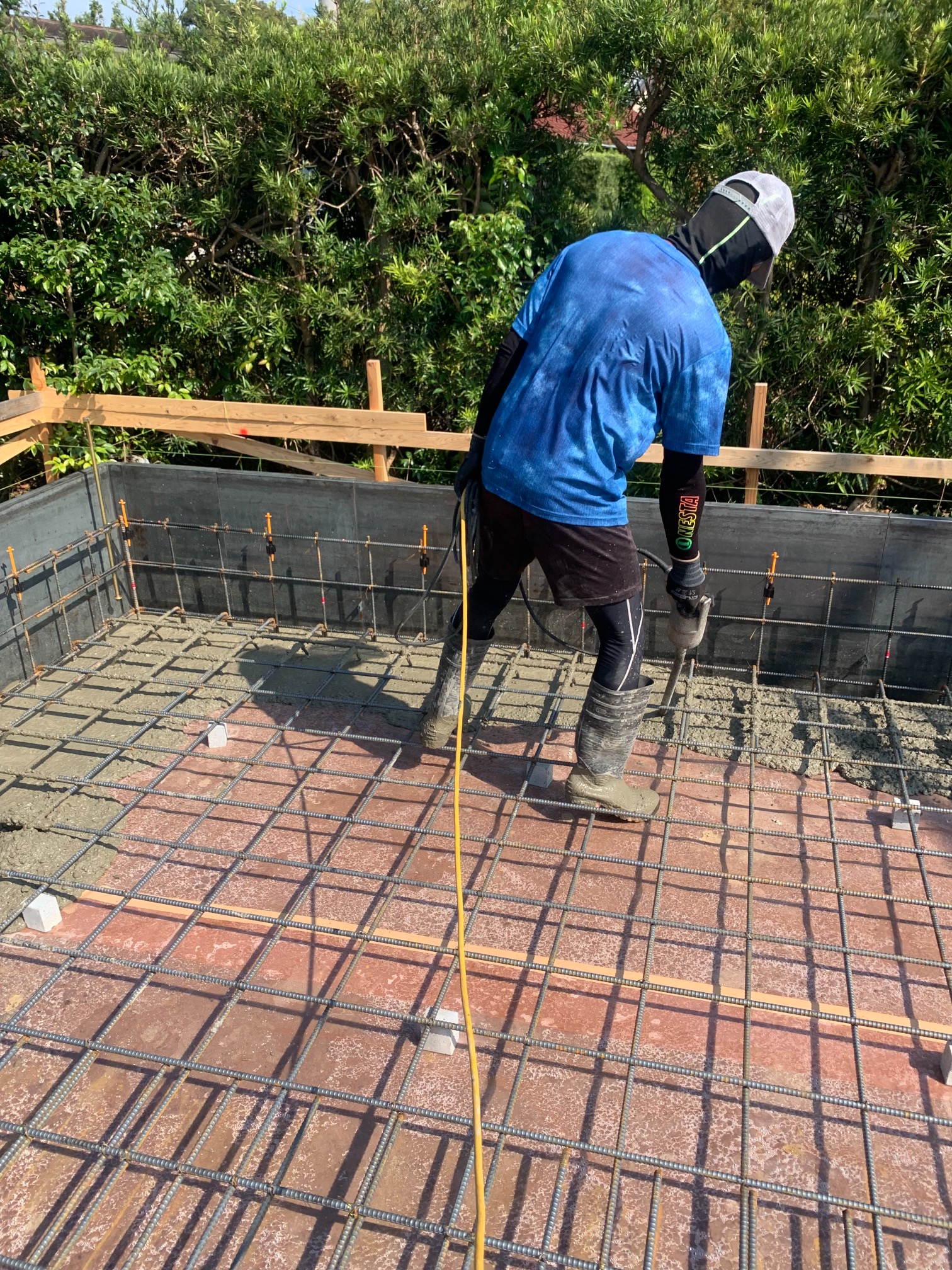 青いシャツに身を包み、キャップを目深に被り、覆面で顔を隠した一見して銀行強盗のようないで立ちで日焼け対策バッチリなこの漢、基礎工事t広さんの息子のy君です。普段は造園業者に勤めていますが、今回は人数が必要なので現場に手伝いに来てもらいました。