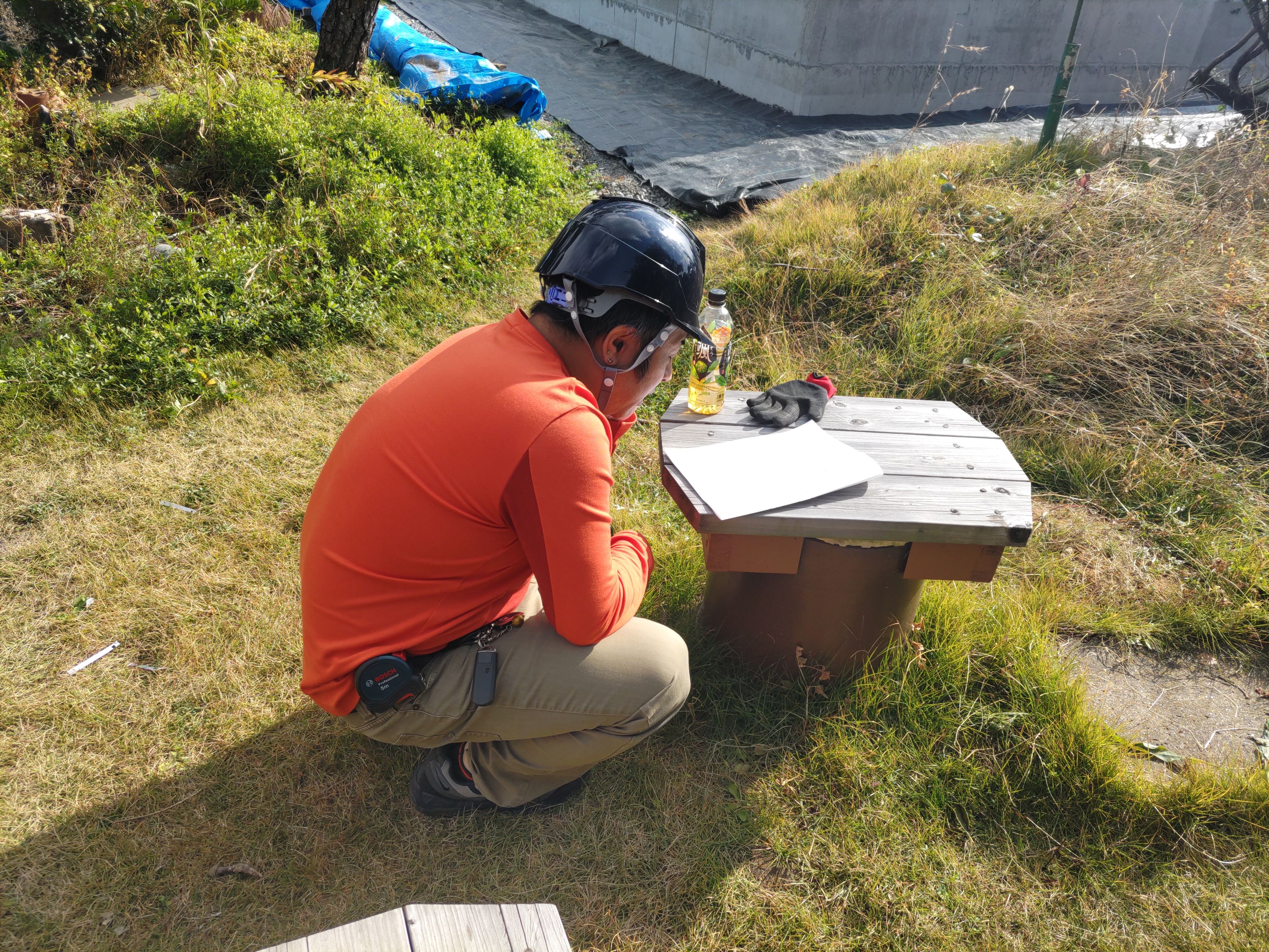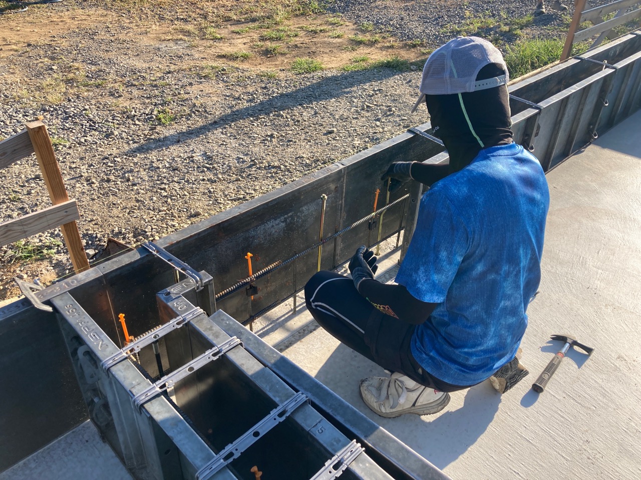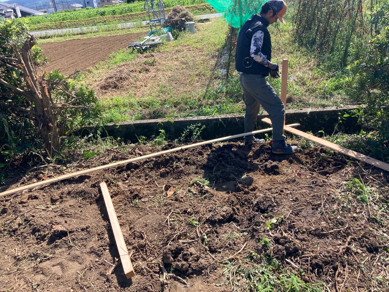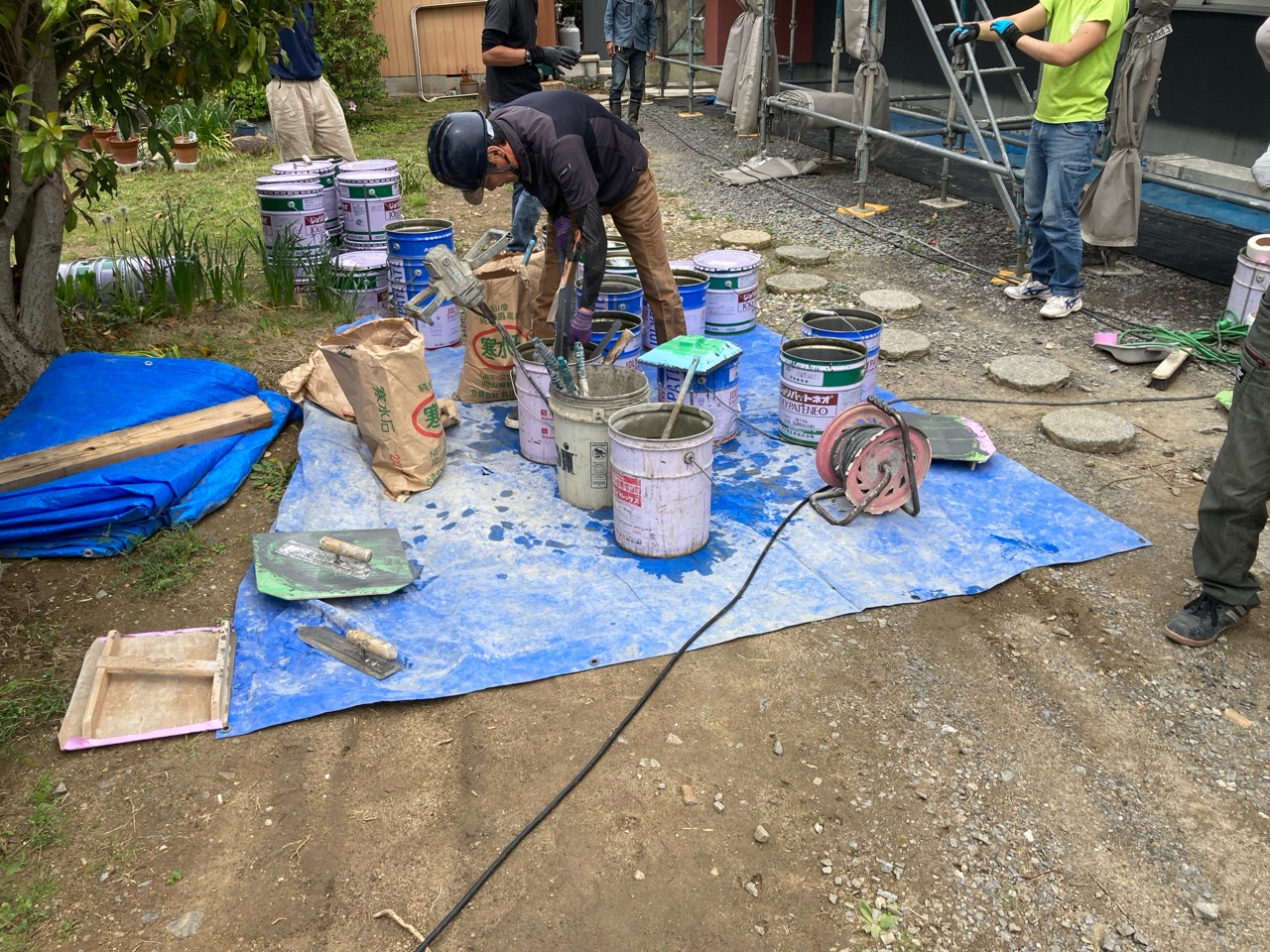 青いシャツに身を包み、キャップを目深に被り、覆面で顔を隠した一見して銀行強盗のようないで立ちで日焼け対策バッチリなこの漢、基礎工事t広さんの息子のy君です。普段は造園業者に勤めていますが、今回は人数が必要なので現場に手伝いに来てもらいました。