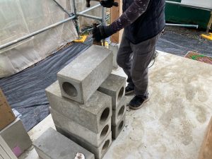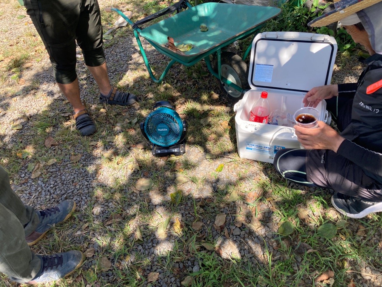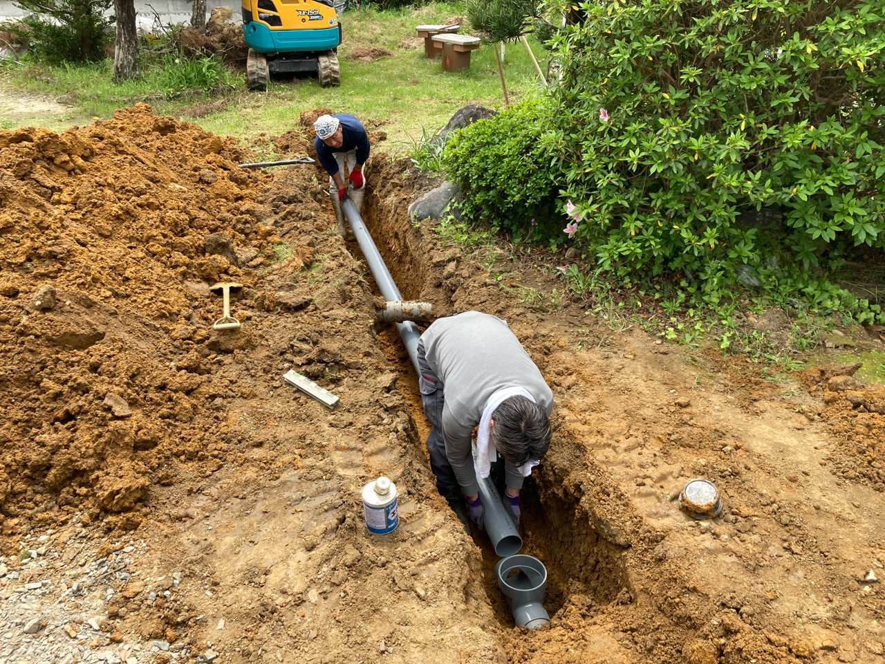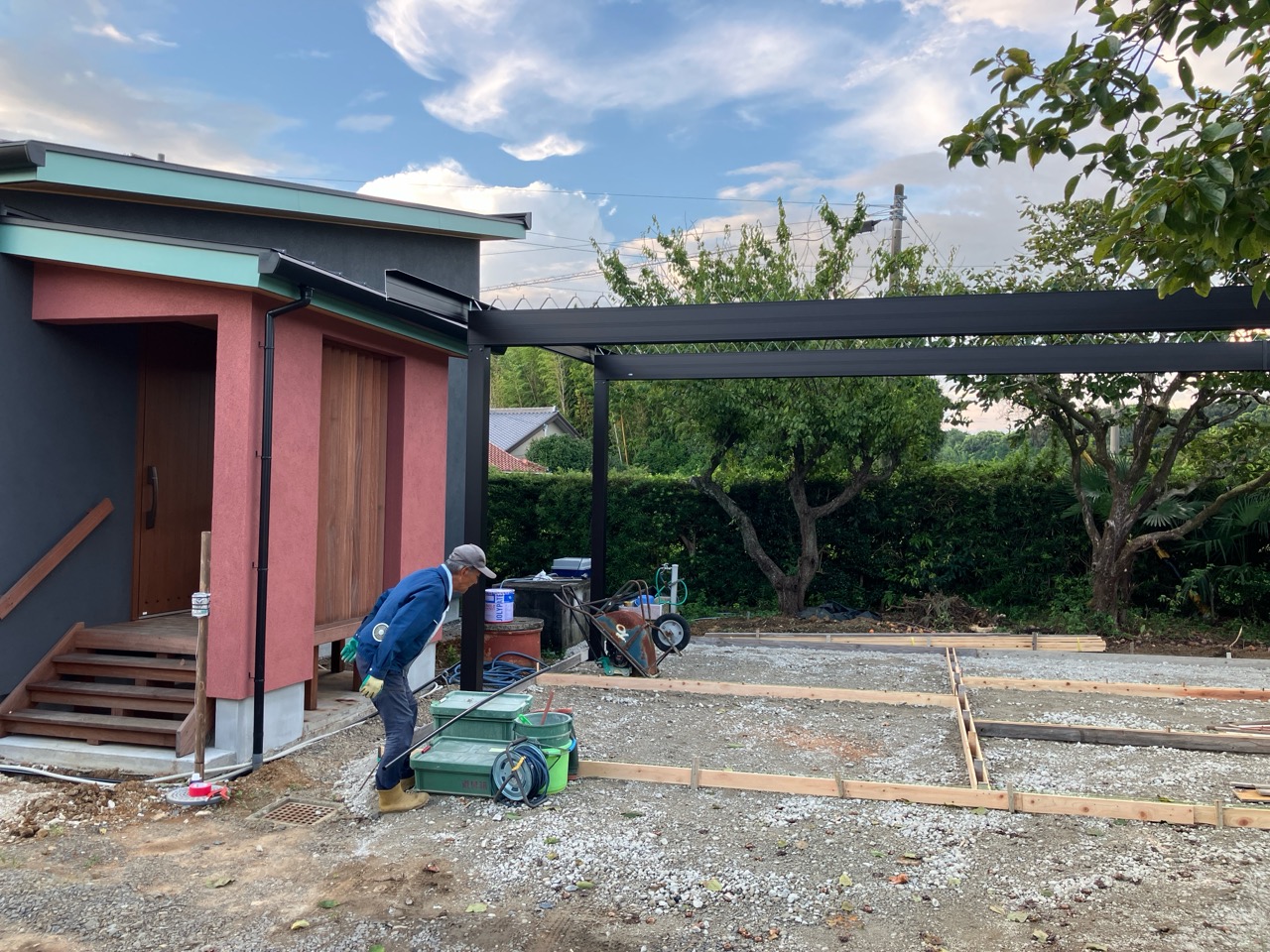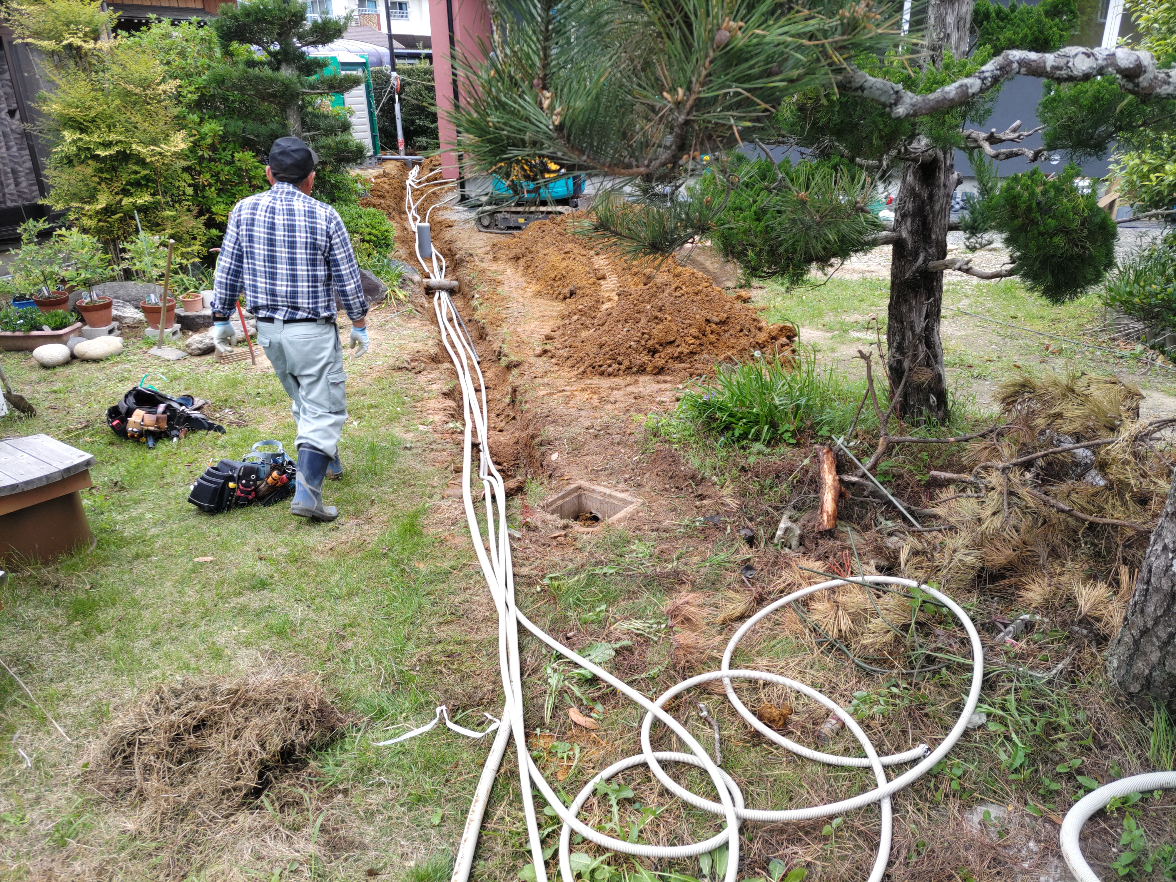青いシャツに身を包み、キャップを目深に被り、覆面で顔を隠した一見して銀行強盗のようないで立ちで日焼け対策バッチリなこの漢、基礎工事t広さんの息子のy君です。普段は造園業者に勤めていますが、今回は人数が必要なので現場に手伝いに来てもらいました。