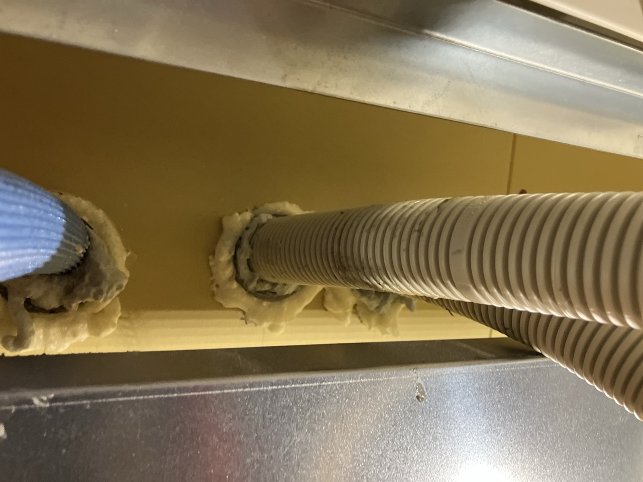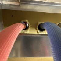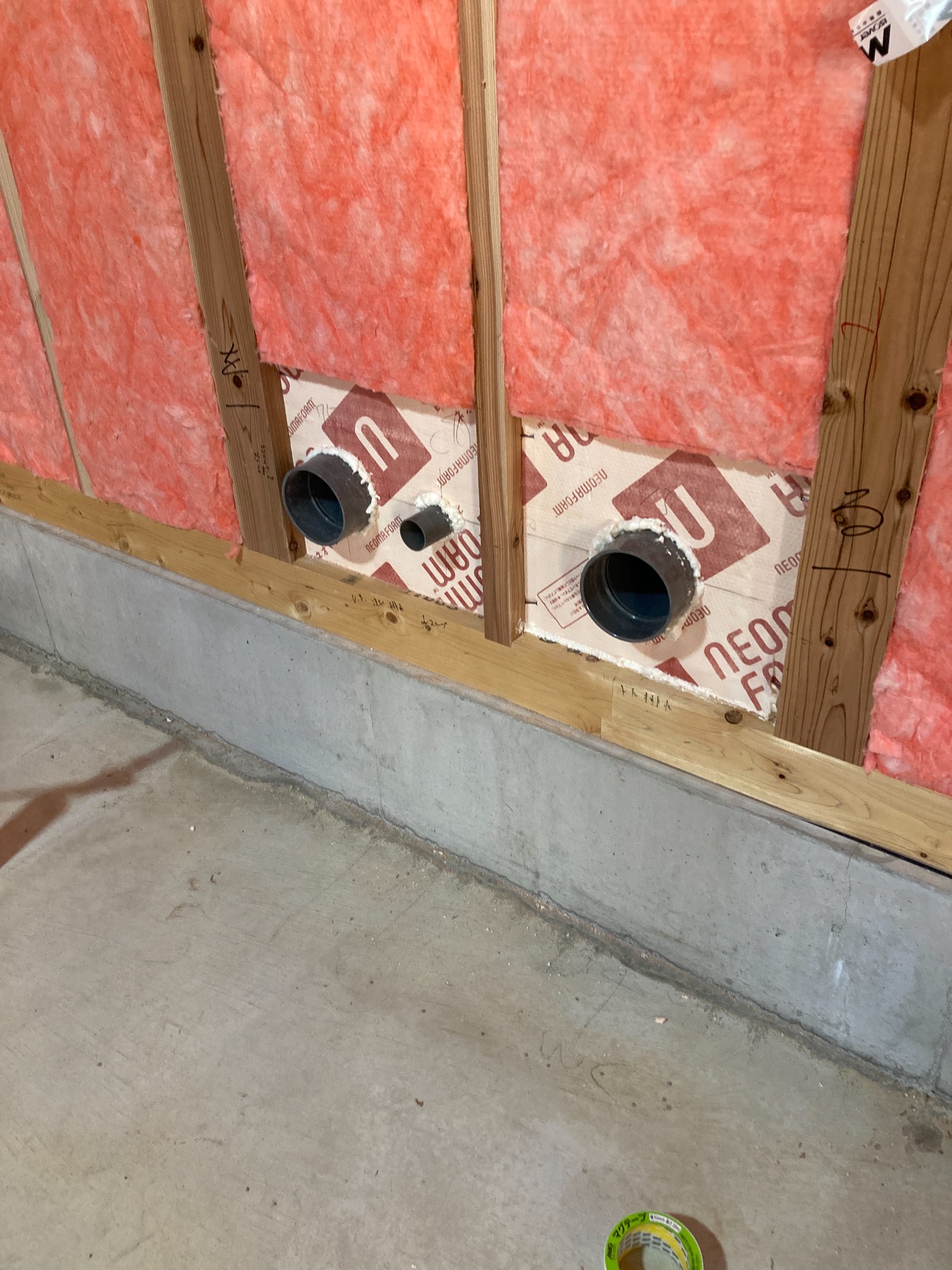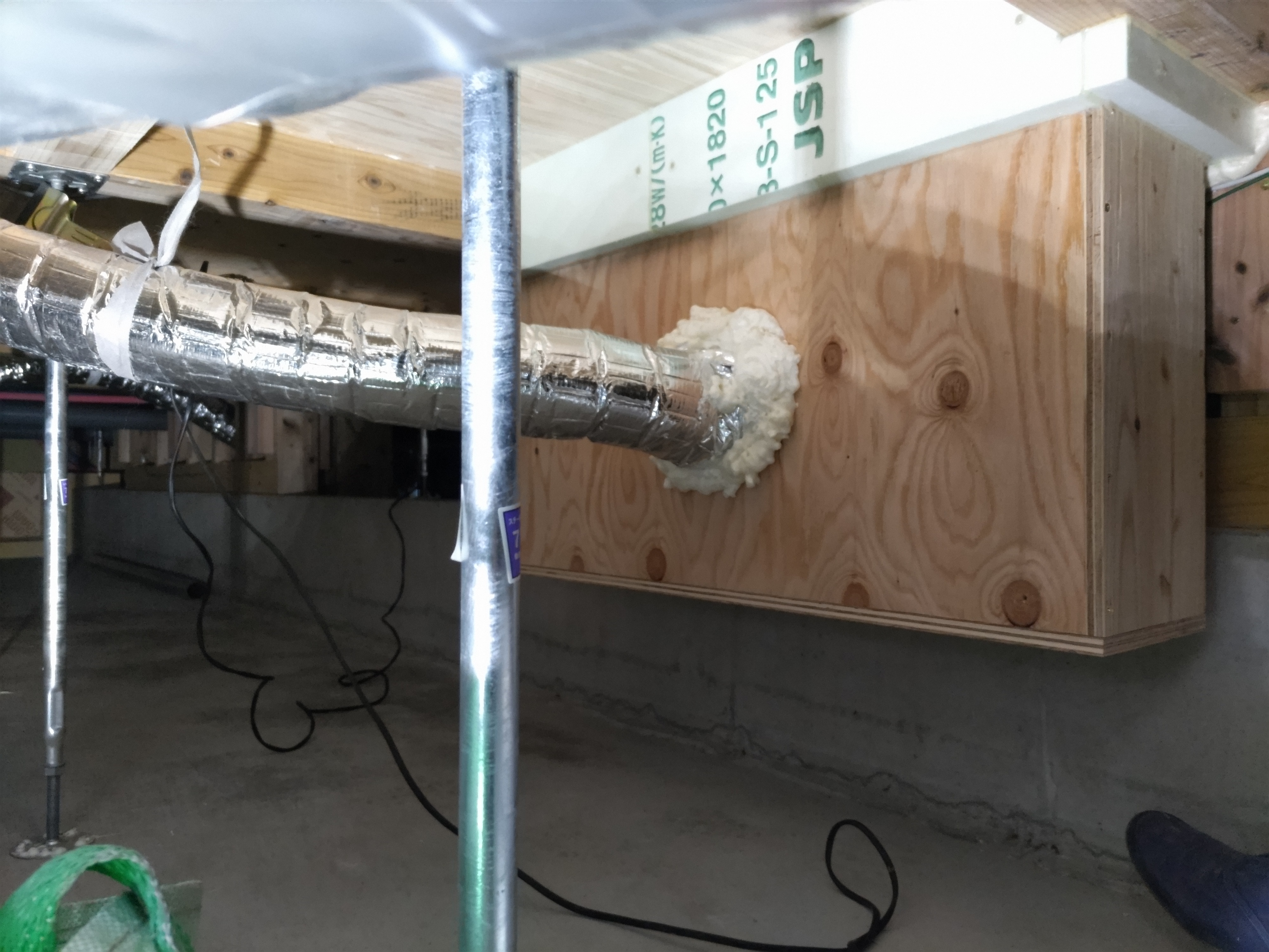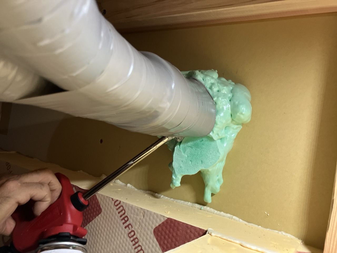 本日は昨年の施工時に外壁貫通スリーブへの配管が挿入してある部分に一部気密充填忘れが発見されたため、ウレタン吹付で充填作業を行いました。乾燥機を使用する際に排湿によって屋内が負圧となる際、何となく外部から冷気が入ってくるな、と感じたところから気付かれたとの事です。その他電気配線スリーブなども補強で充填。床下、天井裏を一回り再チェックしました。y様、大変ご迷惑をおかけしました。