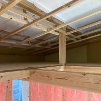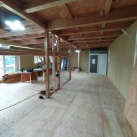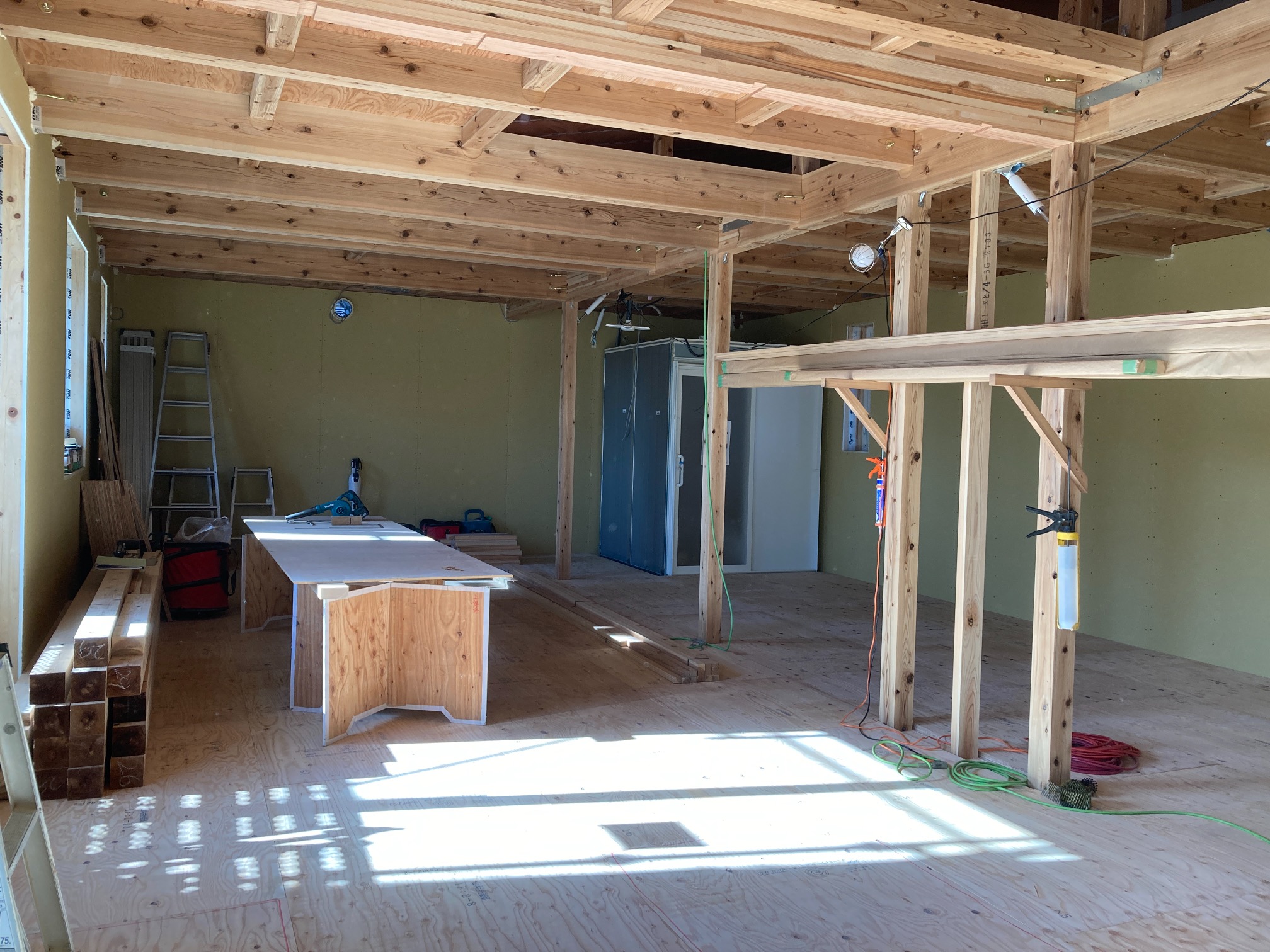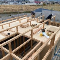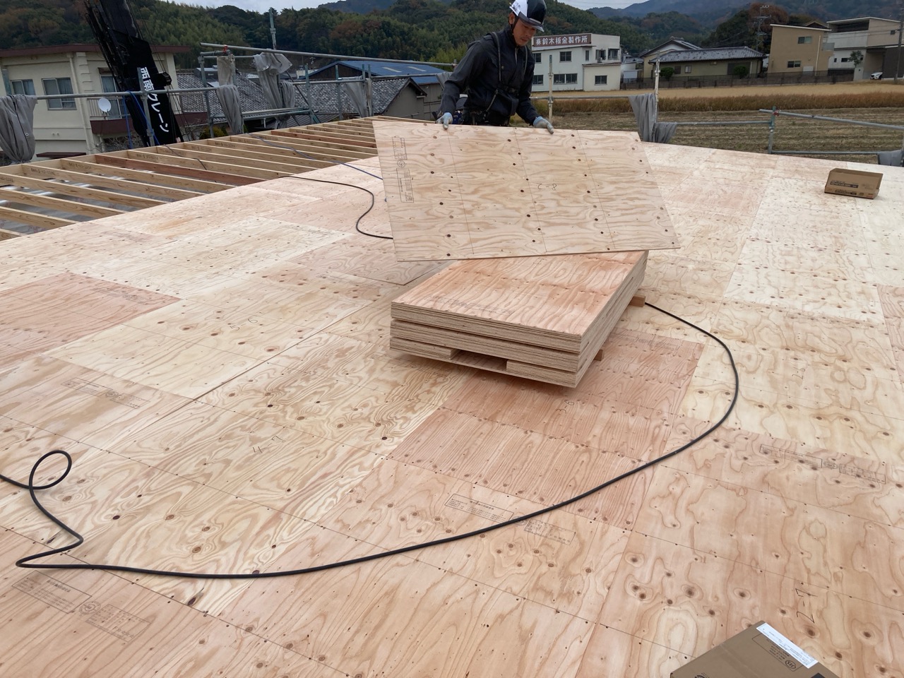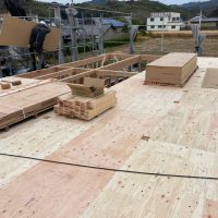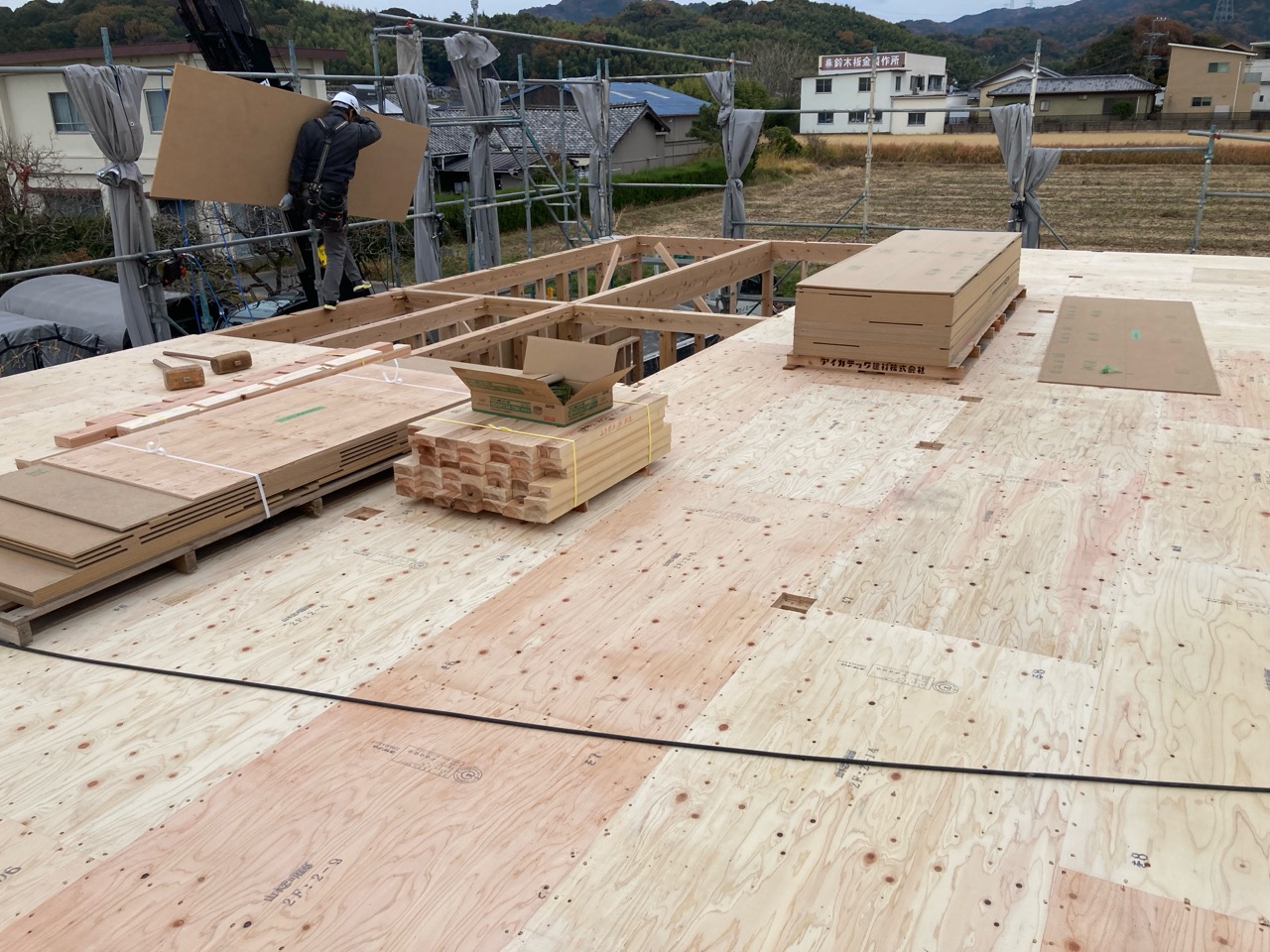 水平構面である床合板を張り始めました。その後小屋束を建て母屋を掛けています。平屋建ですが、小屋裏部分に一部収納を造ります。水平構面があれば小屋裏の床下地を兼ねる事ができます。