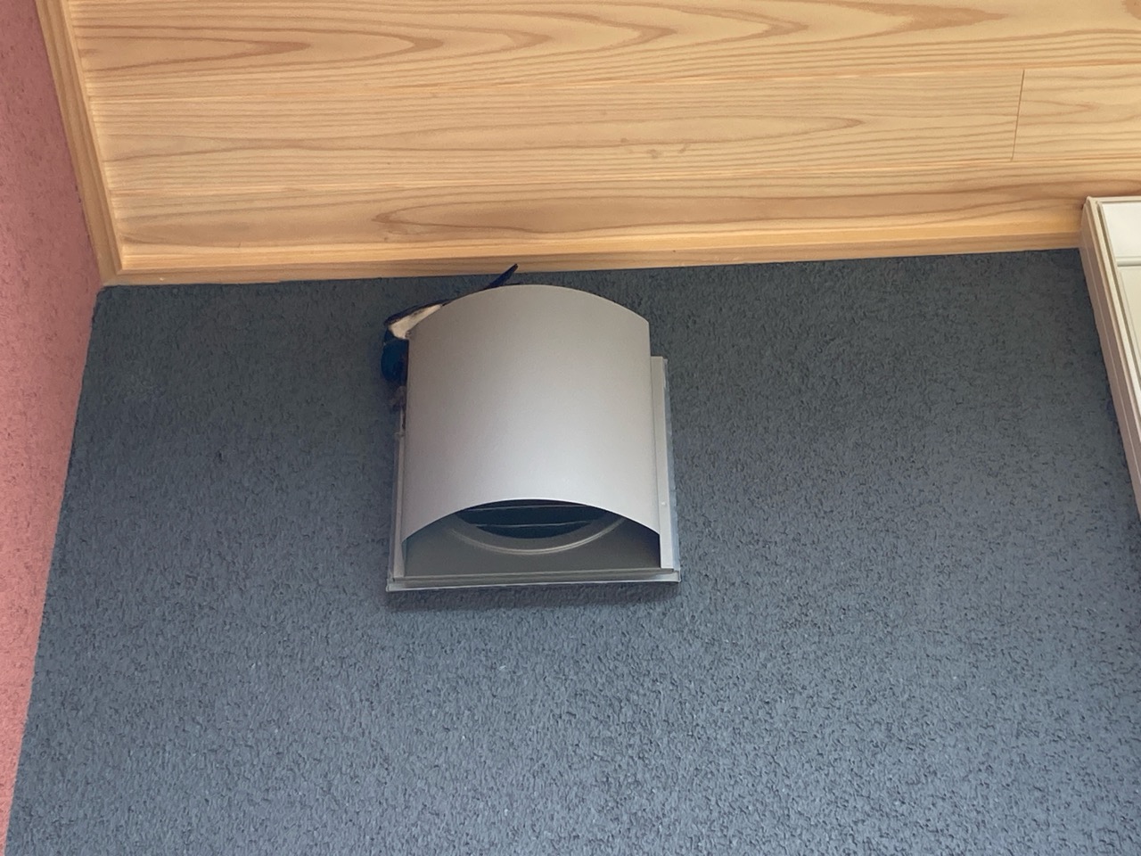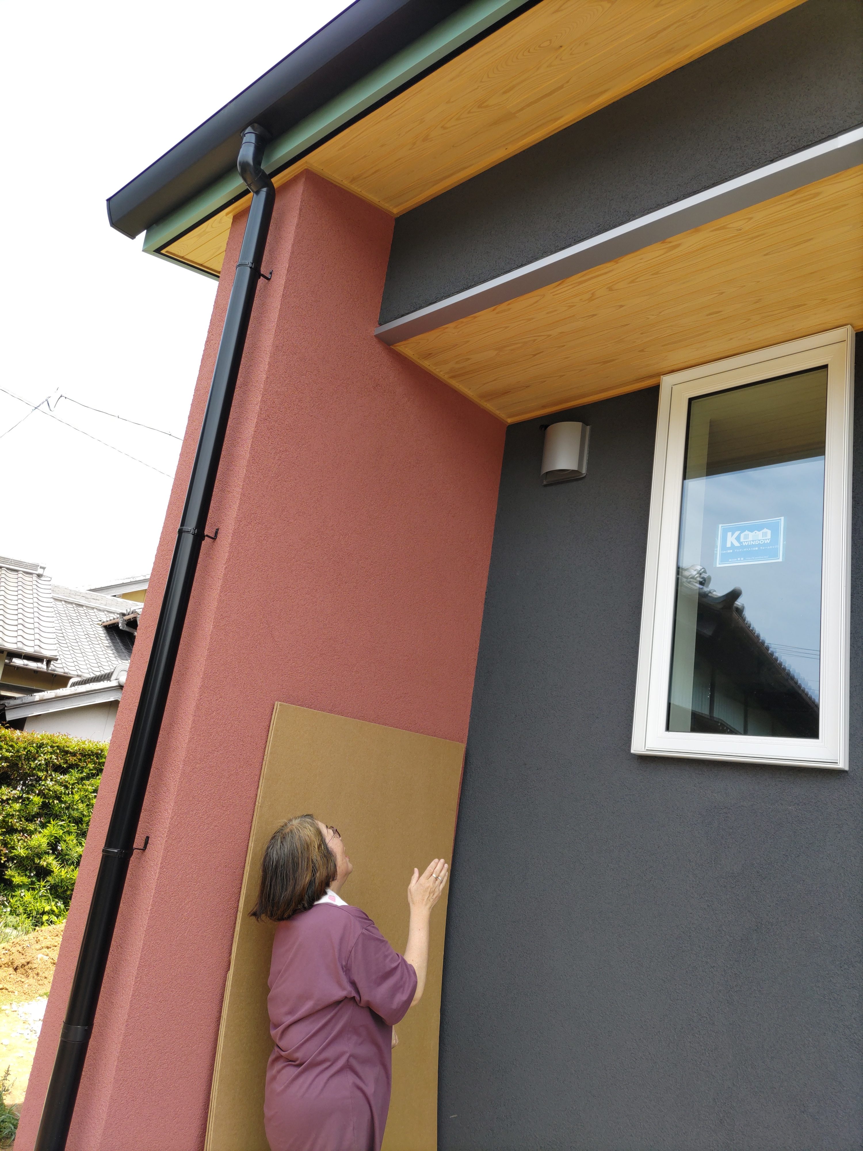 北世帯の給気用フードの上に「良いところに巣が掛けれそうな場所があったぞ」とばかりにとまっている燕に、お母様が「新しい家だから~」と声をかけているところです。