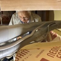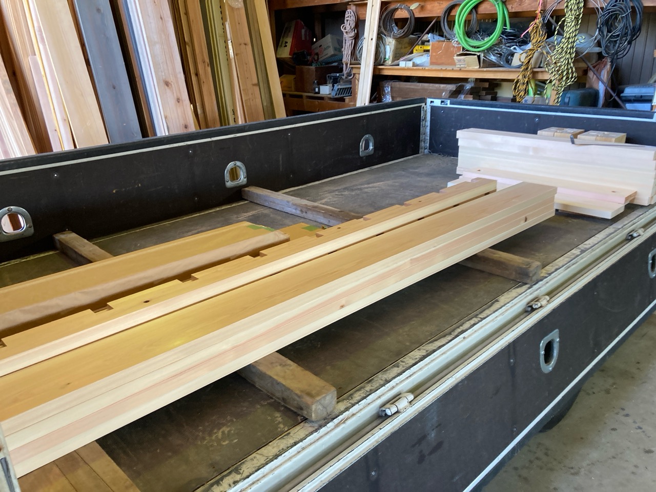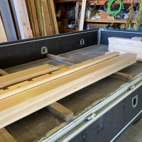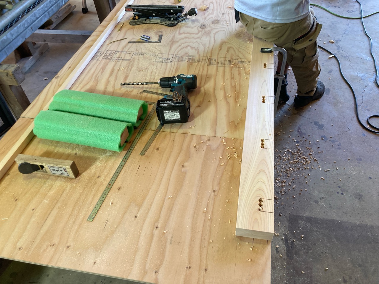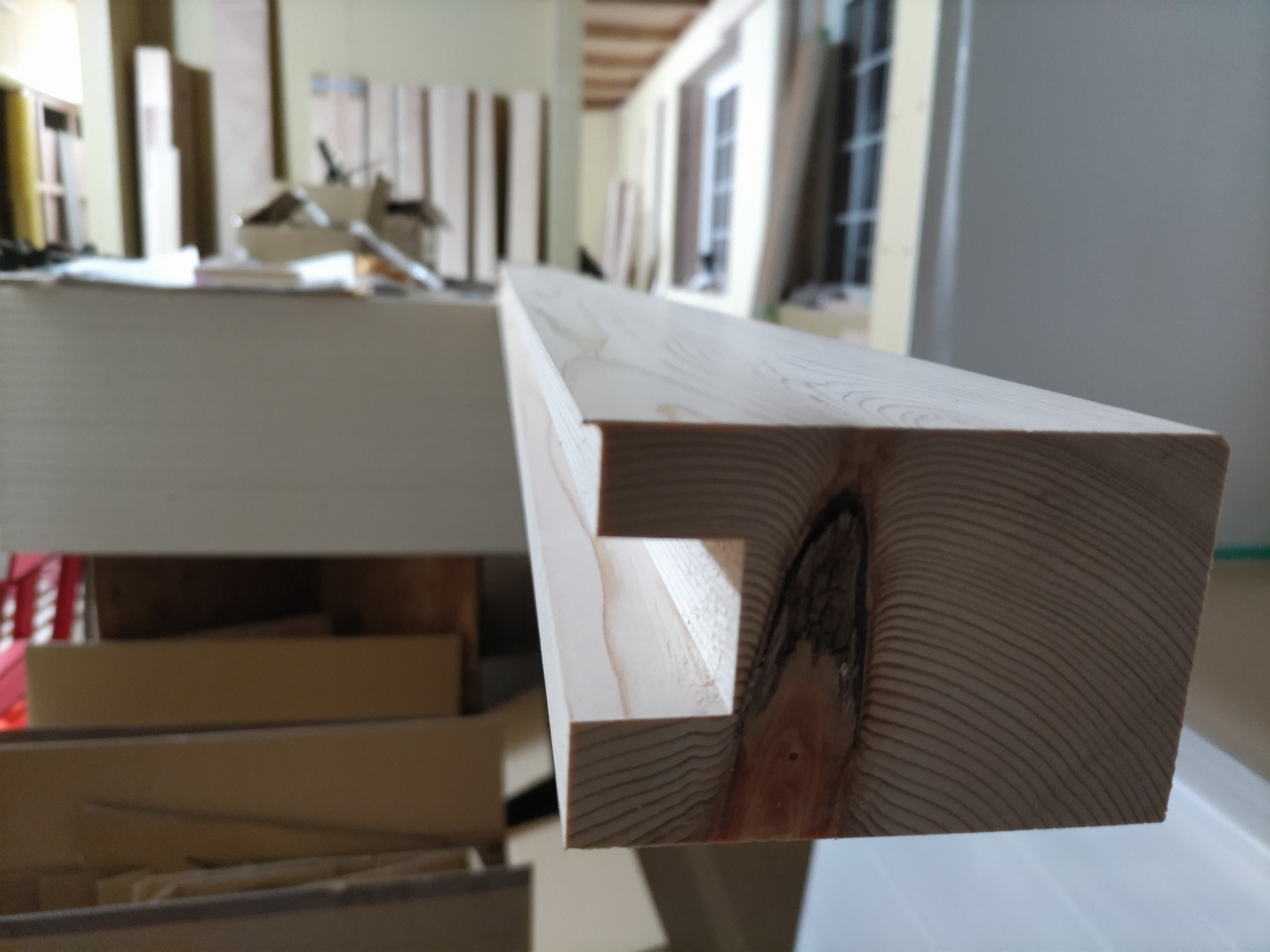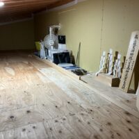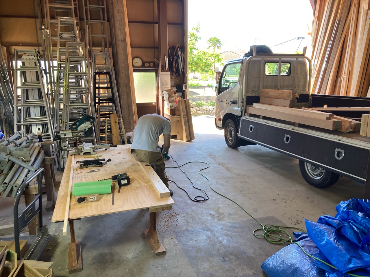 本日はk保木棟梁は現場から遠く離れた事務所の倉庫内で材料加工の真っ最中。むせかえるようなヒノキの香り。カンナをあてられて肌理の艶めく桧の化粧材。一体何を造っているのでしょうか。もう少しで分かります。
