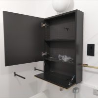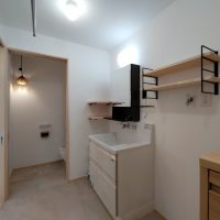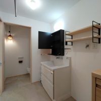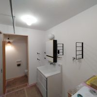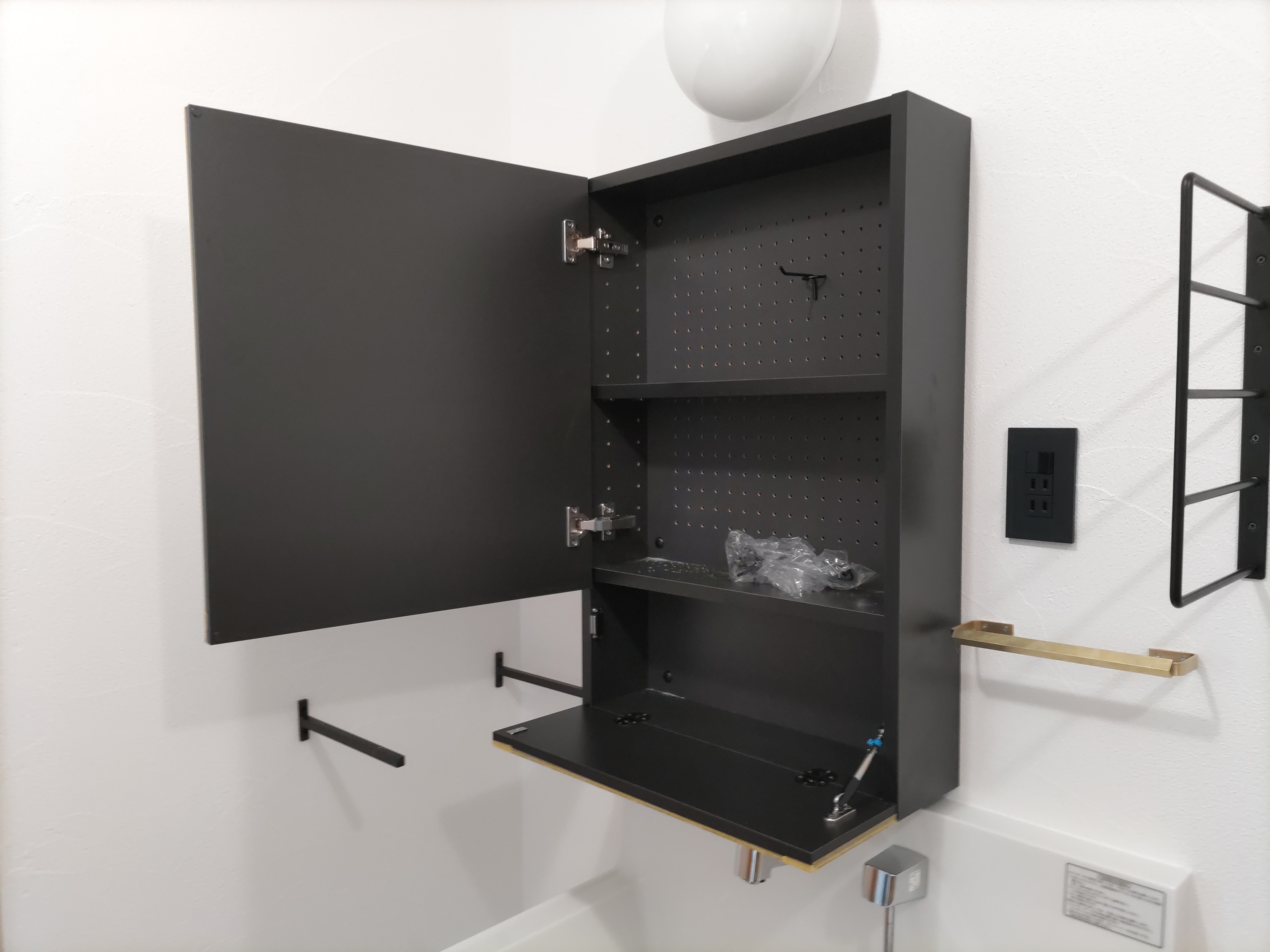 脱衣室のミラーキャビネット、棚受けブラケット、タオル掛け、物干金物等もy様厳選のもの。各部品の取付位置に至るまで細かくお打合せをして取付けました。