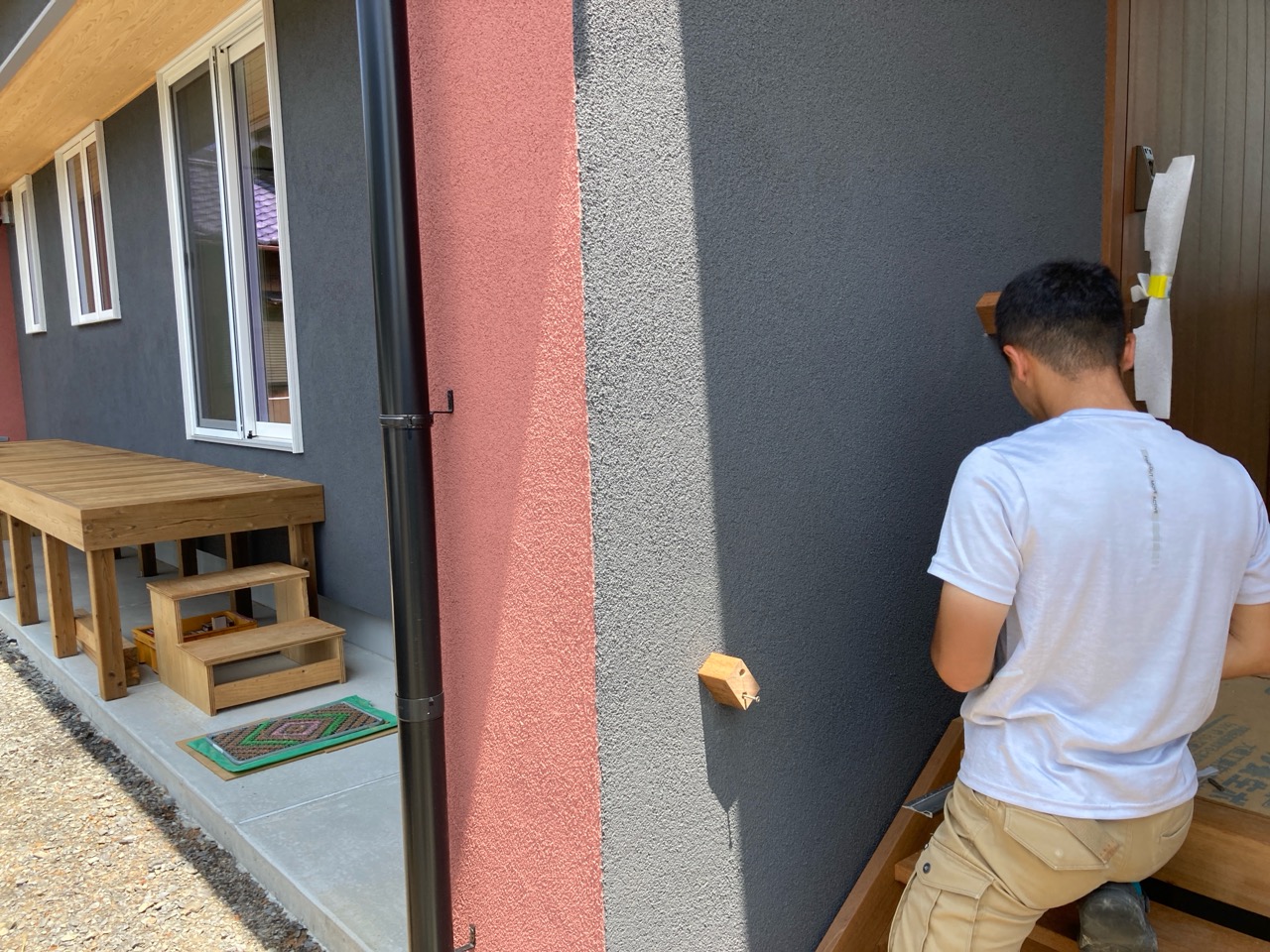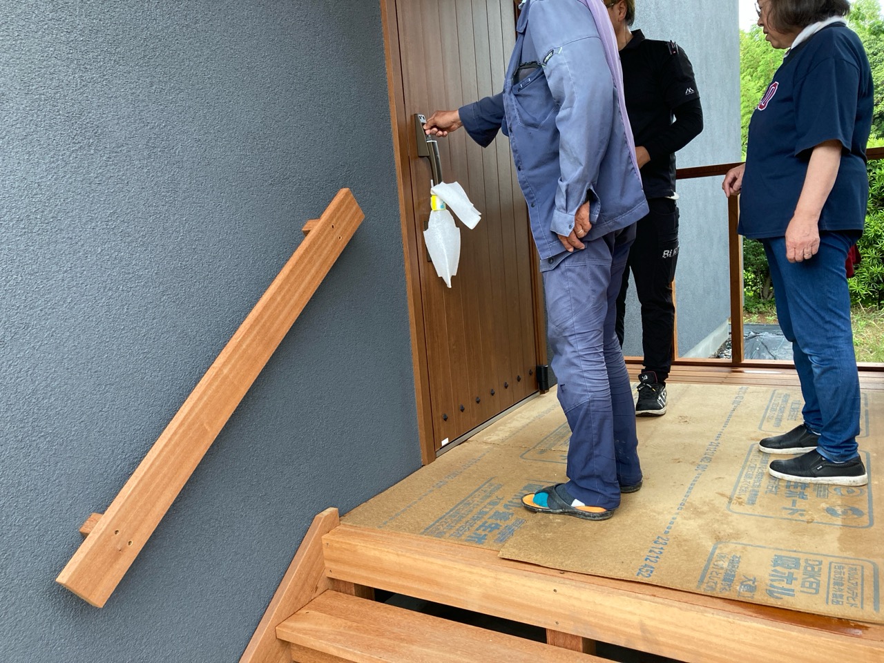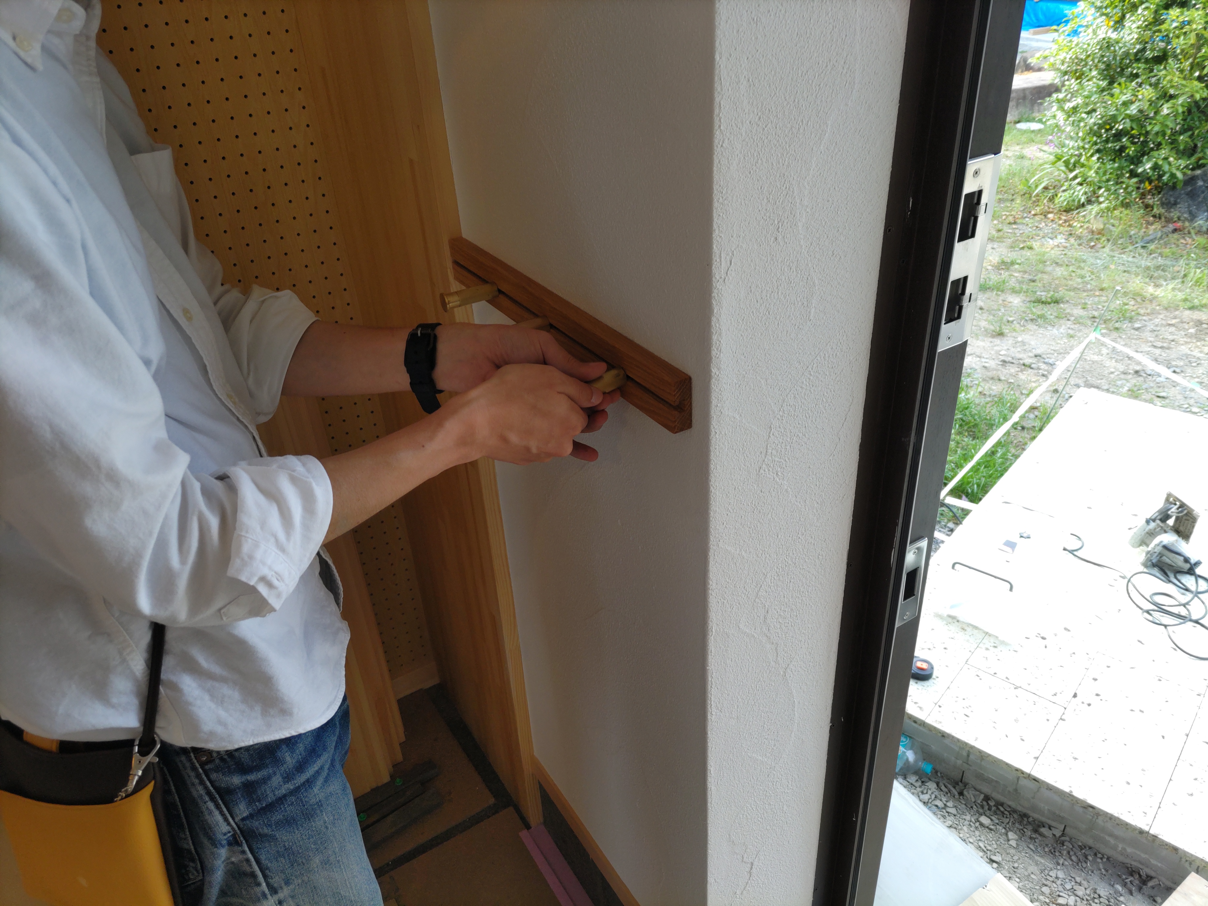 またk保木棟梁は先日据え付けた玄関のデッキ階段用の手摺を外壁面に据え付ける作業にかかりました。少しの段差でも手が添えられる部分があると安心です。