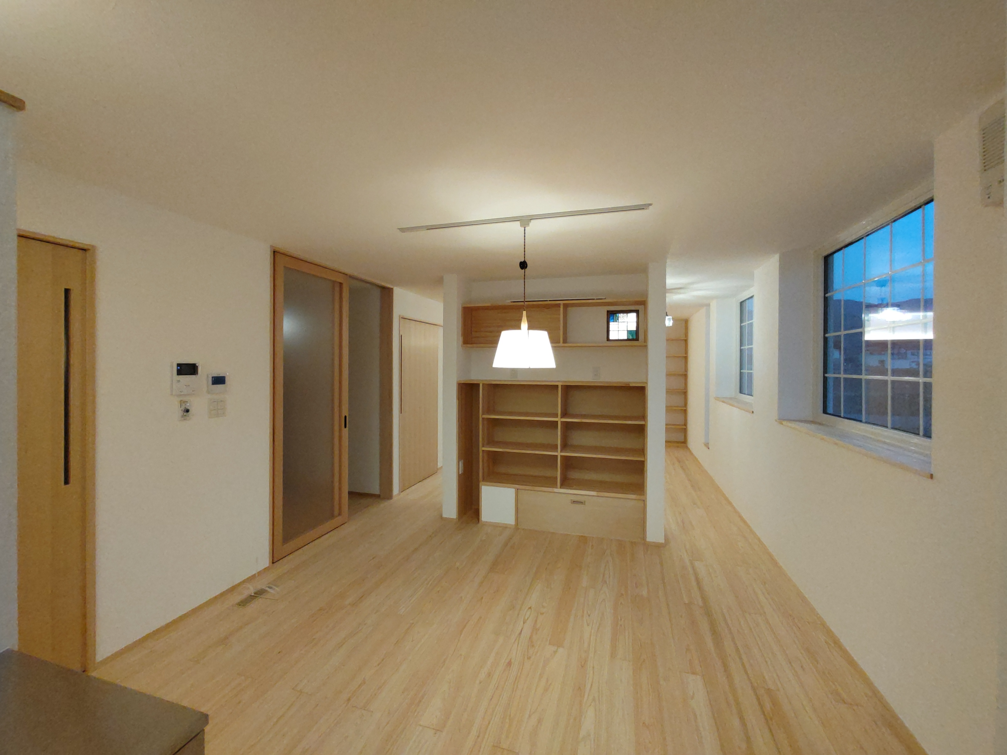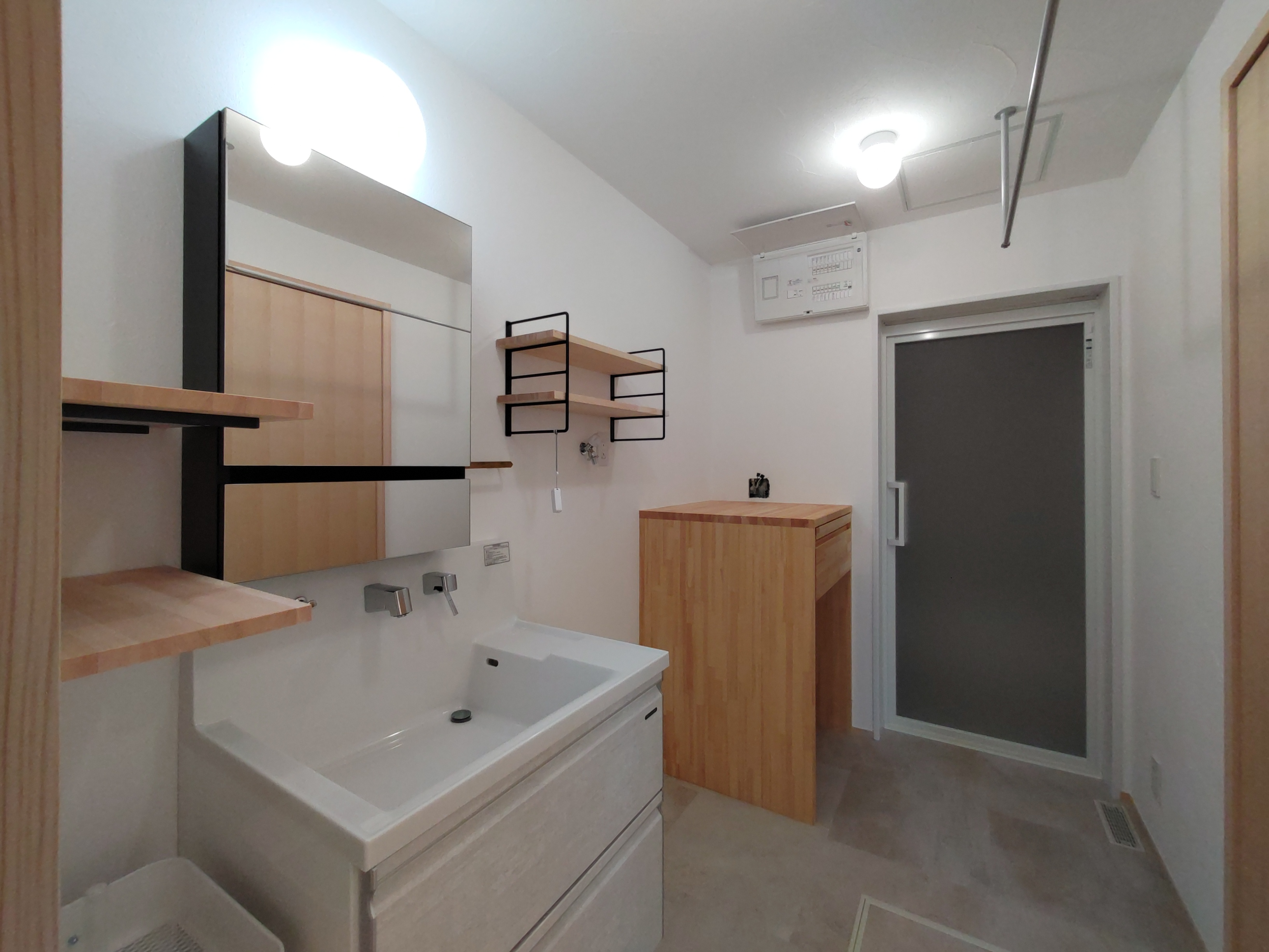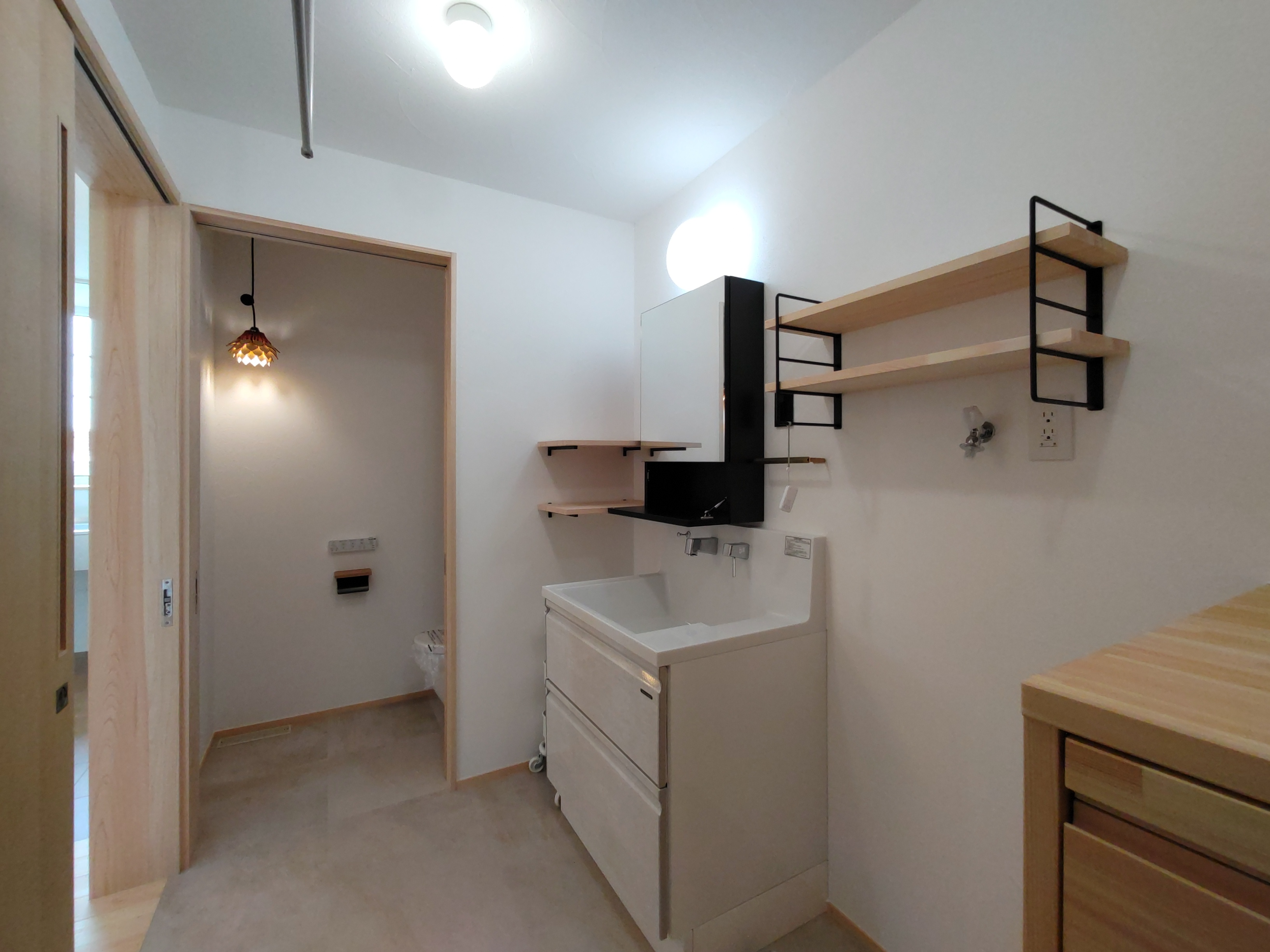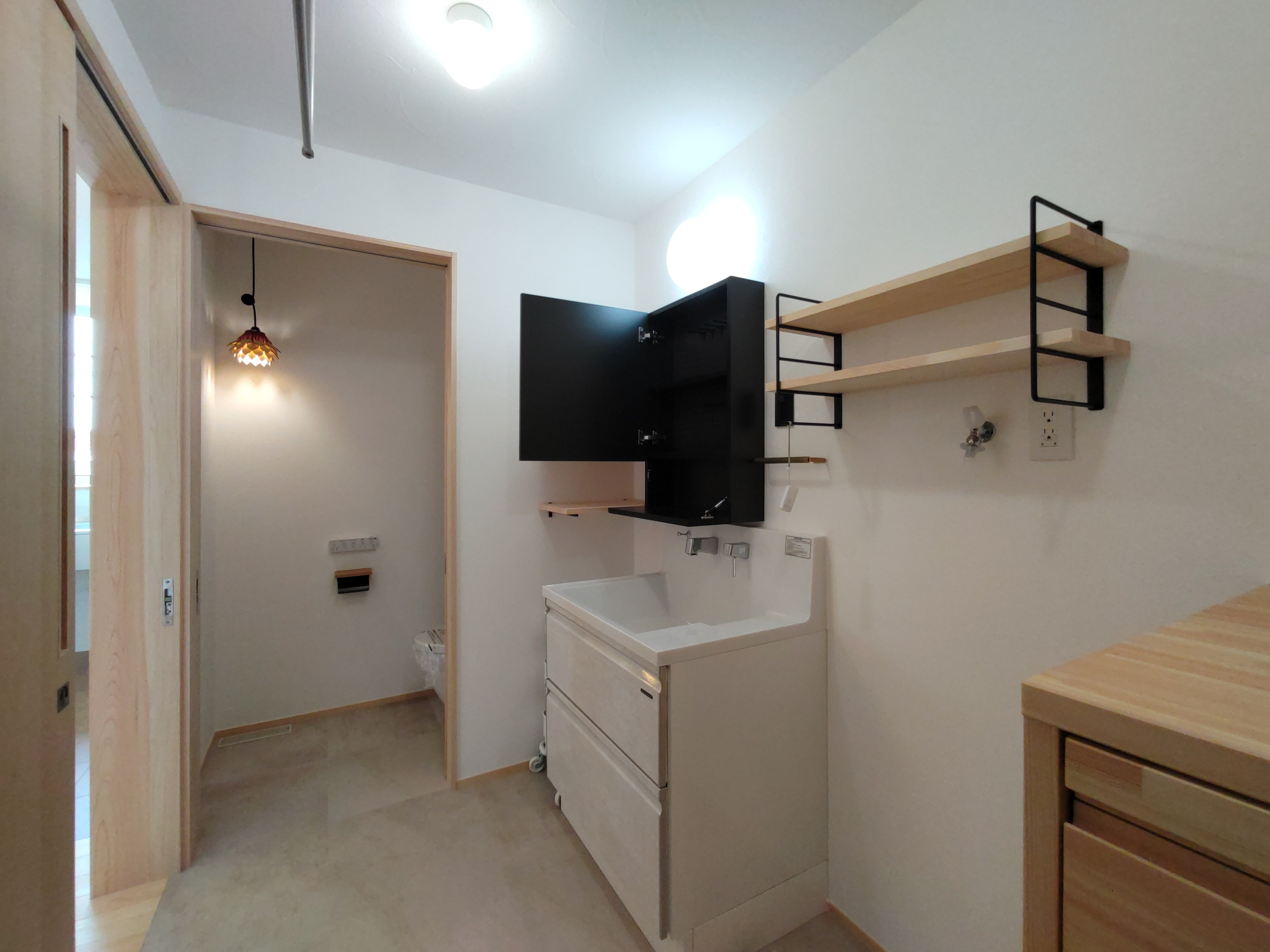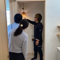 南世帯は照明器具取付やクリーニング工事が完了。翌日からの見学会の準備が整っています。各所に取付けられた器具のデザインとその配置にy様のセンスが光ります。ネットを駆使して各メーカーから厳選された器具を設置しています。
