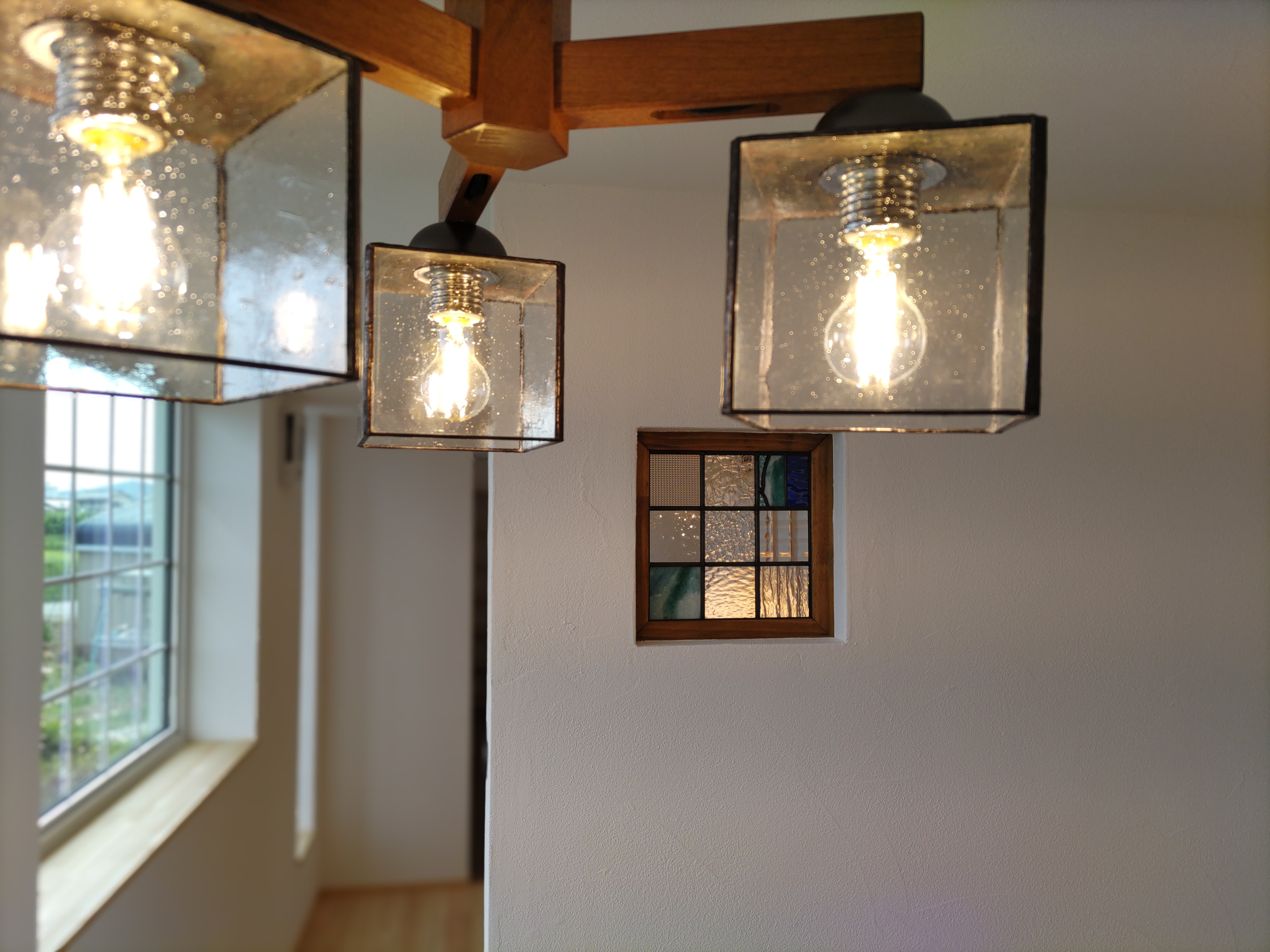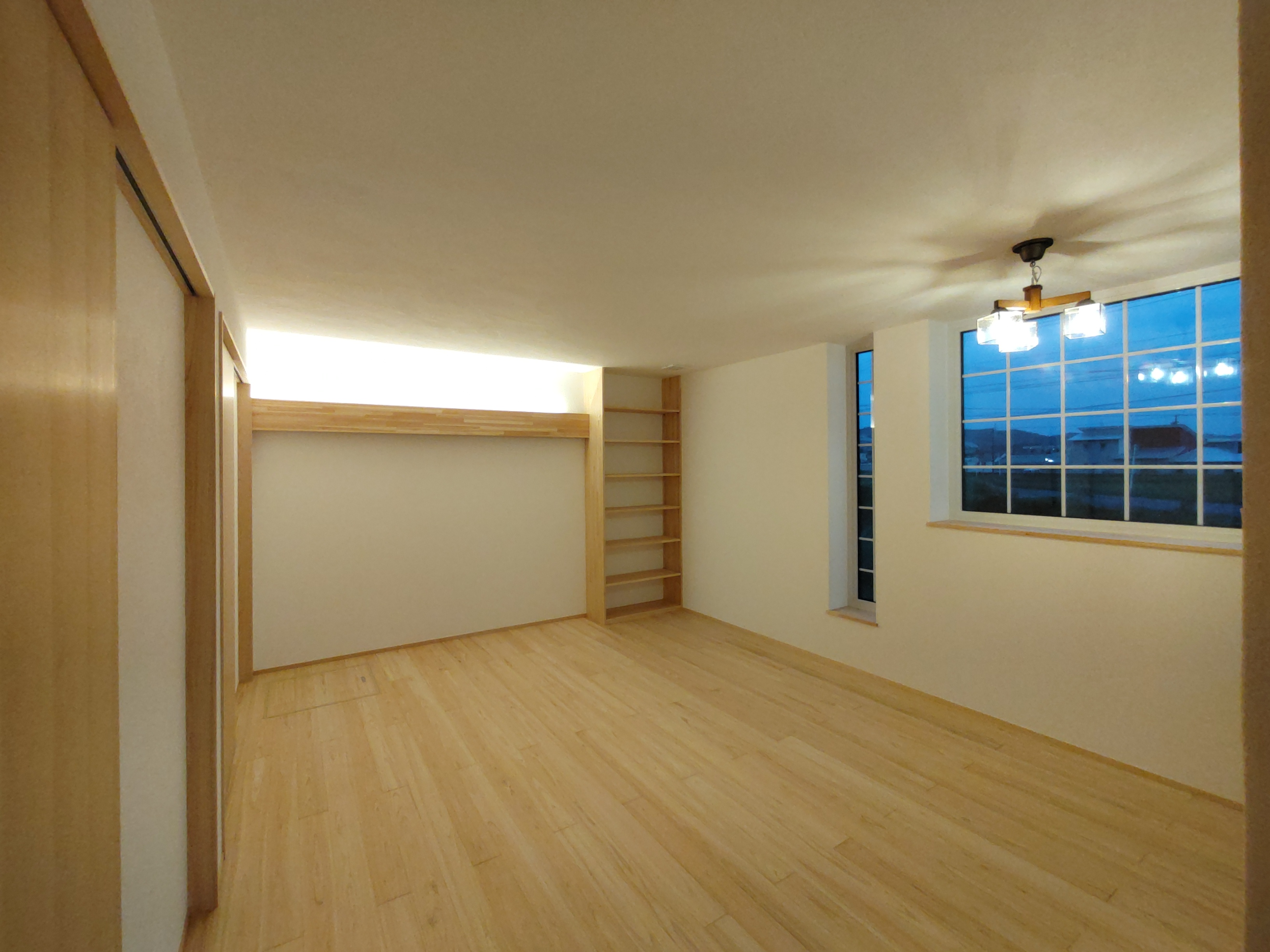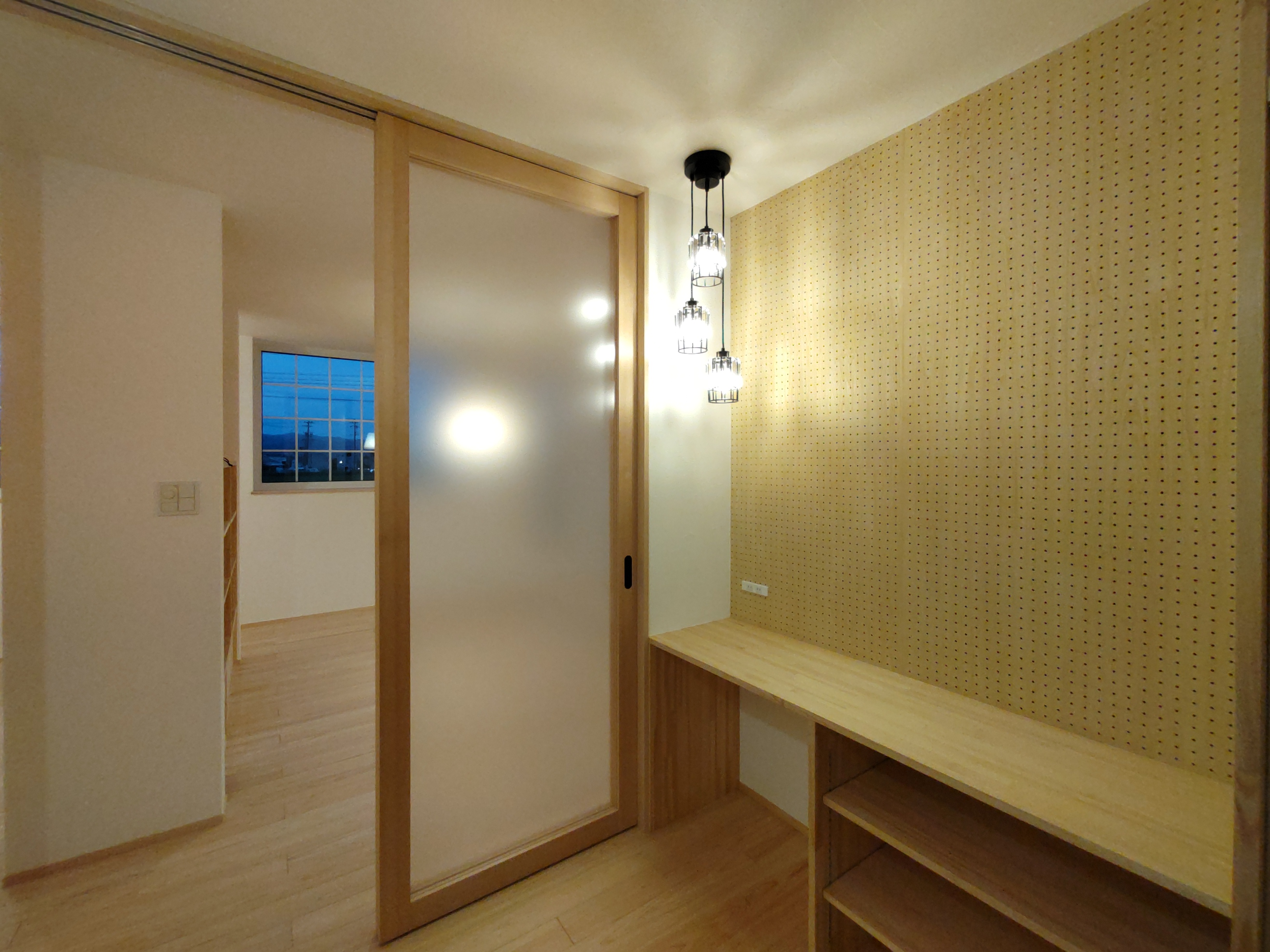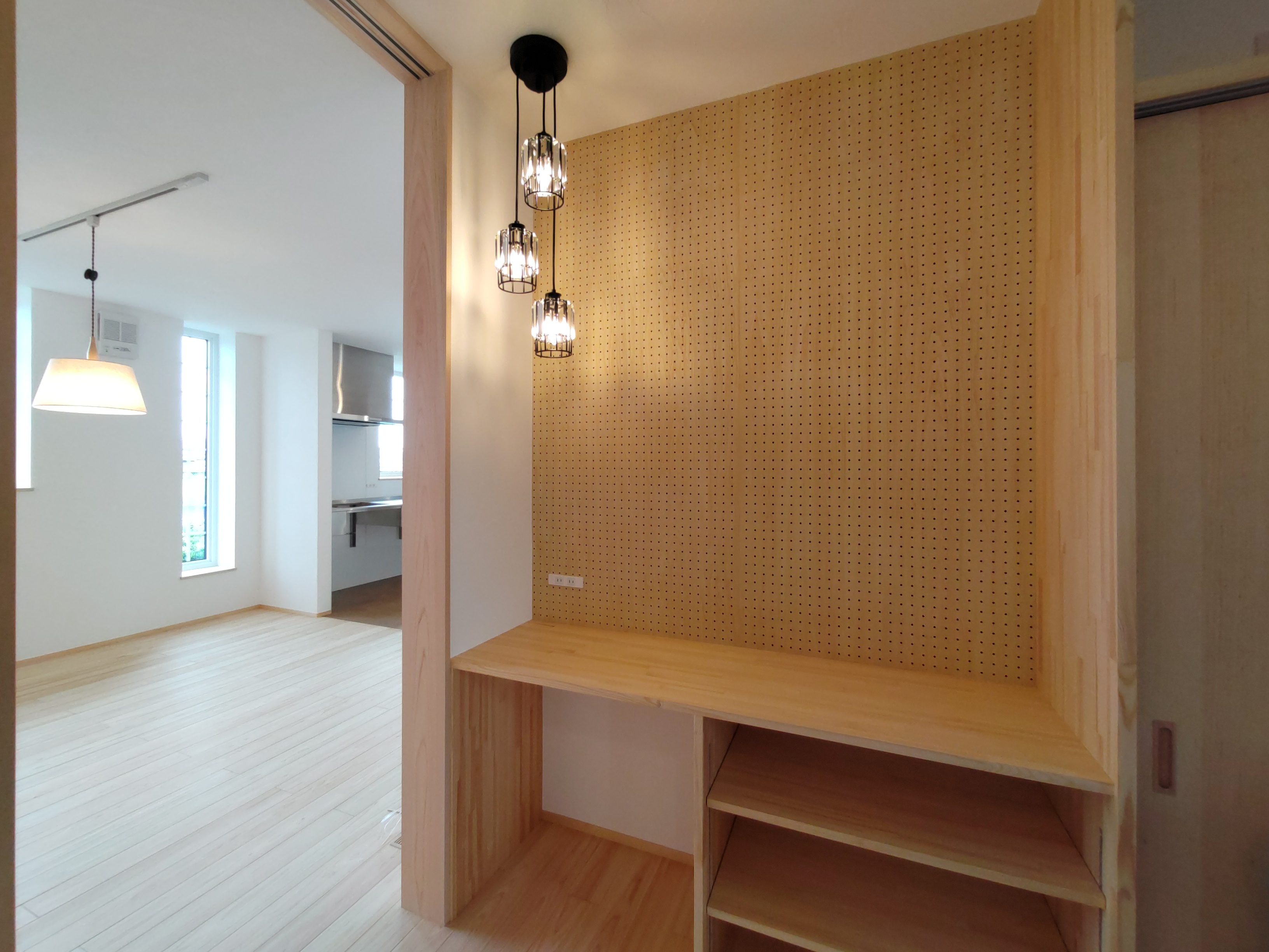 南世帯は照明器具取付やクリーニング工事が完了。翌日からの見学会の準備が整っています。各所に取付けられた器具のデザインとその配置にy様のセンスが光ります。ネットを駆使して各メーカーから厳選された器具を設置しています。