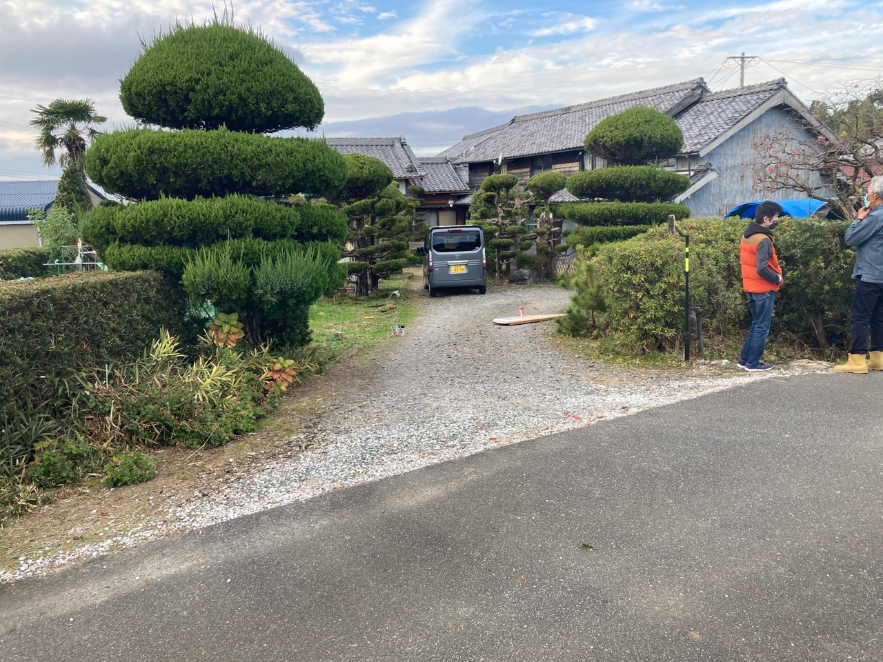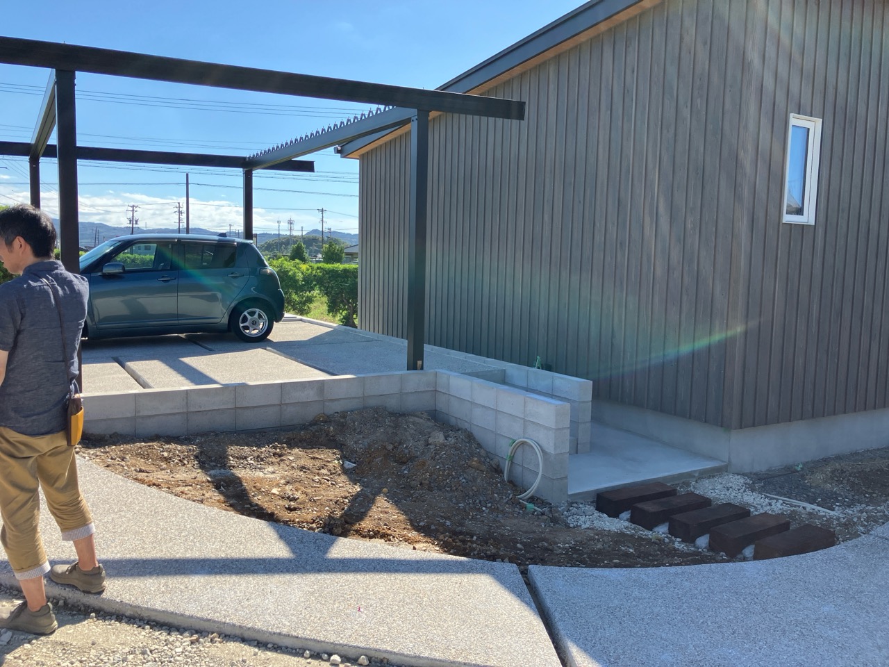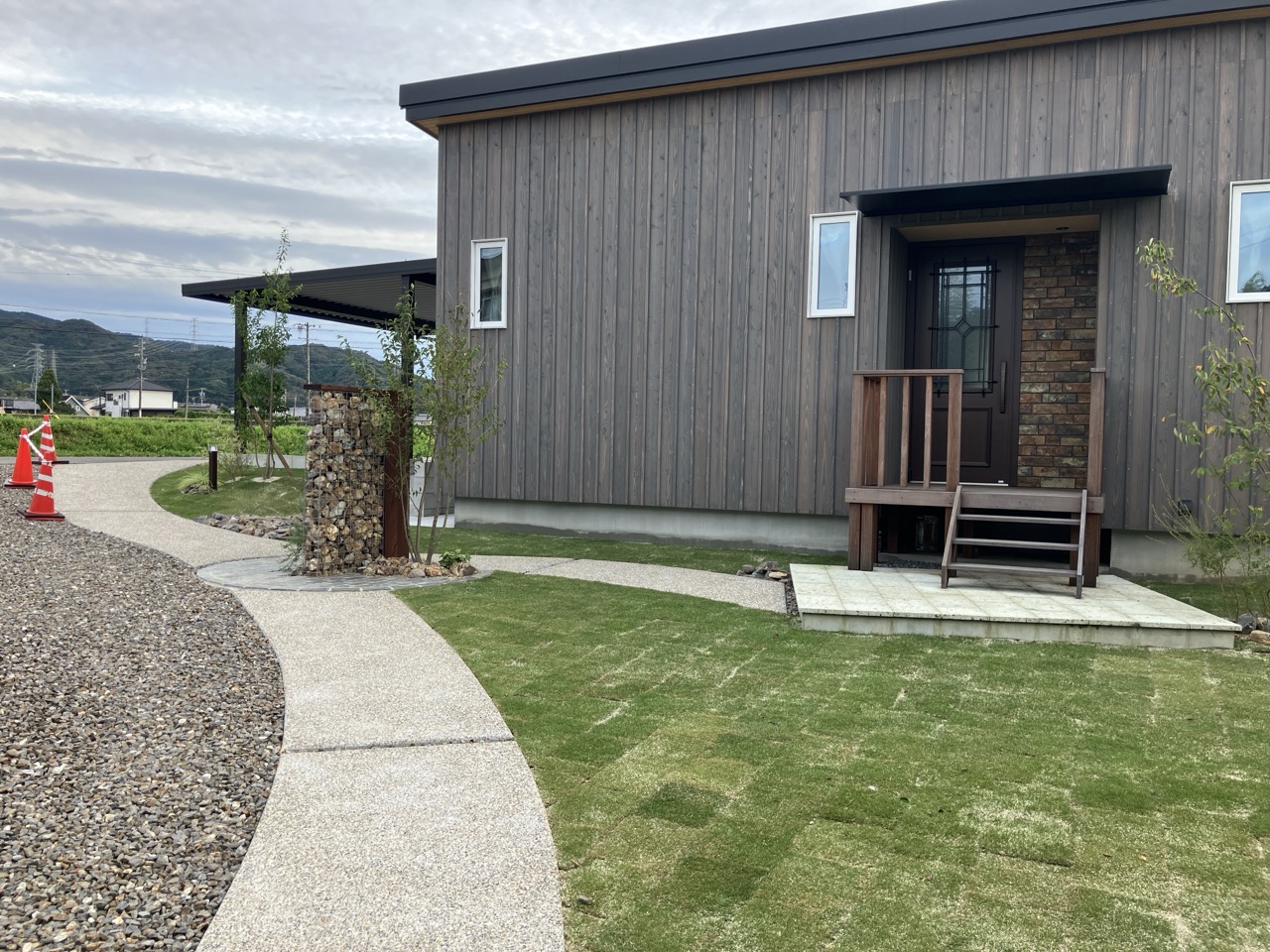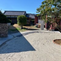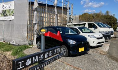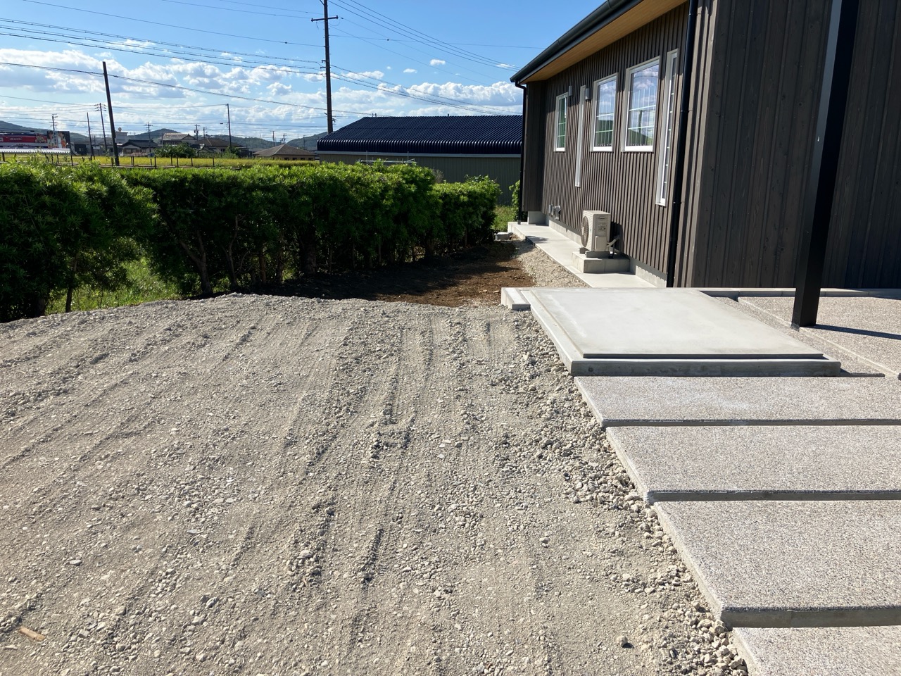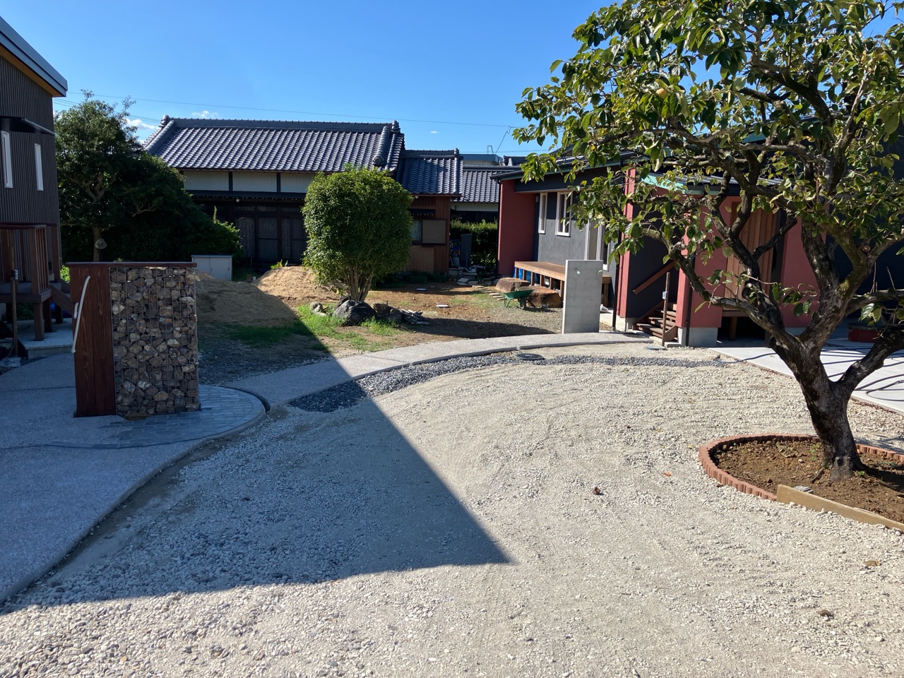 同じく幸田町で建築をご検討のお客様がみえるので、お打ち合せがてら外構工事の進み具合を見にやって来ました。アプローチや門柱があらかた完成していますので後は車路の砕石や植栽工事を残すのみとの事です。次回またお打ち合わせに来た時にどの辺りまで進んでいるか楽しみです。