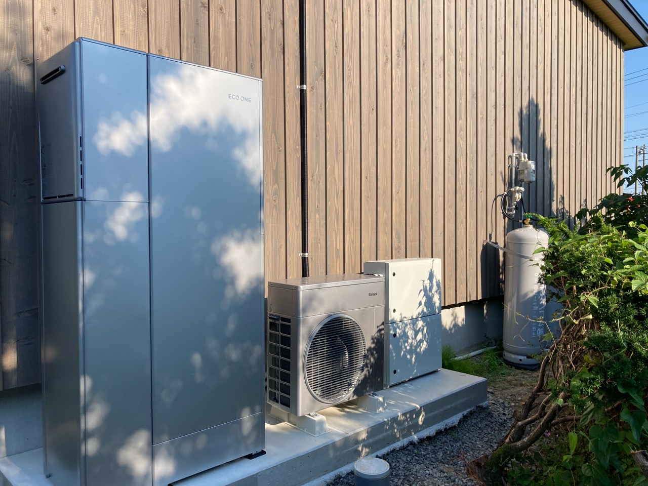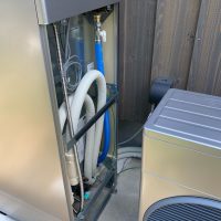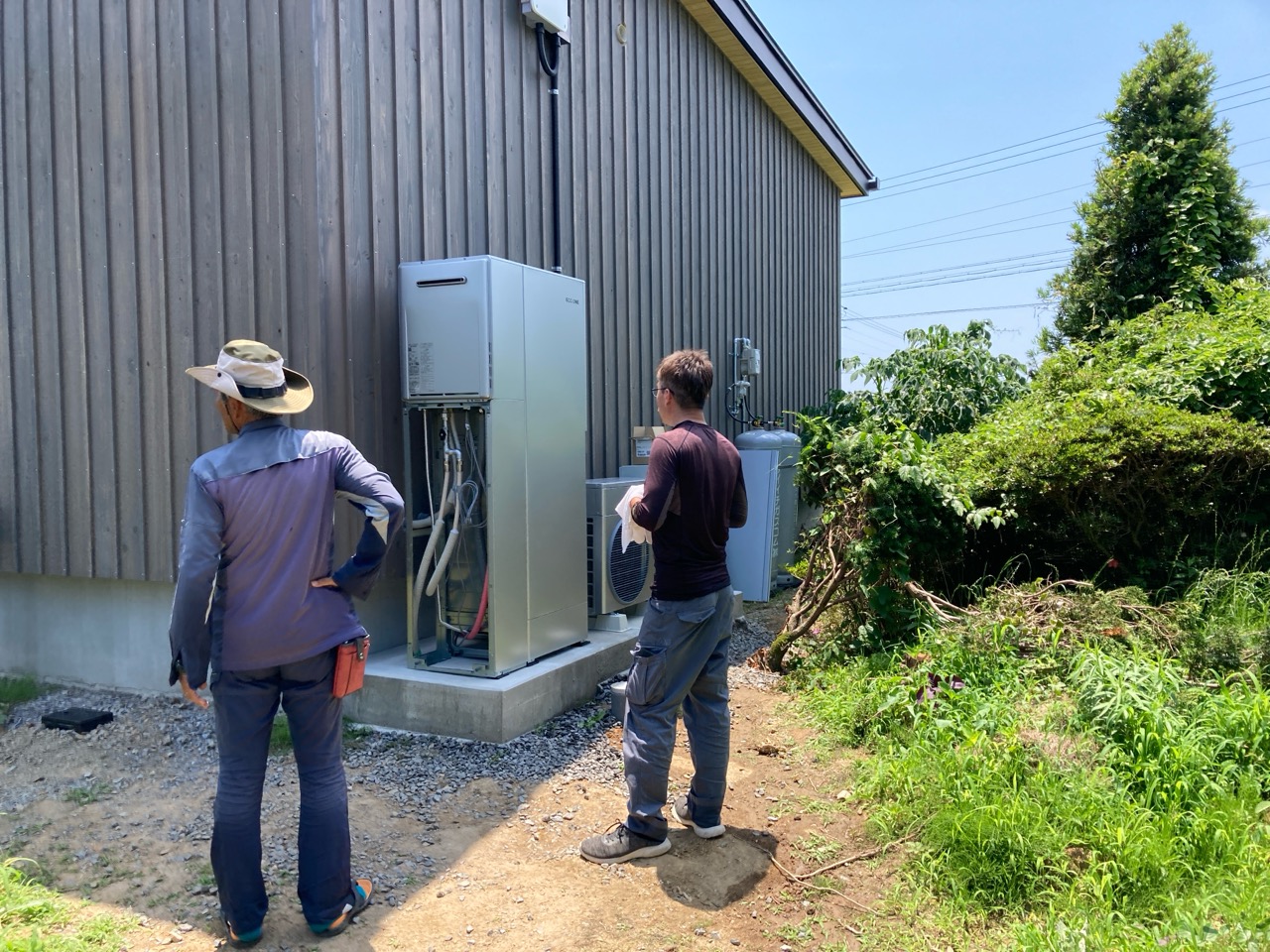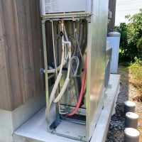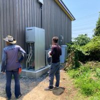 ガス業者さんと水道業者さんが給湯器の設置、接続を完了しました。南世帯に設置されるのはエコワンソーラー(写真には映っていませんが屋根にはしっかり太陽光パネルが載っています)。ガス業者さんにいろいろとお話をうかがいましたが、停電時など特に災害時に電力やお湯が供給される事に重きを置いたシステムです。