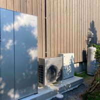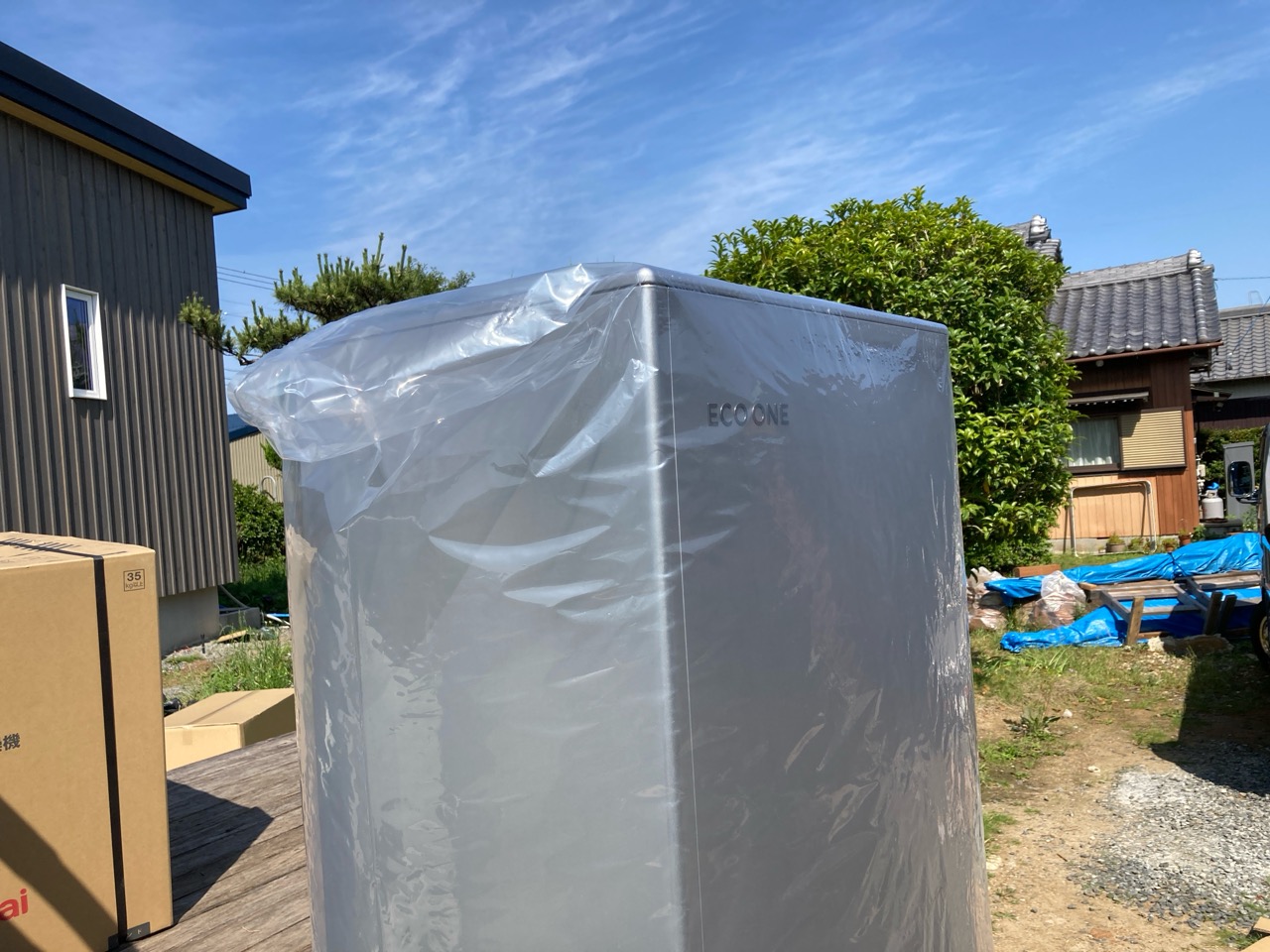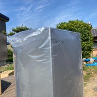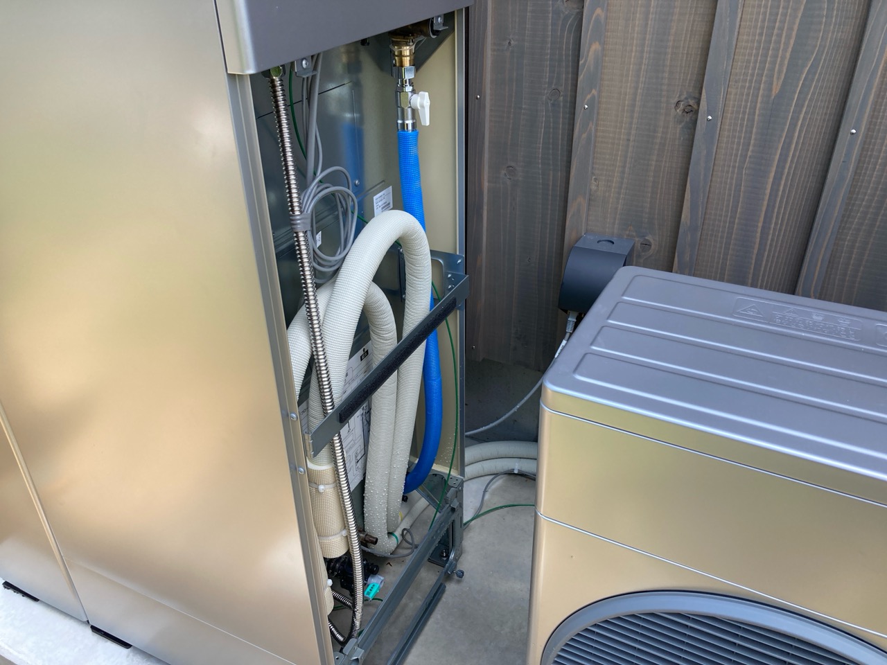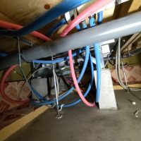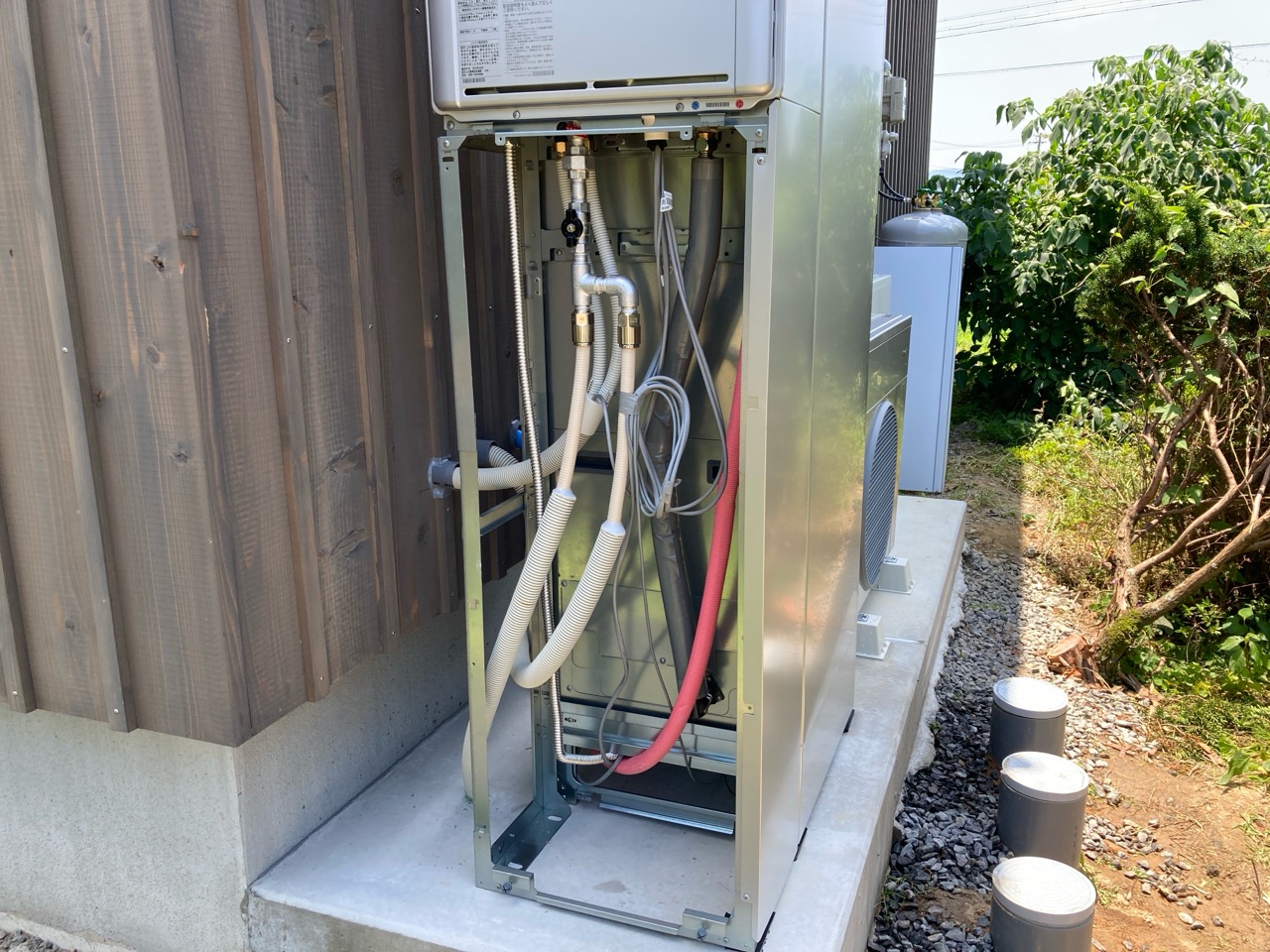 ガス業者さんと水道業者さんが給湯器の設置、接続を完了しました。南世帯に設置されるのはエコワンソーラー(写真には映っていませんが屋根にはしっかり太陽光パネルが載っています)。ガス業者さんにいろいろとお話をうかがいましたが、停電時など特に災害時に電力やお湯が供給される事に重きを置いたシステムです。