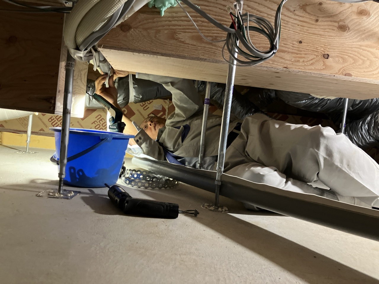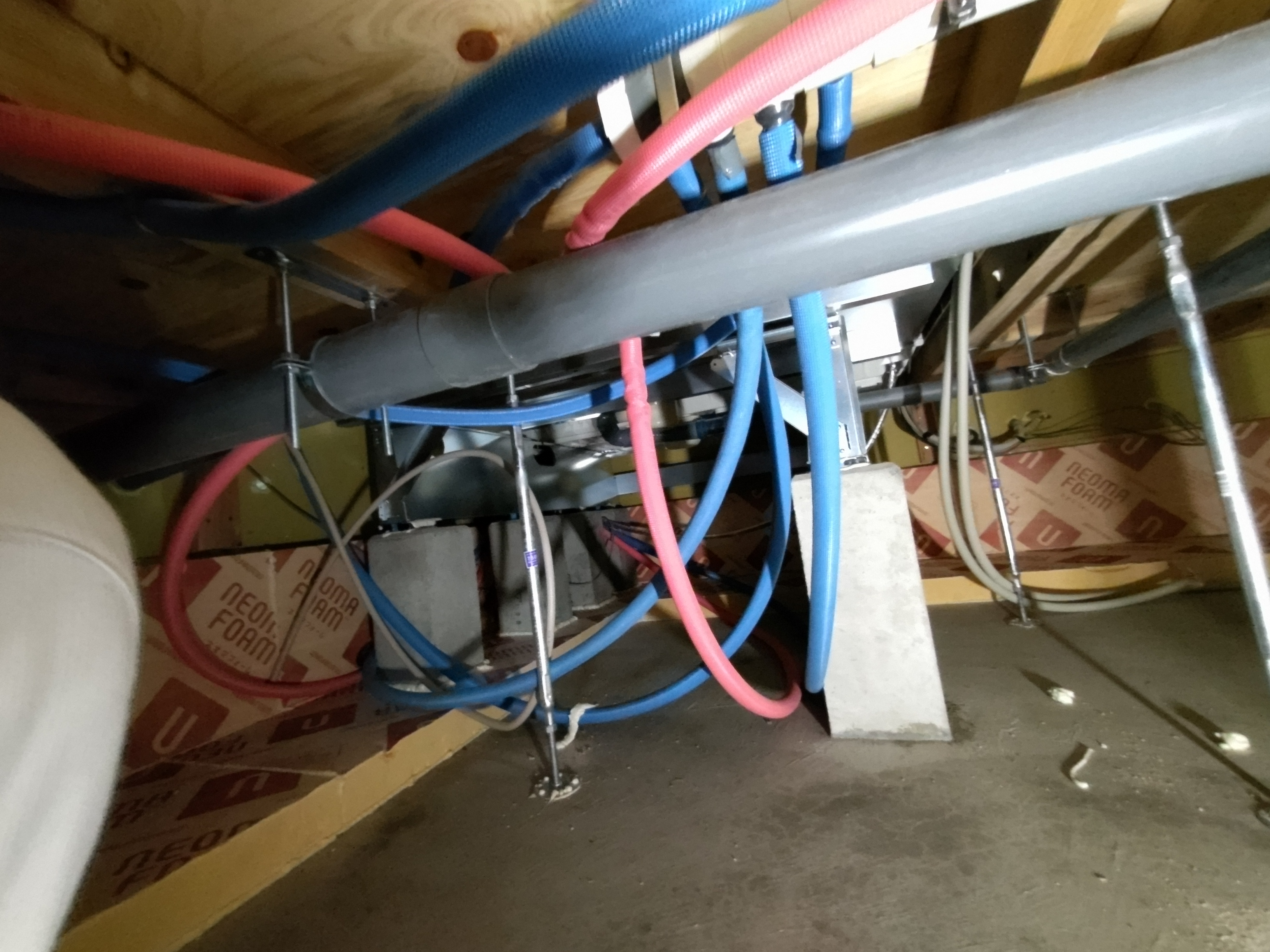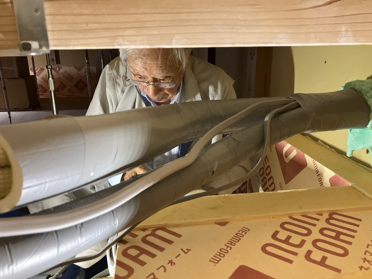 夏の間はエアコン業者さんが多忙&多忙による体調不良でできなかった床下配管の保温工事を行いました。年末も差し迫ろうかという時期となりましたが、業者さんの体調やスケジュールも調整でき、良い時期に行えます。