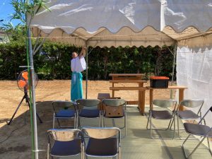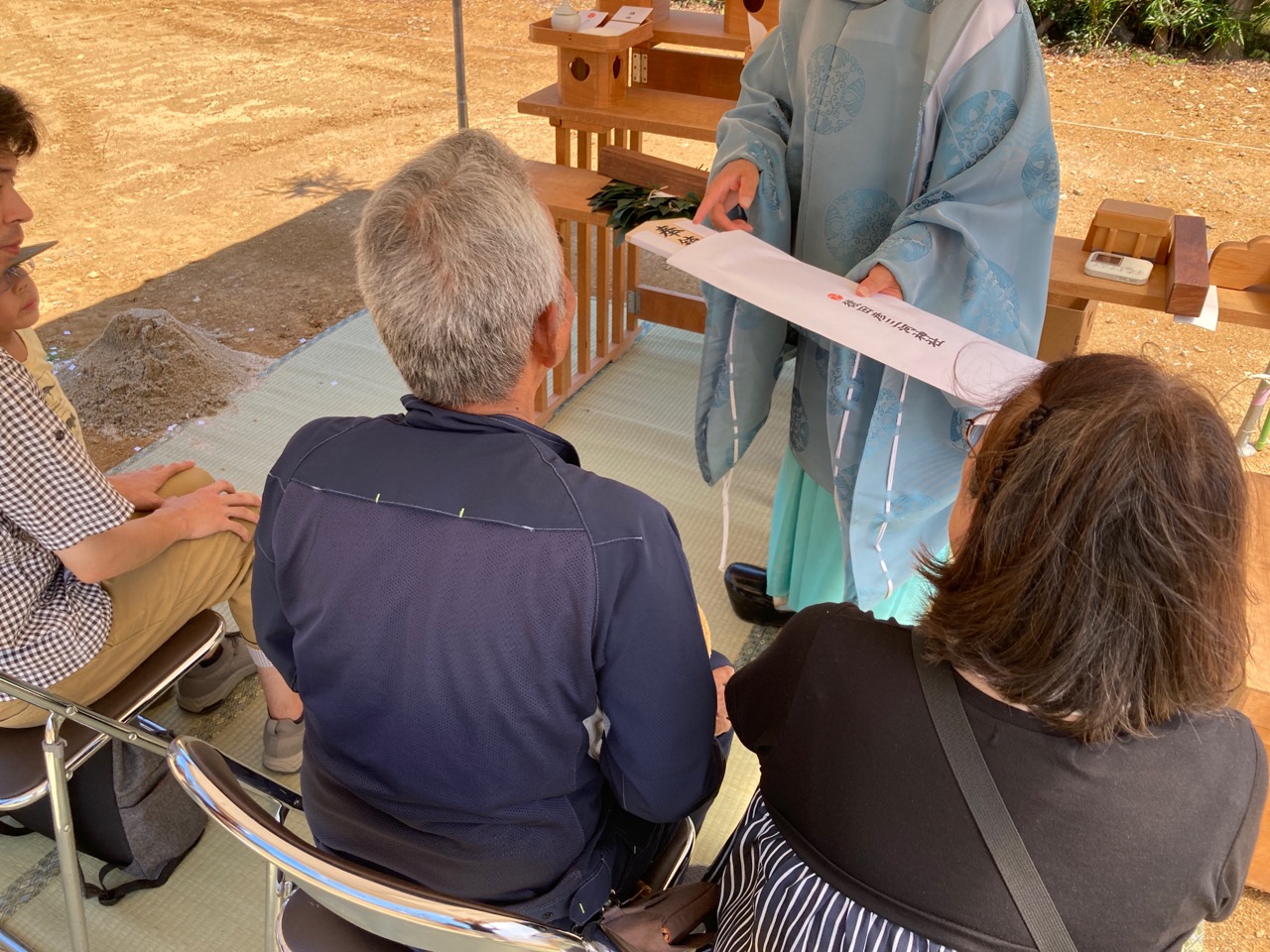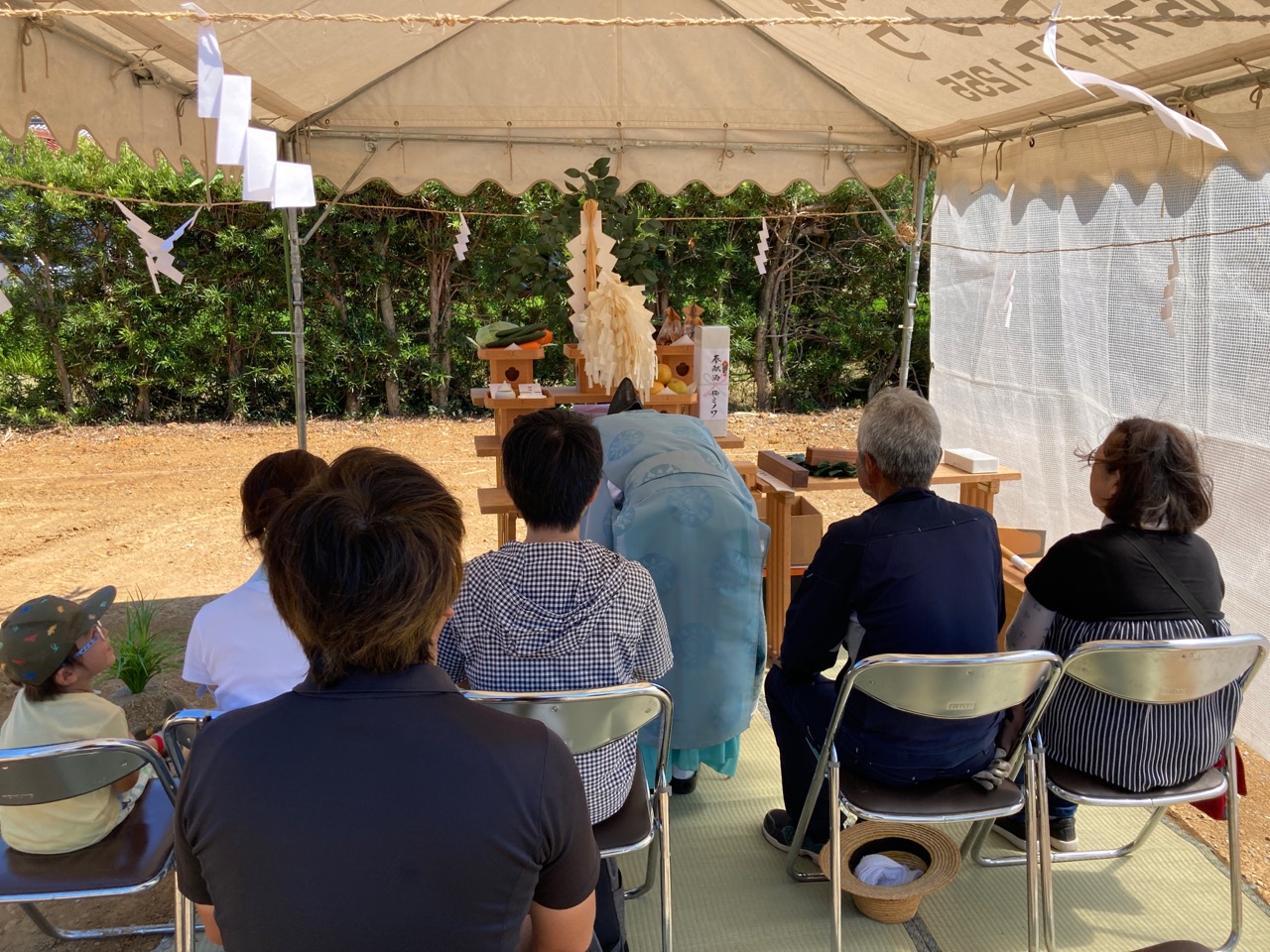 式典開始。それにしても神主さんの装束も暑そうです。いかに布一枚のテントとは言え日影があるだけで随分と過ごしやすさが違います。朝日を防ぐべく東側に取付けた半透明のシートも効果があったようです。