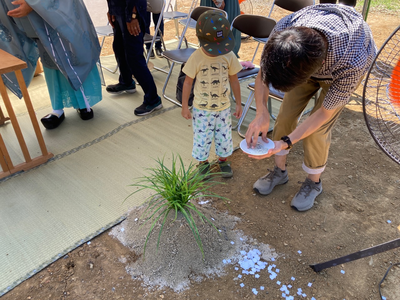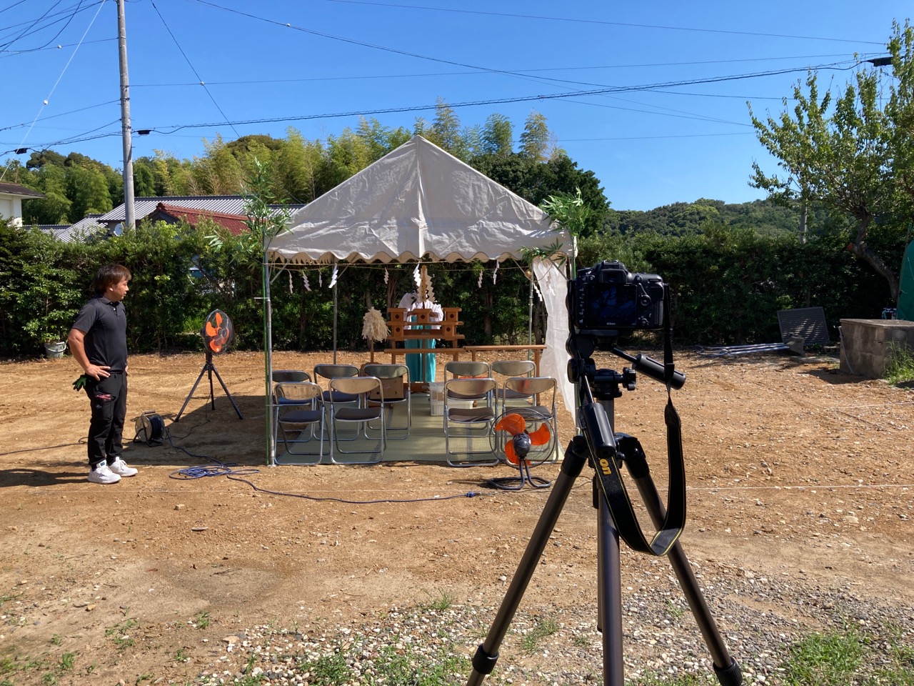 前夜の夕立ゲリラ豪雨のような天候で心配されましたが、本日は快晴(猛暑日)の午前に地鎮祭を執り行いました。高速を突っ走る事約1時間半、現地でお父様に聞くところによると、こちらの地方は昨晩はポツリとも降らなかったようです。 朝からテント設営に汗だくになりました。こういう時に現場用大型扇風機が最大の威力を発揮します。