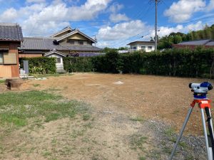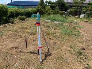 続いて南世帯の位置出し。こちらこそ境界杭はあるものの、高低差や既存の生け垣等に遮られ、なかなか正確な位置が割り出せません。こういった時に絶大な威力を発揮するのがトランシット。基準となる1点あるいは2点を割り出す事ができれば、正確な角度を計測する事ができます。今回はまだ位置出しですので数ミリの誤差は許容範囲内ですが、基礎工事の丁張り作業の際に再び出番がやって来ます。