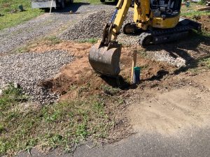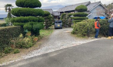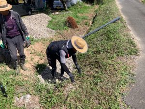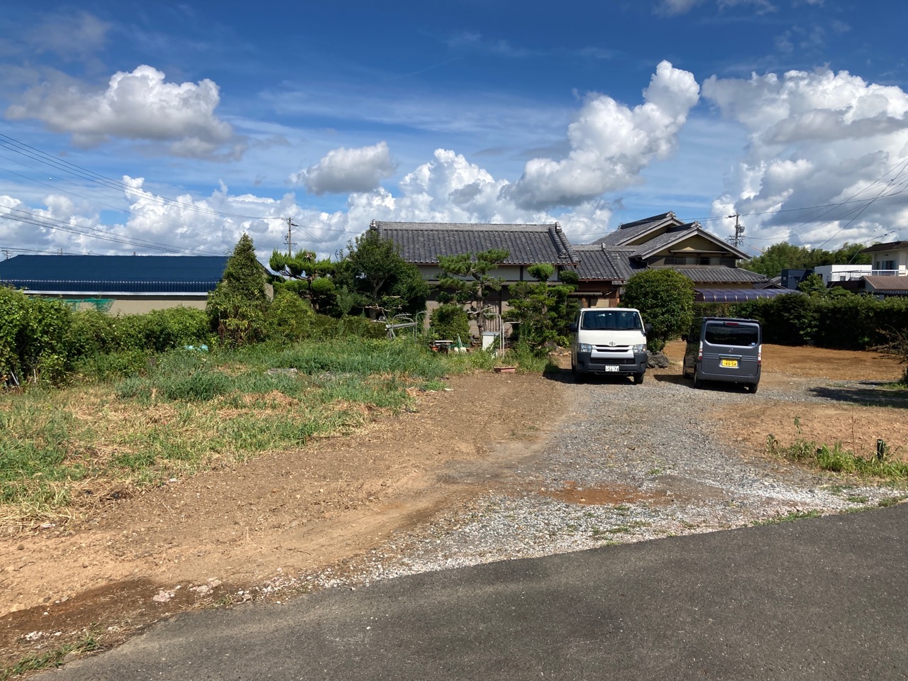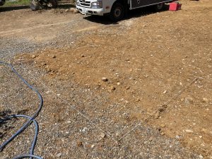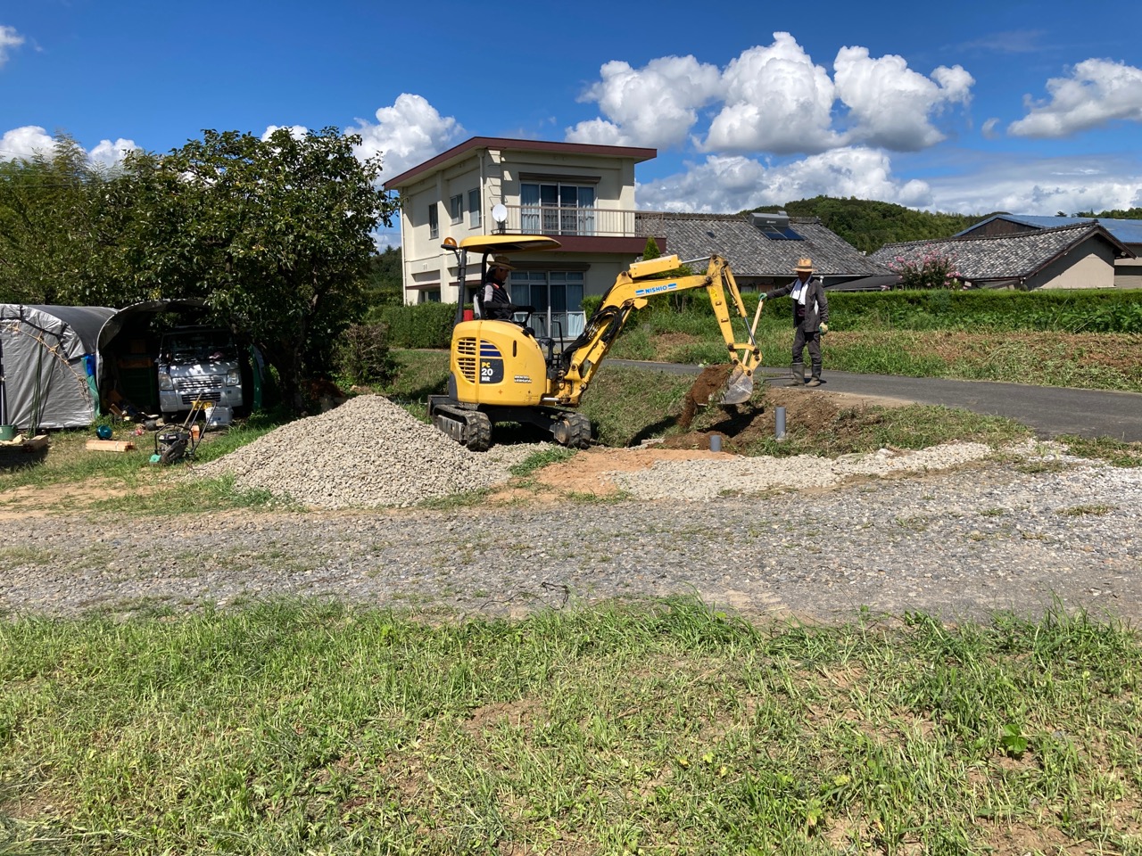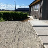 丁張り作業と並行して基礎のt広さんによって乗入口の拡張工事も行います。道路からレベル差のある敷地内に車両を乗り入れる際に砂利道の坂となっていますが、その乗入口に2棟あるうちの一棟の建物がかかり、車両の通行する幅が無くなるので、道路との境界にある溝を砕石で埋め、新たに坂道を広げる計画です。