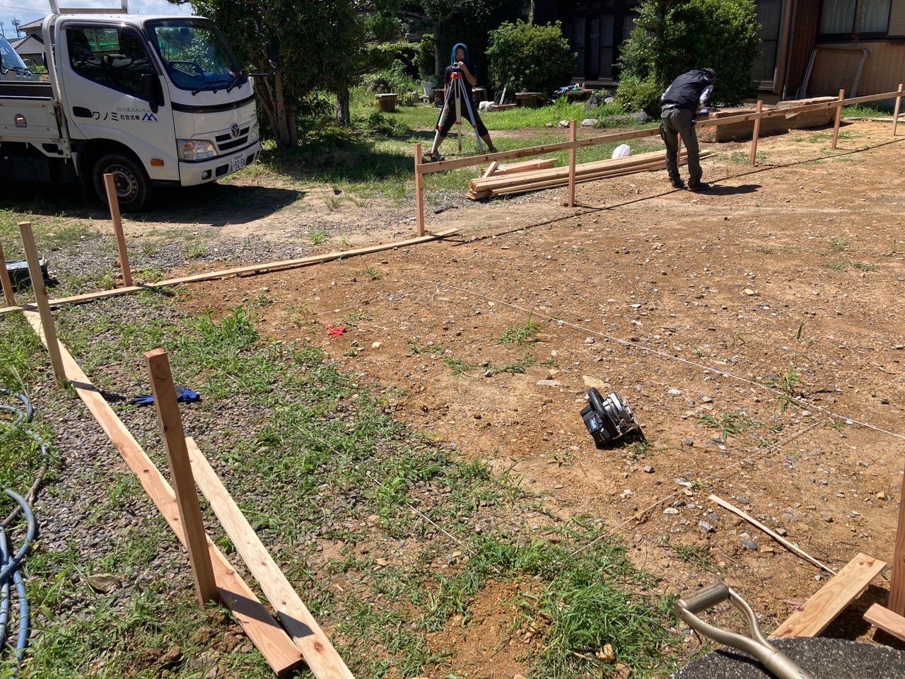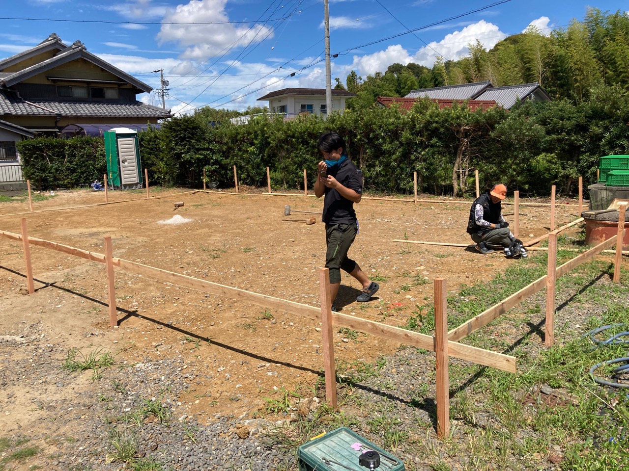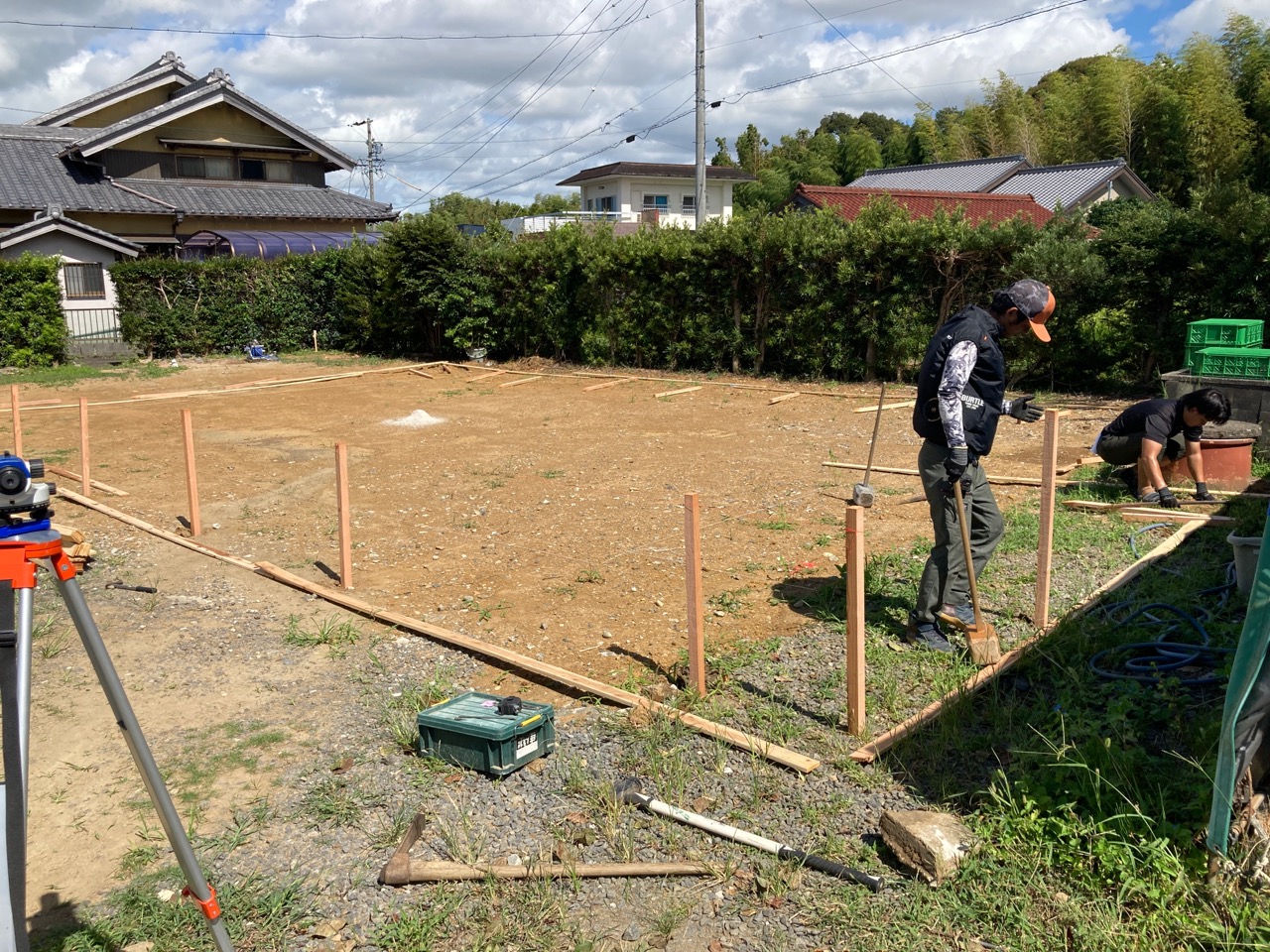 基礎の丁張り作業にやって来ました。今回は建物が2棟ありますので、丁張り作業も2回。加えて一部敷地の造成も行う必要がありますので、人数を集めて4人がかりで取り掛かります。