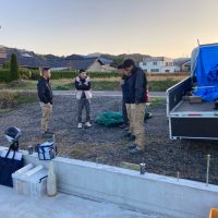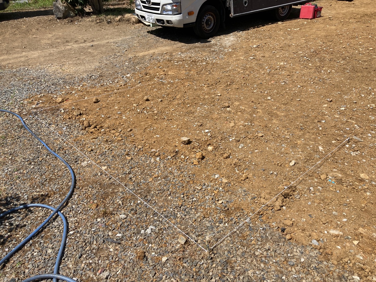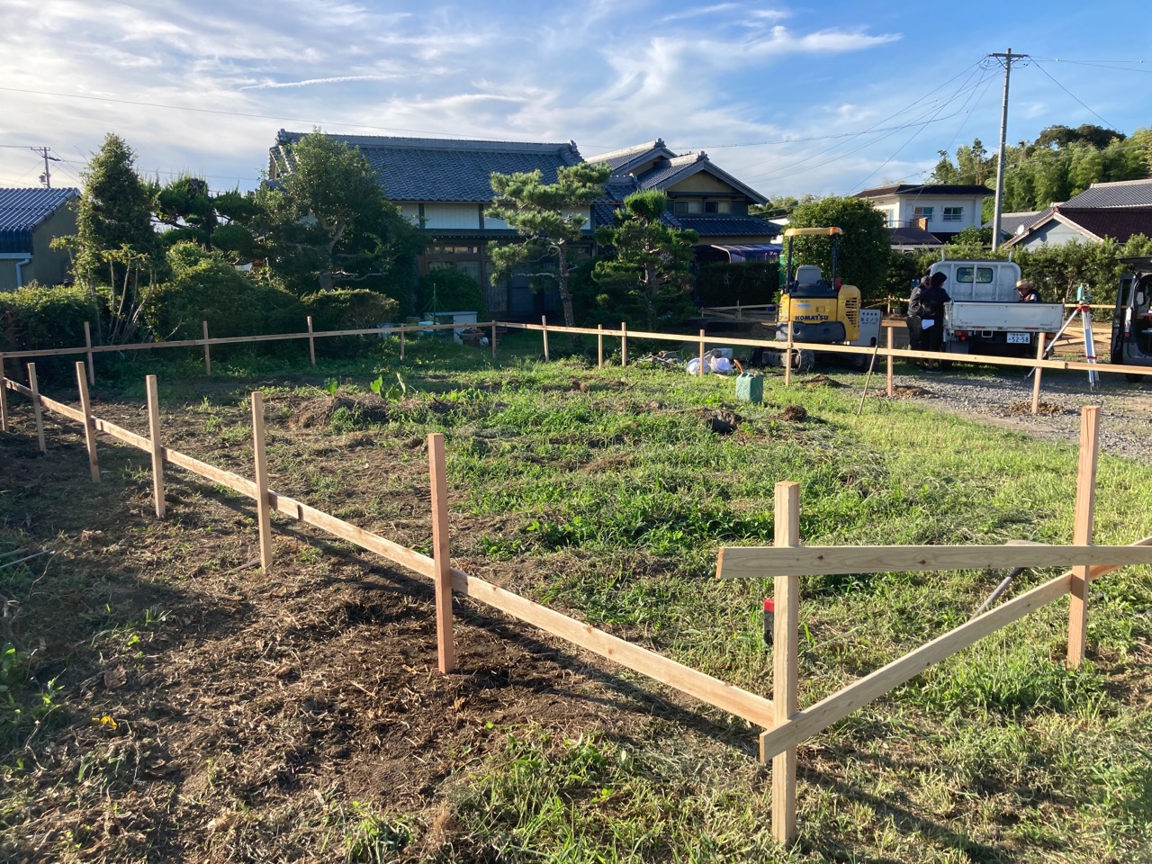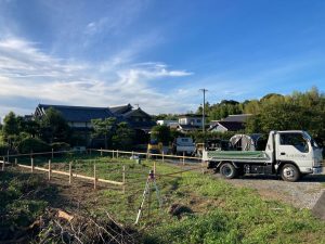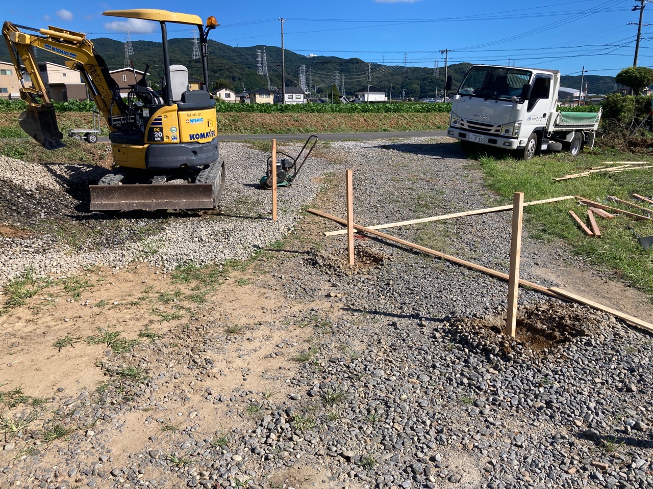 基礎の丁張り作業にやって来ました。今回は建物が2棟ありますので、丁張り作業も2回。加えて一部敷地の造成も行う必要がありますので、人数を集めて4人がかりで取り掛かります。