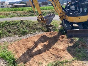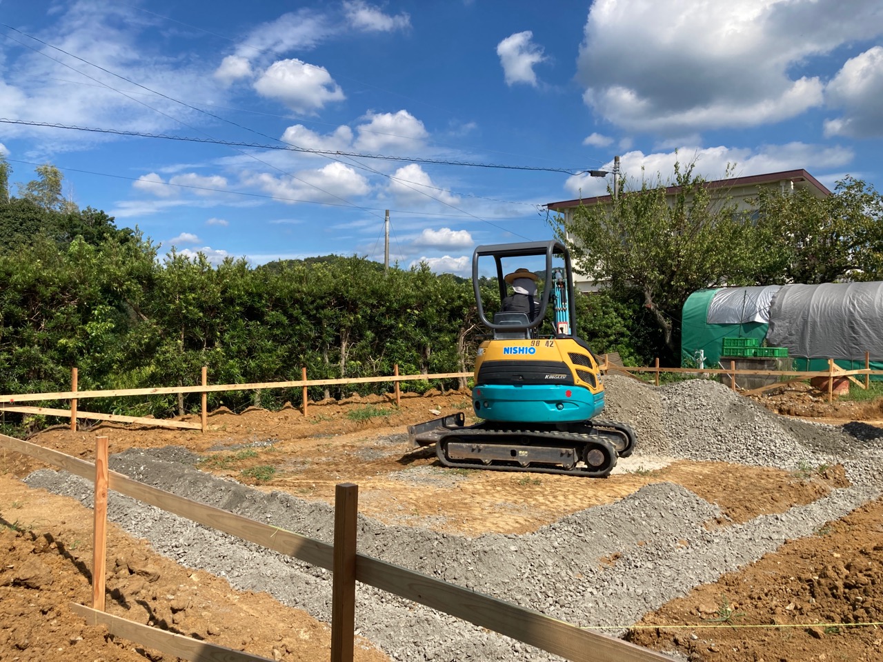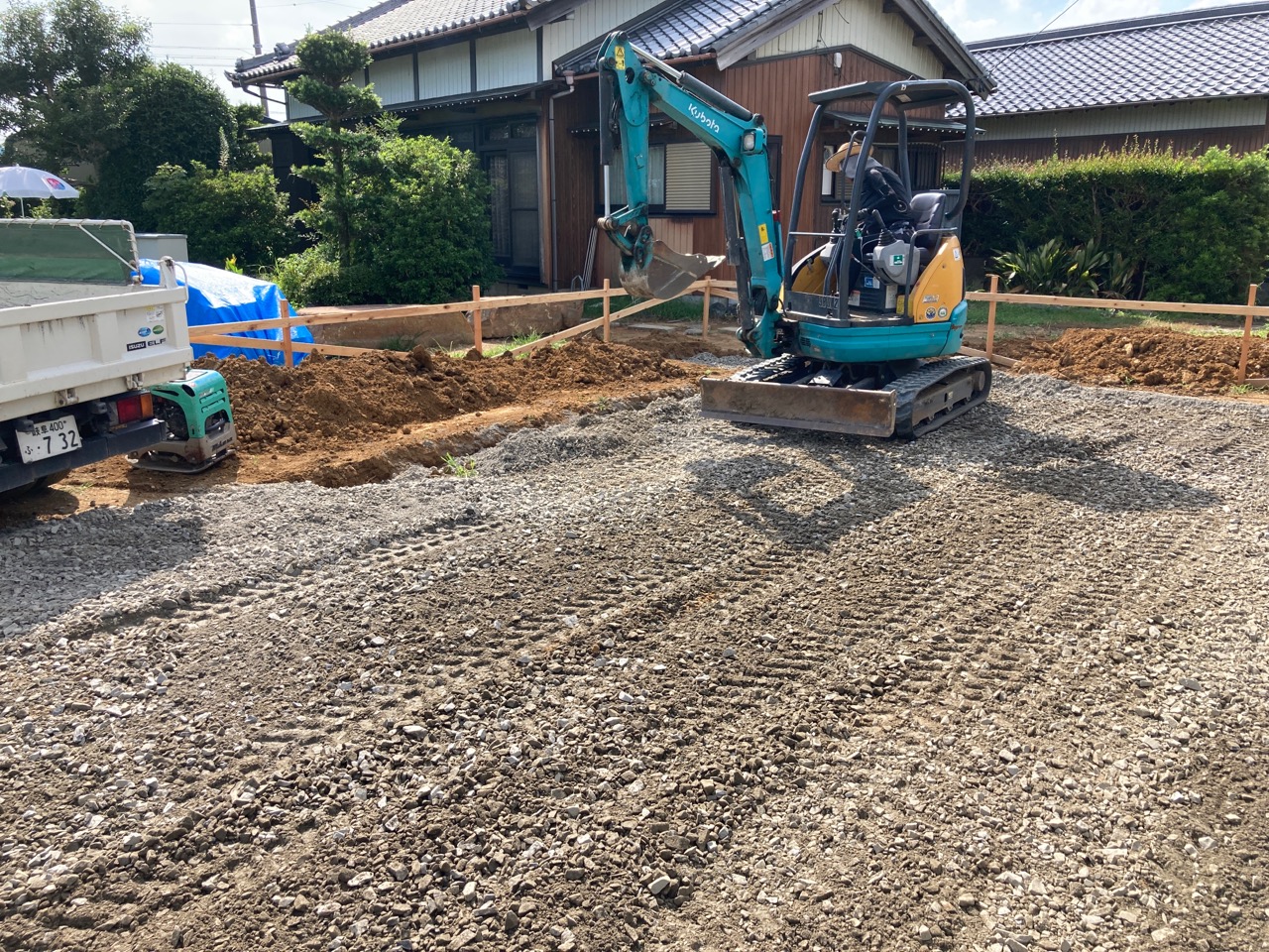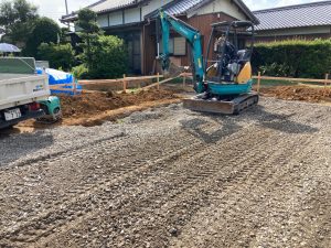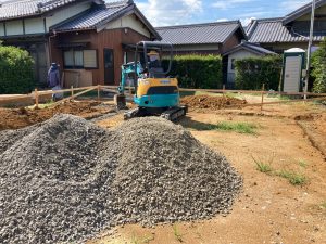 重機で整地した地盤の上に砕石を敷いていきます。今回は設計士さんの設計した基礎により、建物内周には地中梁がありませんので重機の移動や砕石敷作業がスムーズです。なぜ構造的に内周に地中梁が要らないかはもう少し後になったら分かります。