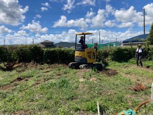南棟の丁張り作業に入りました。丁張りの杭が従来の車路をほぼ塞いでいる様子が写真でわかりますでしょうか。南棟のほとんどが元々畑であった部分にかかりますので、杭を打ち込むのにそれほど力は要りませんが、車路にかかっている部分は長年車で表層が踏み固められているので、人の力で打ち込むのはなかなか困難。こういう時にも重機で表層だけ掘れば、後は楽に打ち込む事ができます。ここでも重機が大活躍です。重機のバケットで杭を押し込む、など少々力業も使いました。