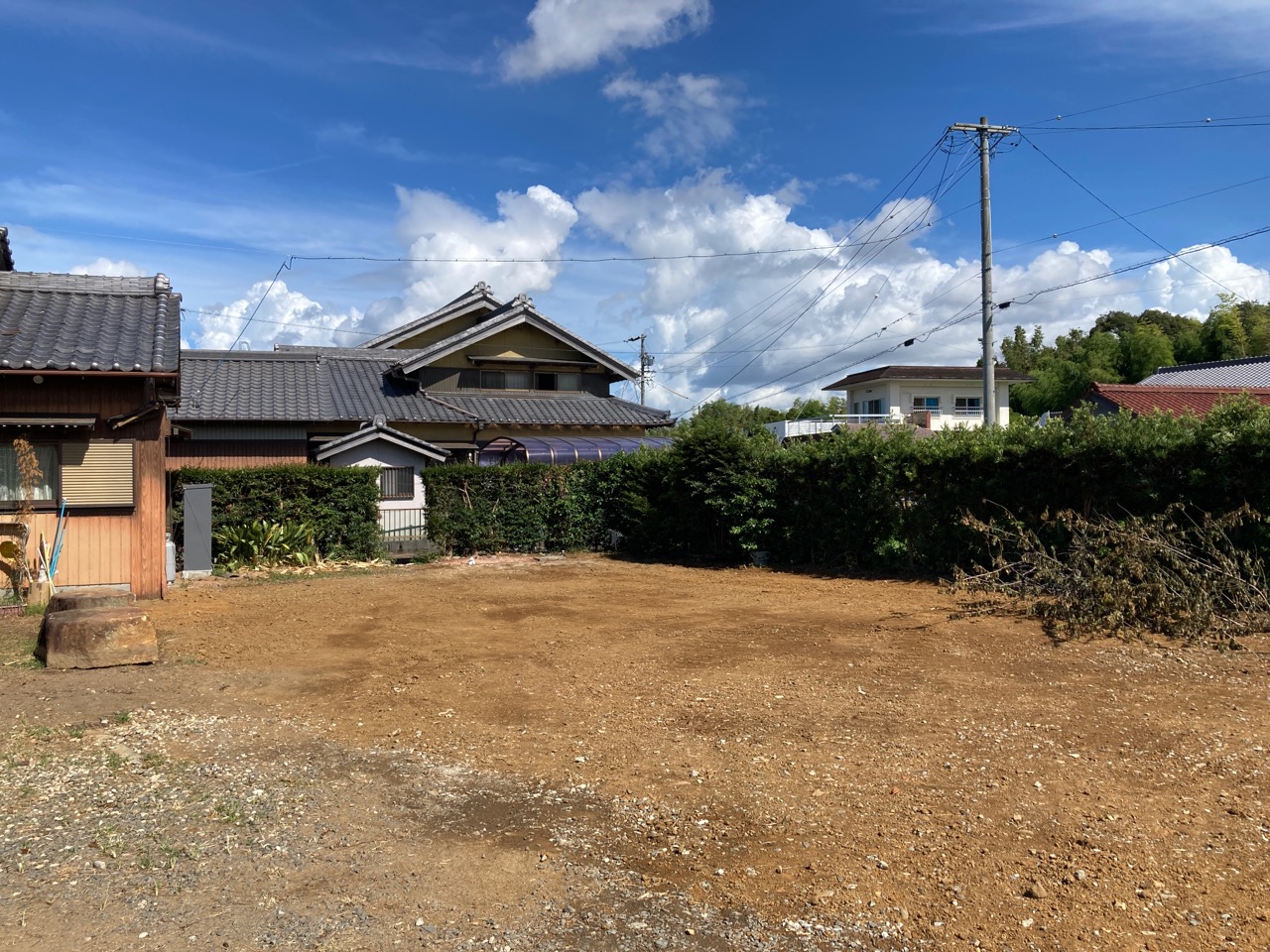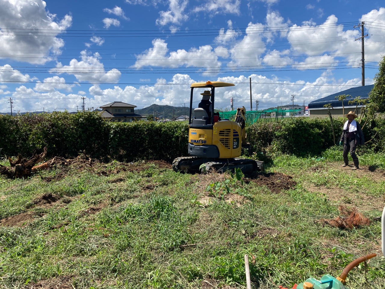 南棟の南西角は一部生垣にかかりますので、こちらも重機で伐採、伐根。