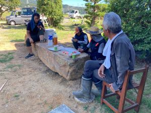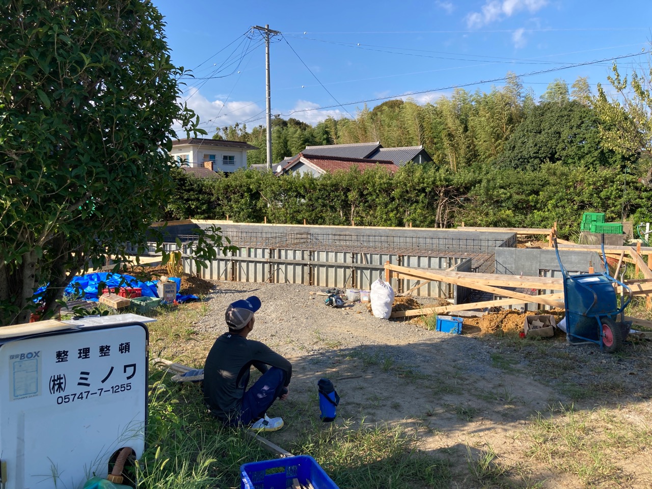 木陰で休憩中のk保木棟梁。土台伏せの日まで時間ができましたので基礎工事の手伝いに来ています。若手の棟梁が木造の仕事だけでなく、機があればその他の構造がどのようにできているのかを体感するのは研修としては良い経験ではないかと思います。