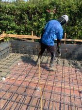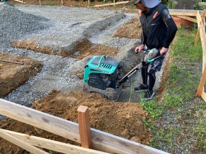 整地した砕石を重機のキャタピラで敷き均し、さらにランマーで転圧を掛けます。こうして締め固める事で鉄筋組作業時などに重量で沈下が無いようになります。
