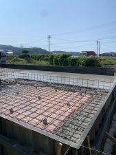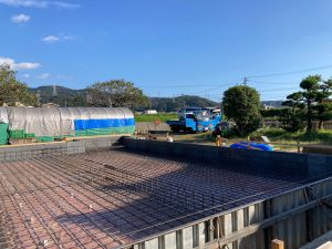 すっかり配筋工事も終わっていますので本日は配筋検査にやって来ました。地業工事をしていた先週と比べ、だいぶ涼しい風が吹くような季節になってきました。とは言え本日のような晴天の日はまだまだ暑い中での作業となります。