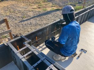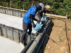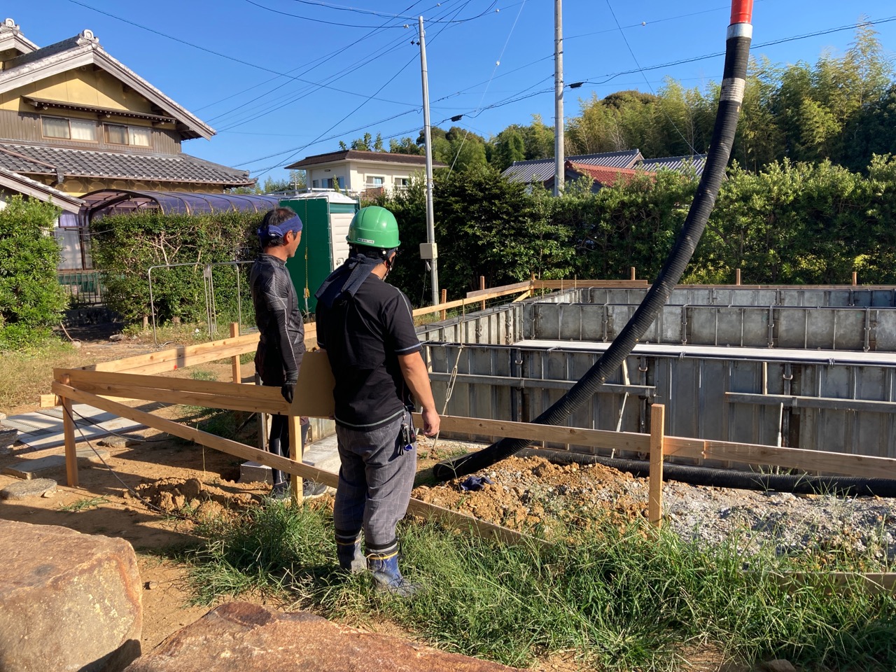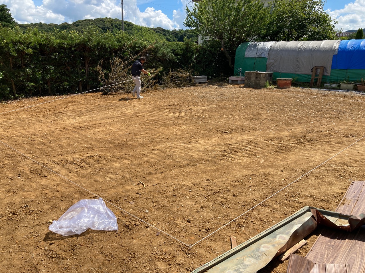 まだまだ暑さの続くこの夏、熱中症に気を付けて木陰で水分補給をしながら作業は続き、2灯のうち北棟の丁張りが進んでいます。