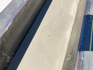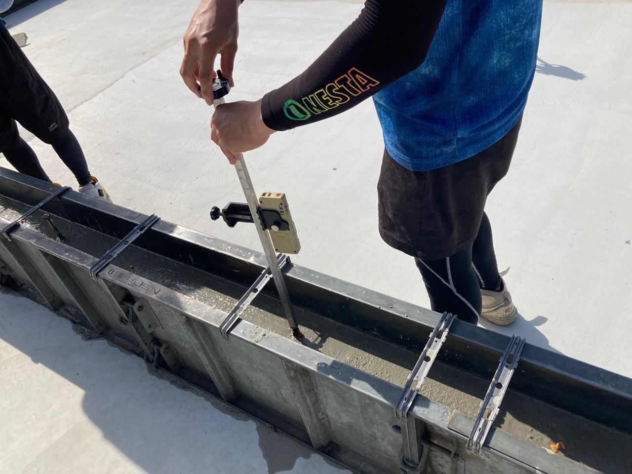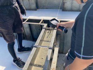 南世帯もコンクリート温度をチェック。南世帯は遮る物が無く、鋼製型枠は日が昇ってから打設までの時間、10月ながら強烈な日にさらされていました。コンクリ打設直後の日向のコンクリートと型枠でわずかに日影になる部分のコンクリートの温度がすでに10℃の違いがあったのには驚きです。
