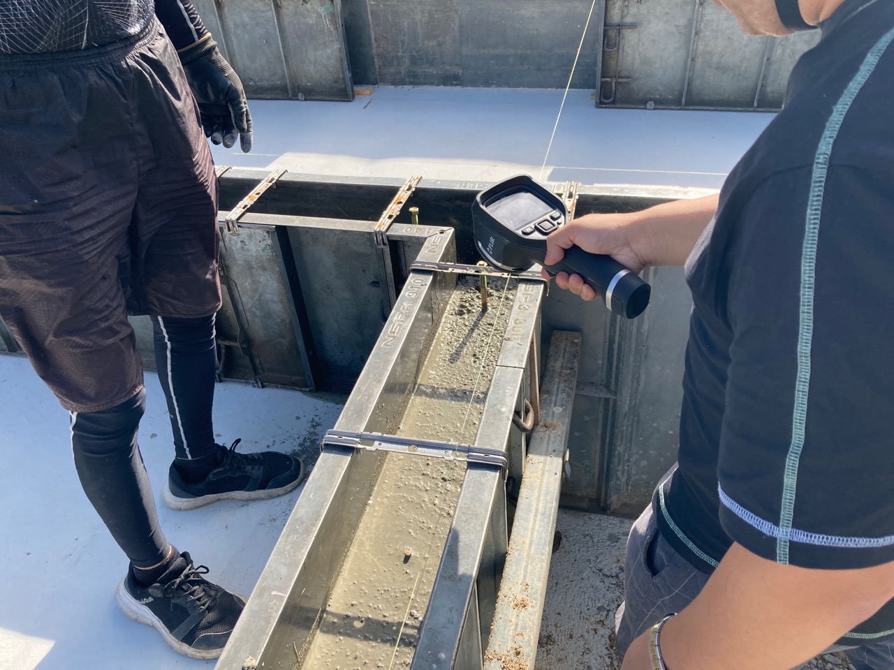 k長先生が取い出しましたるひみつ道具のサーモカメラ。午前中の日射に照らされた鋼製型枠から受けるコンクリート温度の影響を考慮して、コールドジョイントを避けるため打継箇所、打継時間を管理しています。